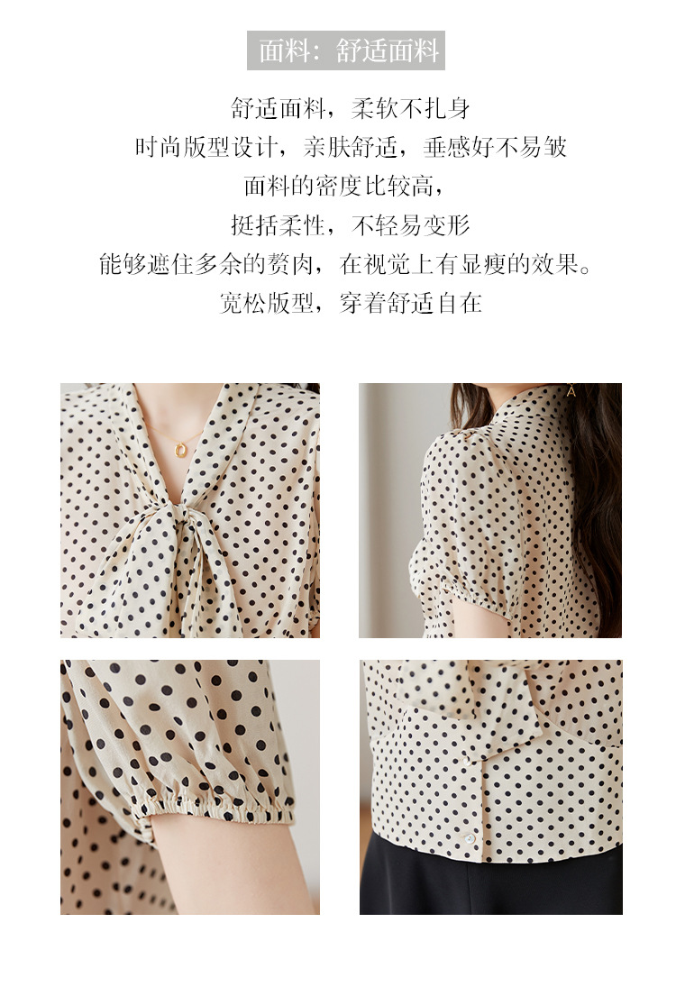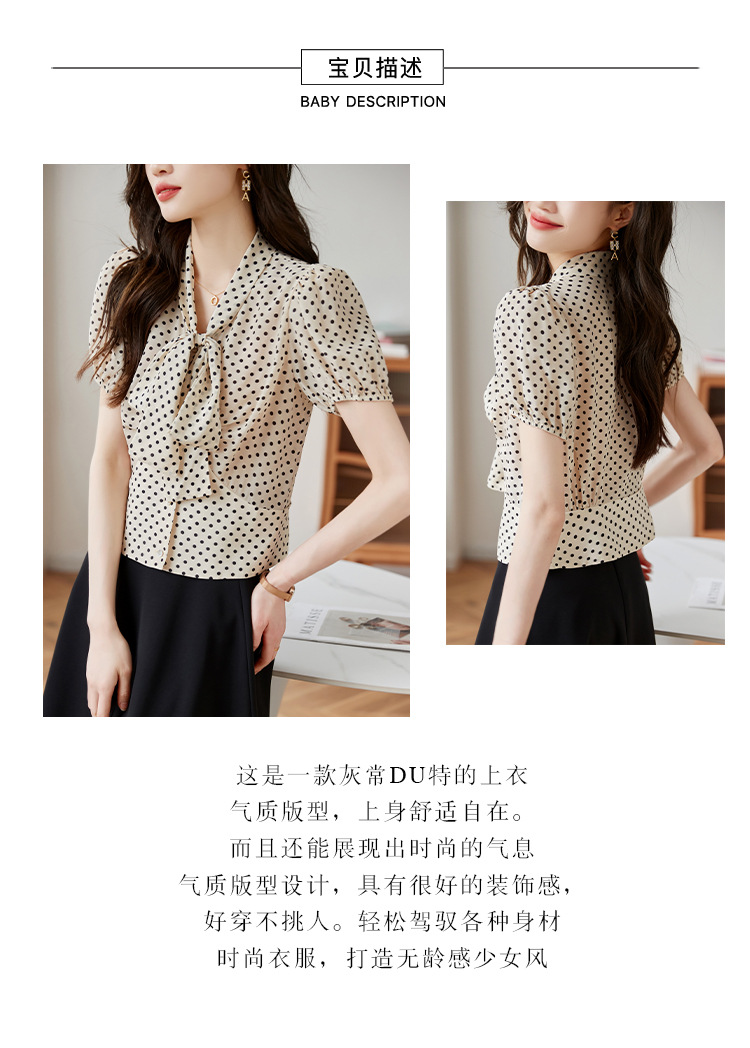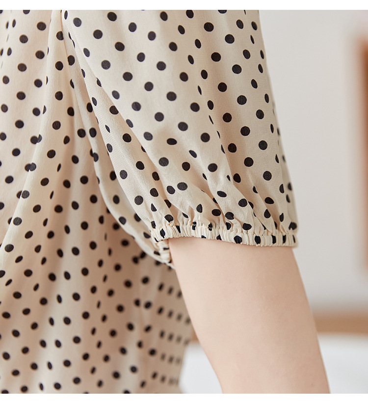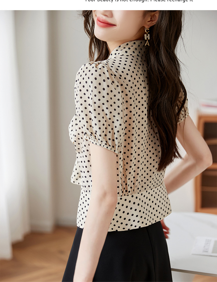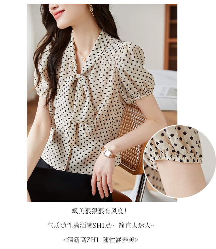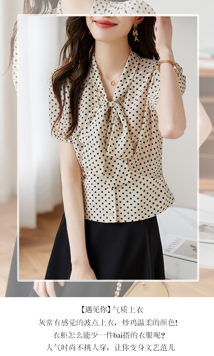 레트로 폴카 도트 실크 셔츠 여성 여름 새 스타일 레이스 업 칼라 셔츠 퍼프 슬리브 탑