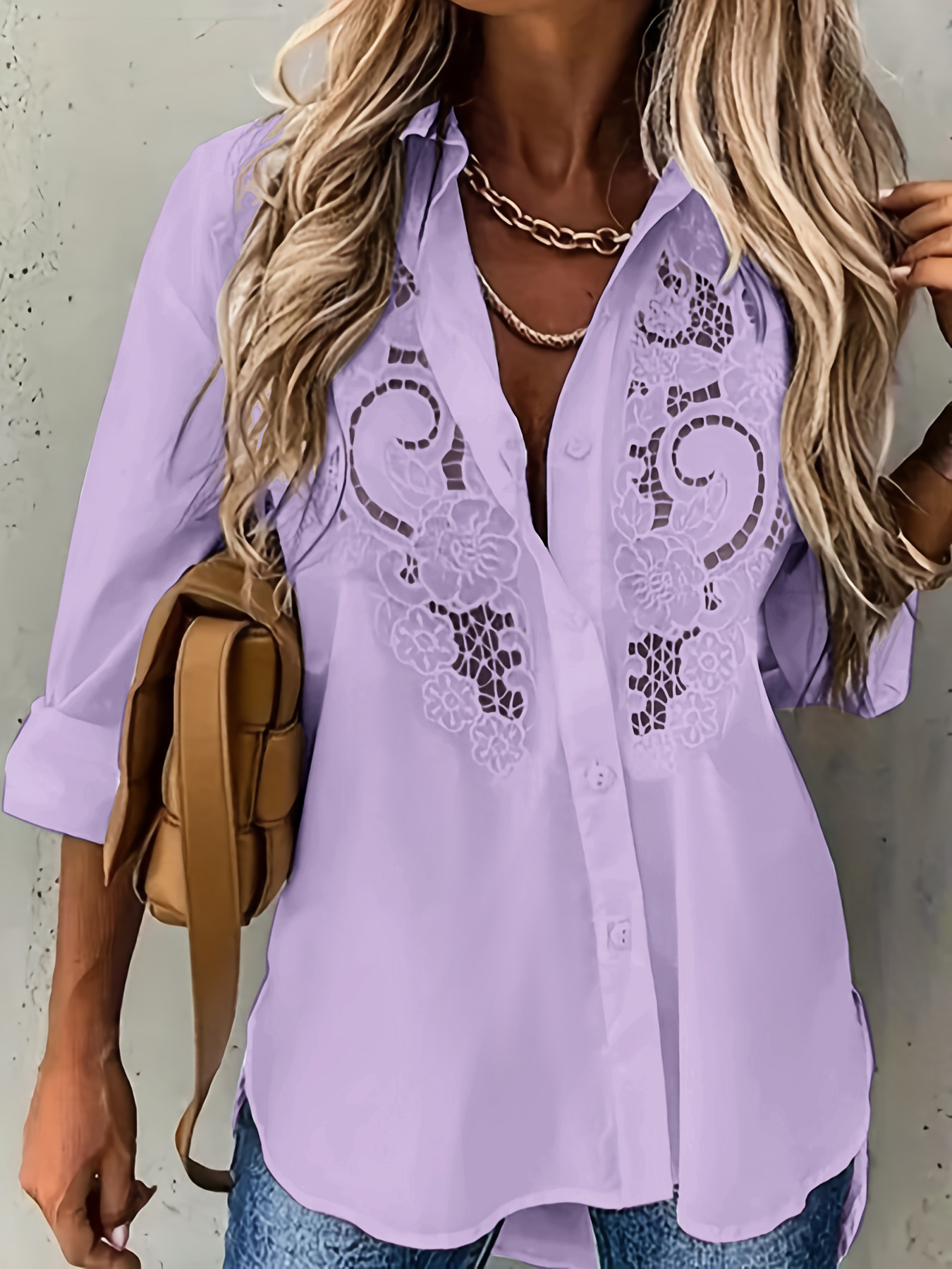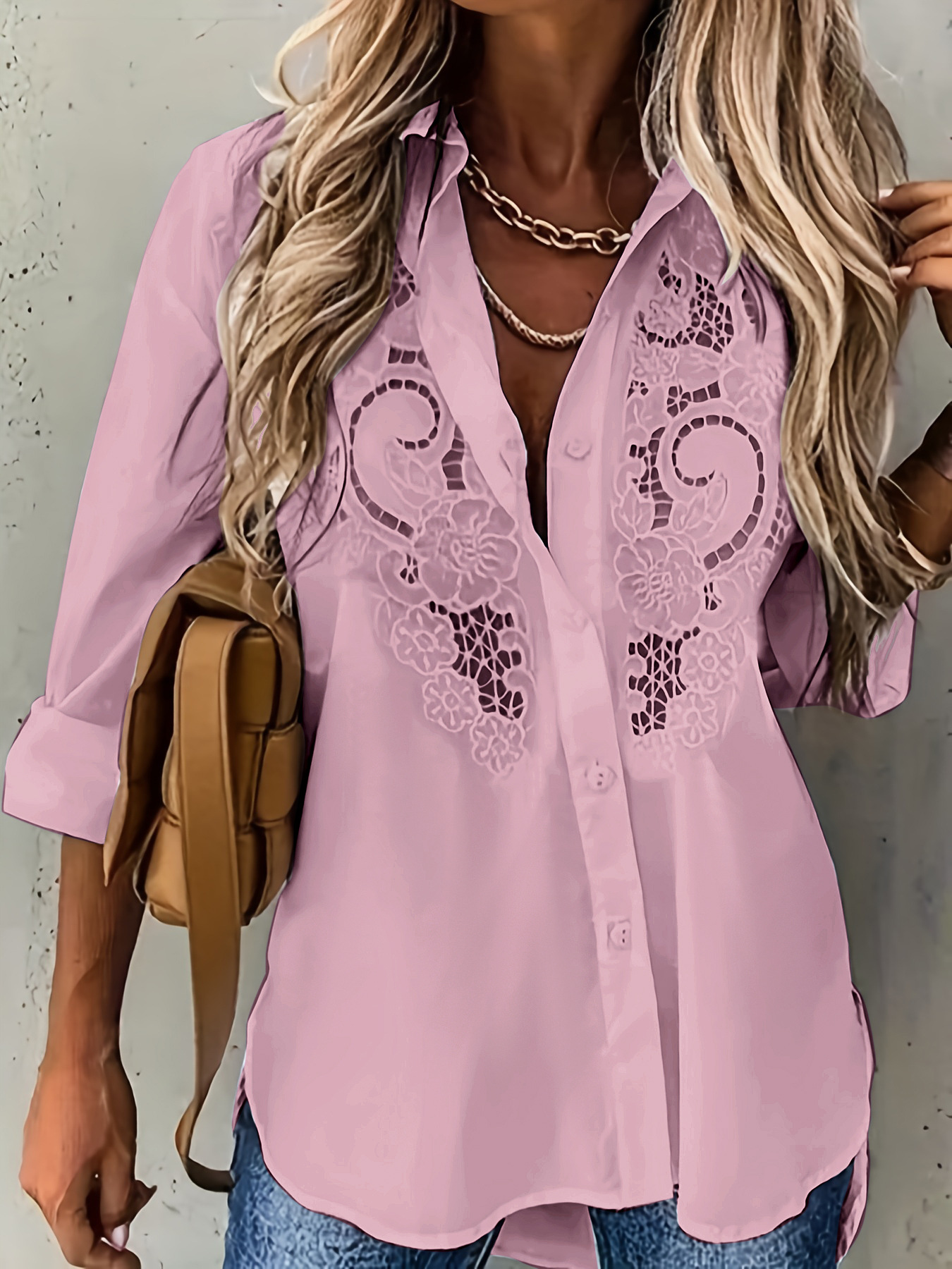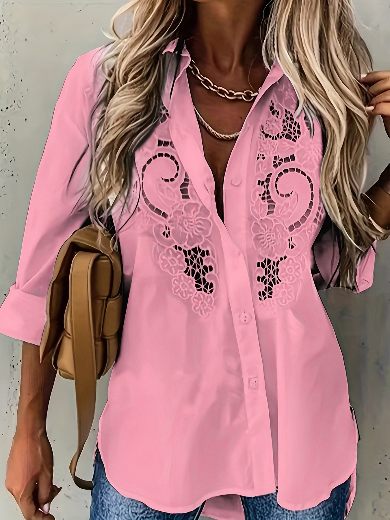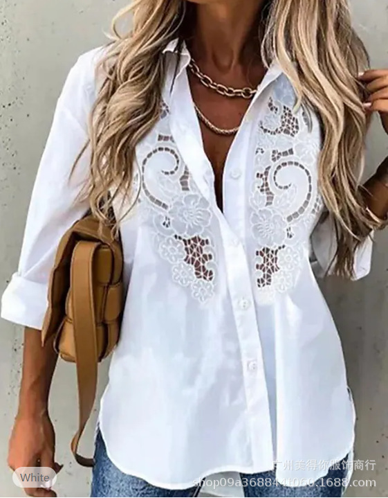 2023亚马逊欧美春夏新款休闲宽松花蕾丝拼接长袖衬衫女