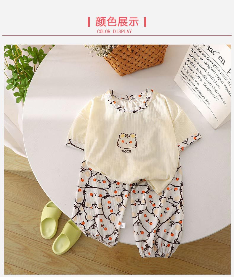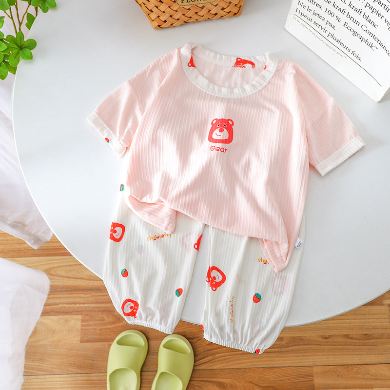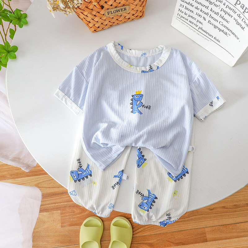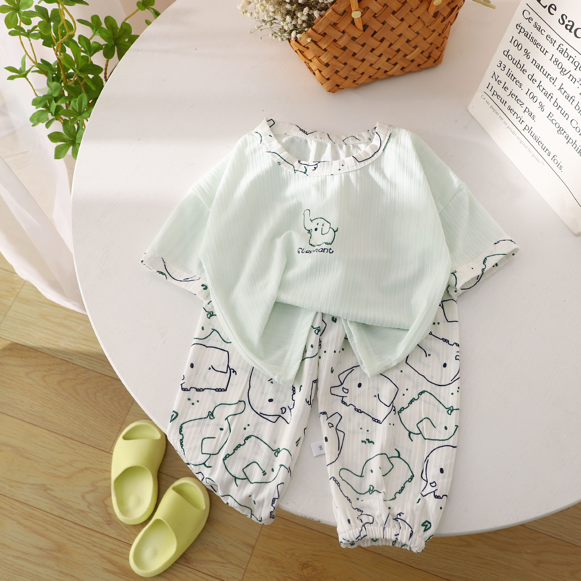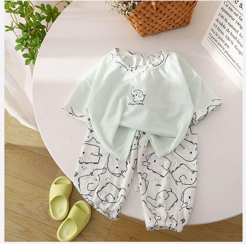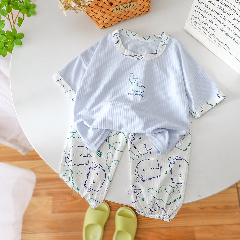 소년 소녀 면 감각 가정복 잠옷 에어컨 옷 단색 인쇄 반팔 한국식 가정복 세트스토어 가기