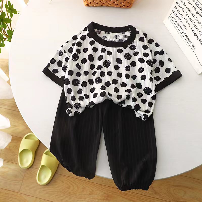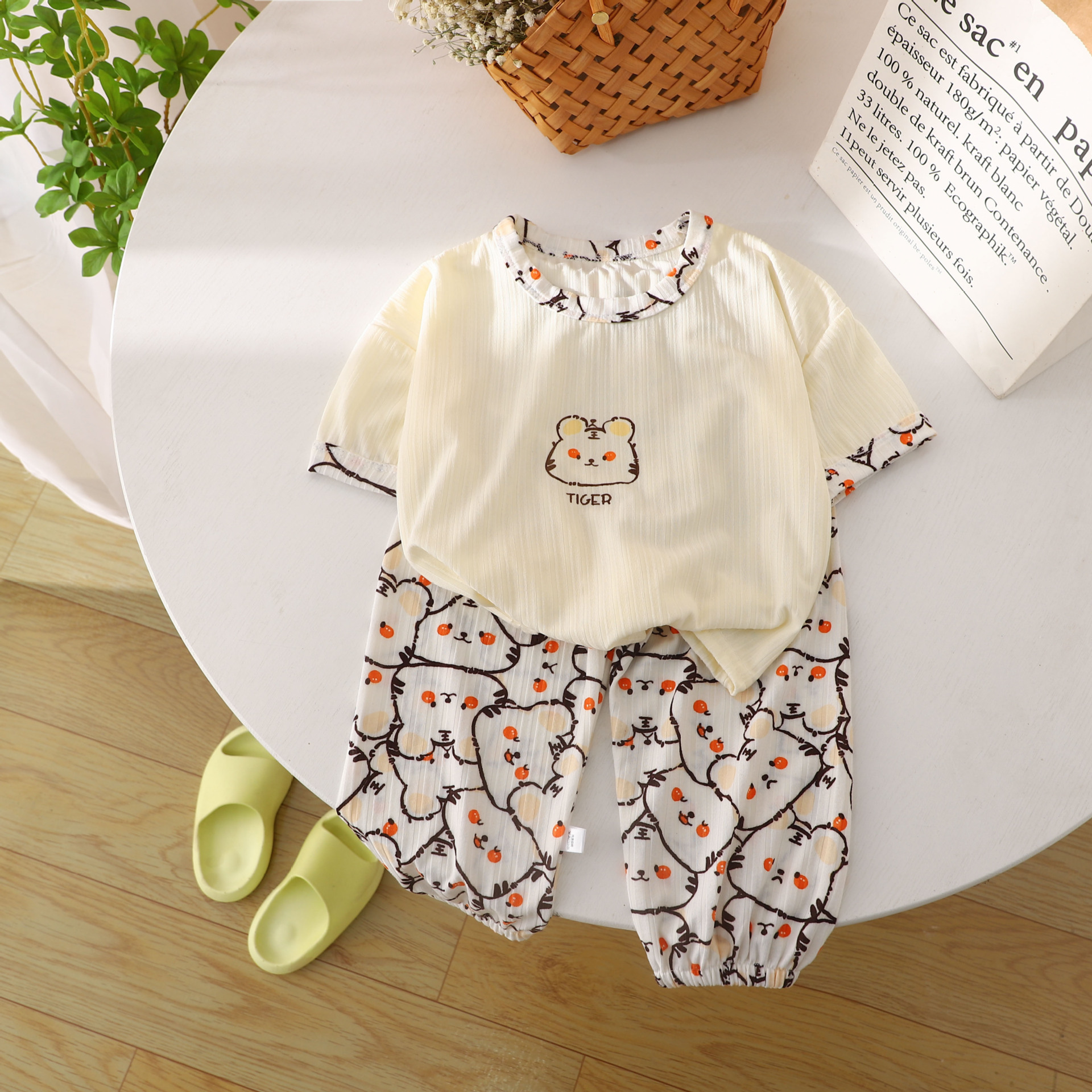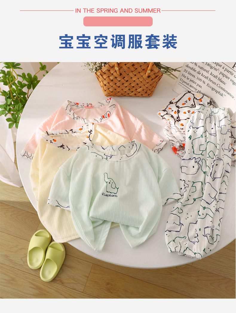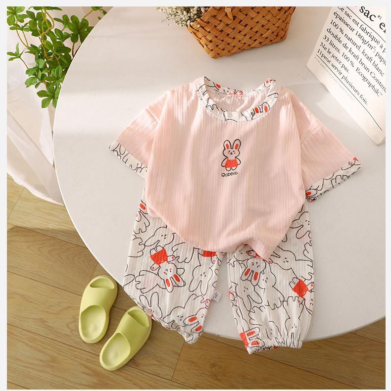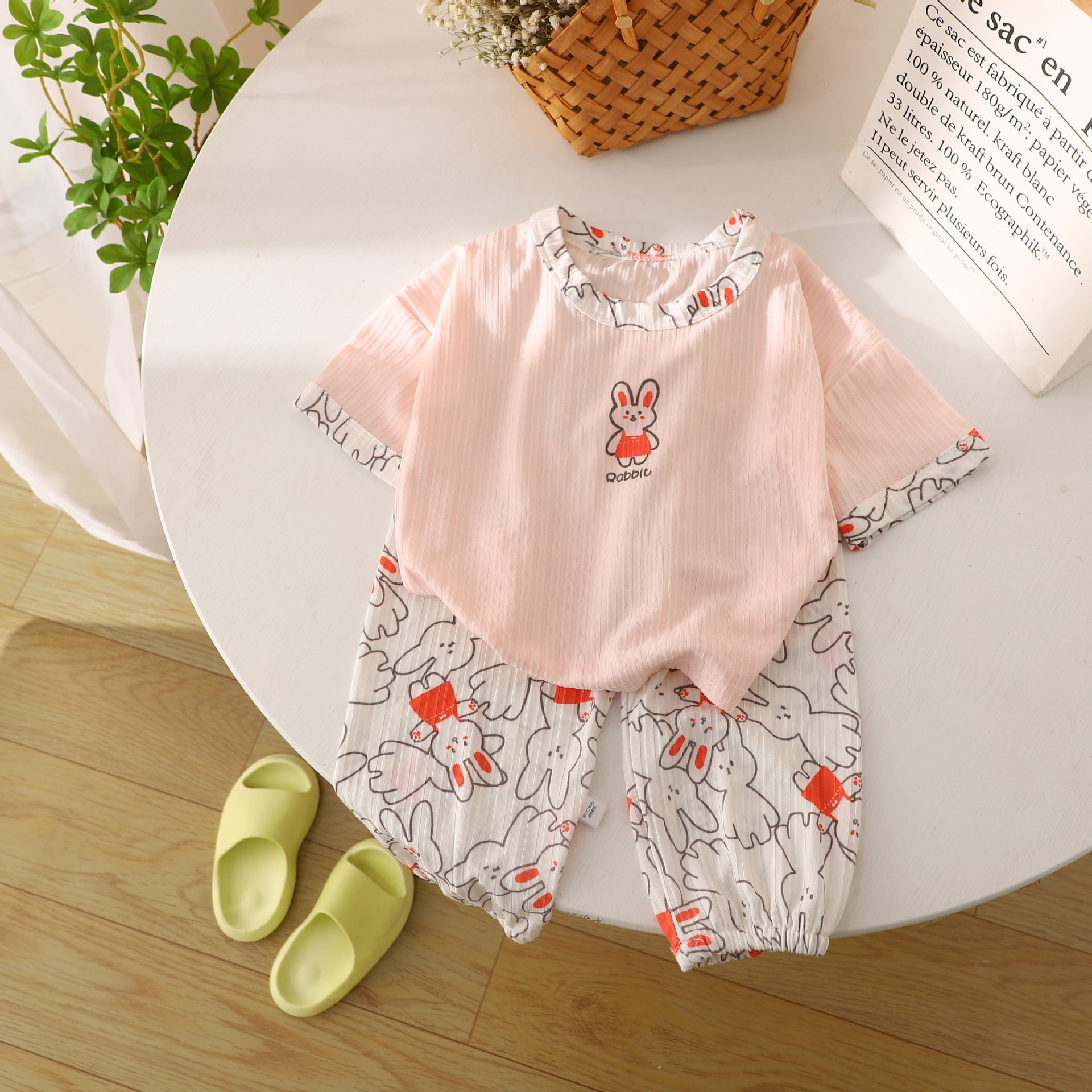 소년 소녀 면 감각 가정복 잠옷 에어컨 옷 단색 인쇄 반팔 한국식 가정복 세트스토어 가기