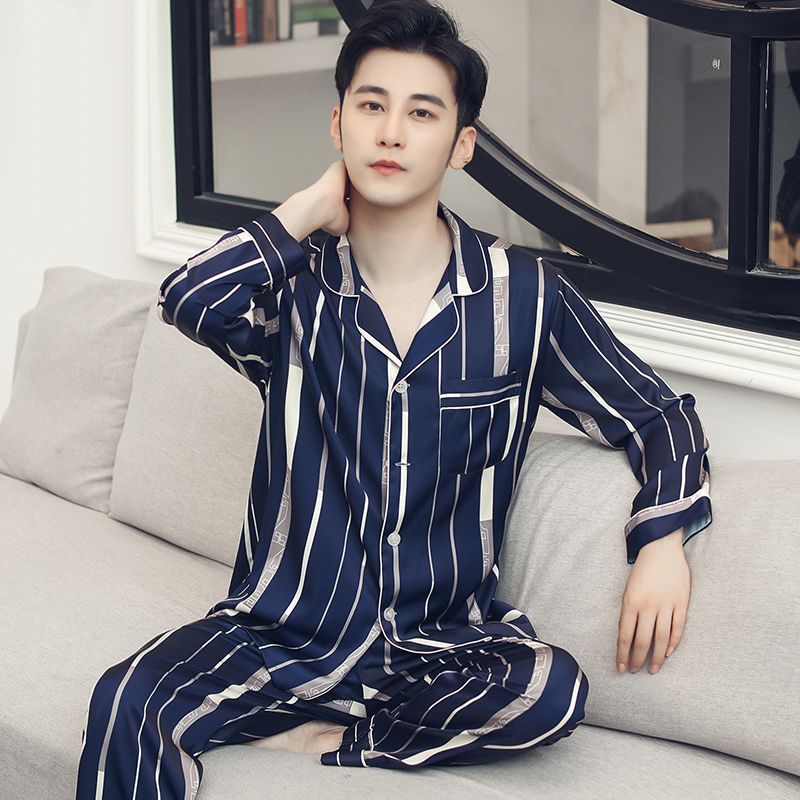 여름 얼음 실크 남자의 잠옷 멋진 시뮬레이션 실크 얇은 가정 옷 세트 봄과 가을 긴 소매 플러스 사이즈 폭발스토어 가기