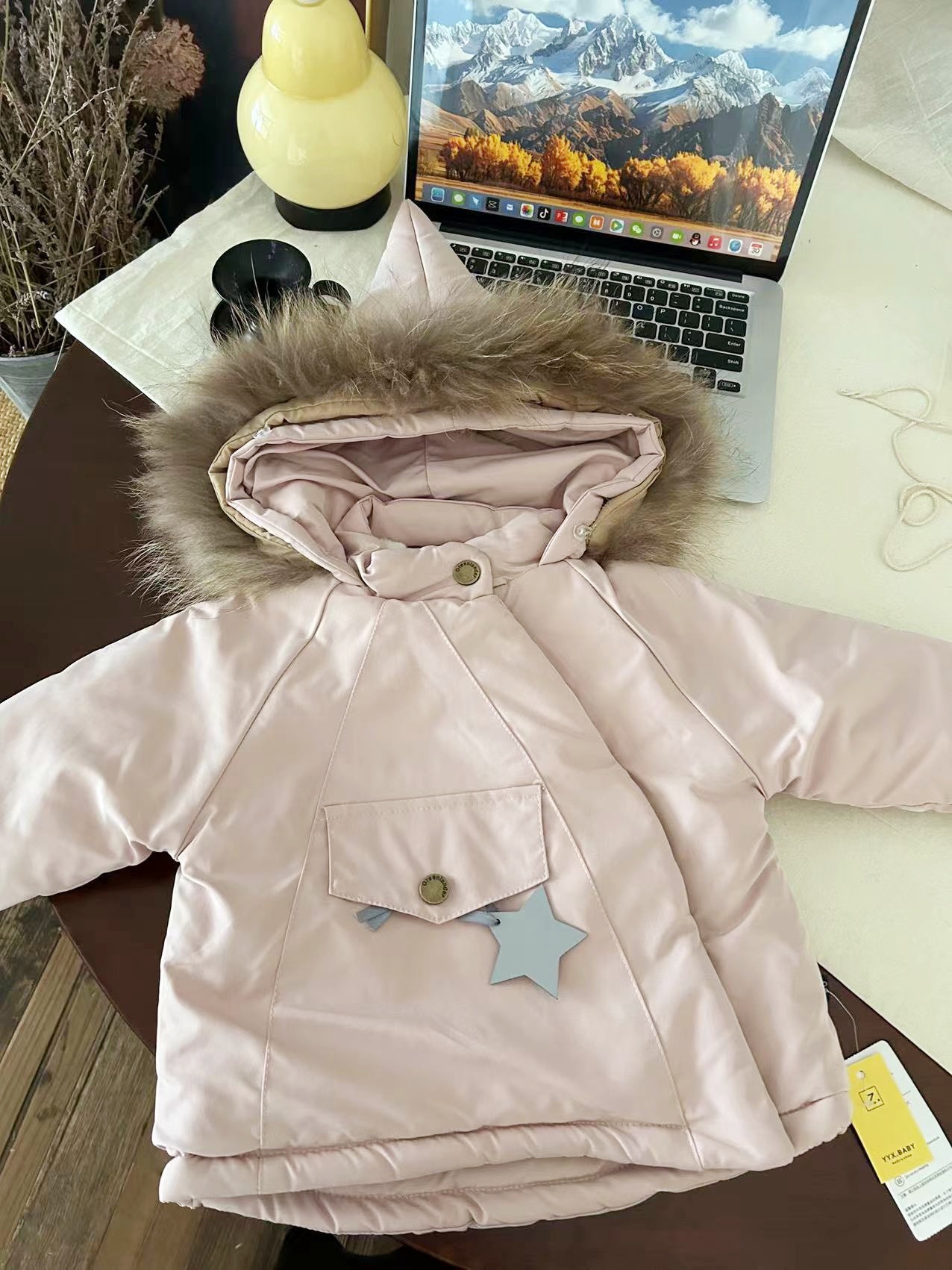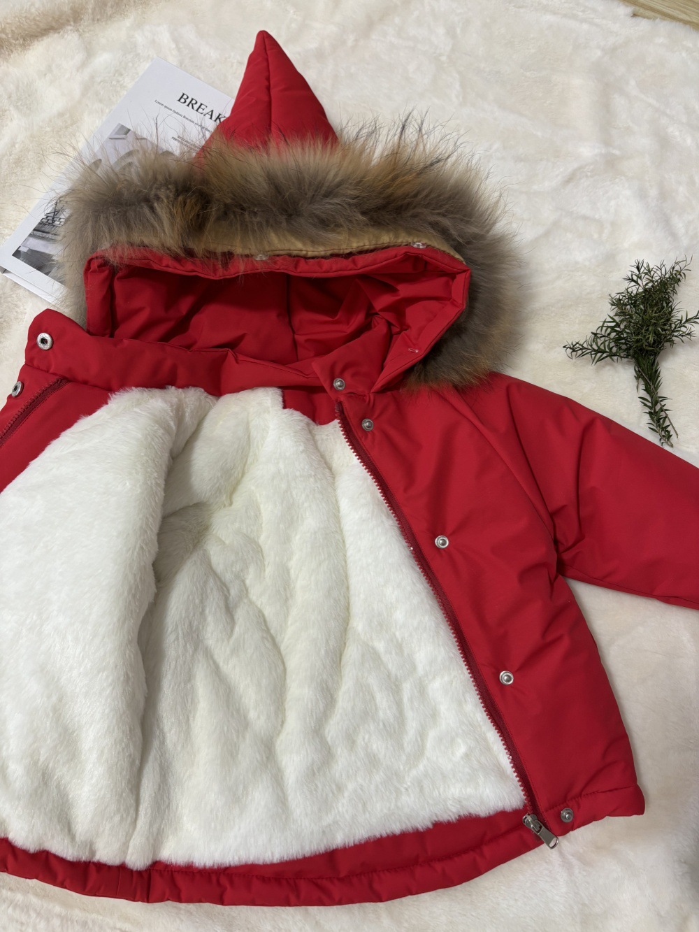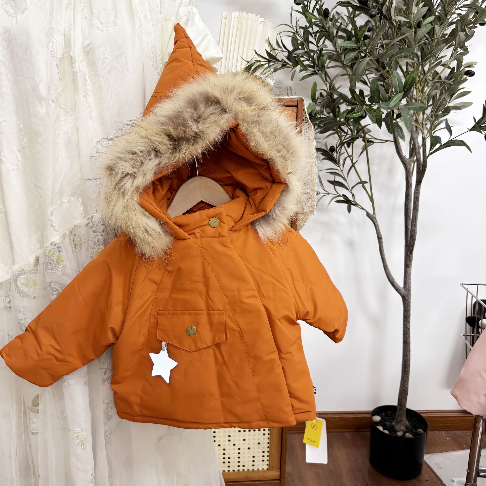 겨울 한국 아동복 큰 모피 칼라 귀여운 매직 뾰족한 매트 엘프 코트 모자 코튼 코트 아기 코트 따뜻한