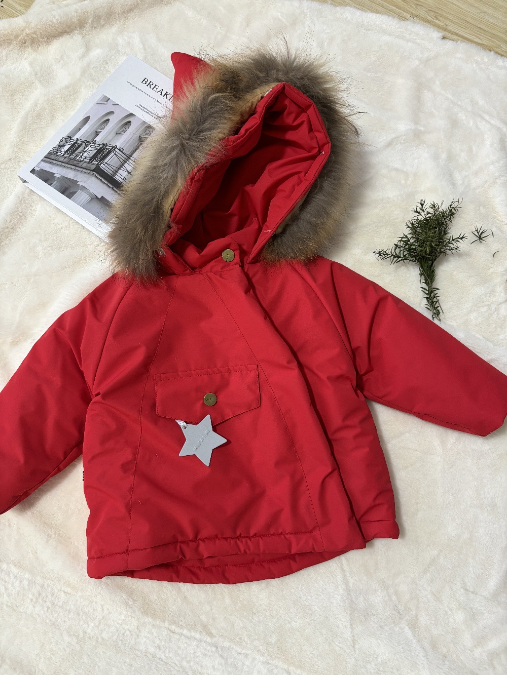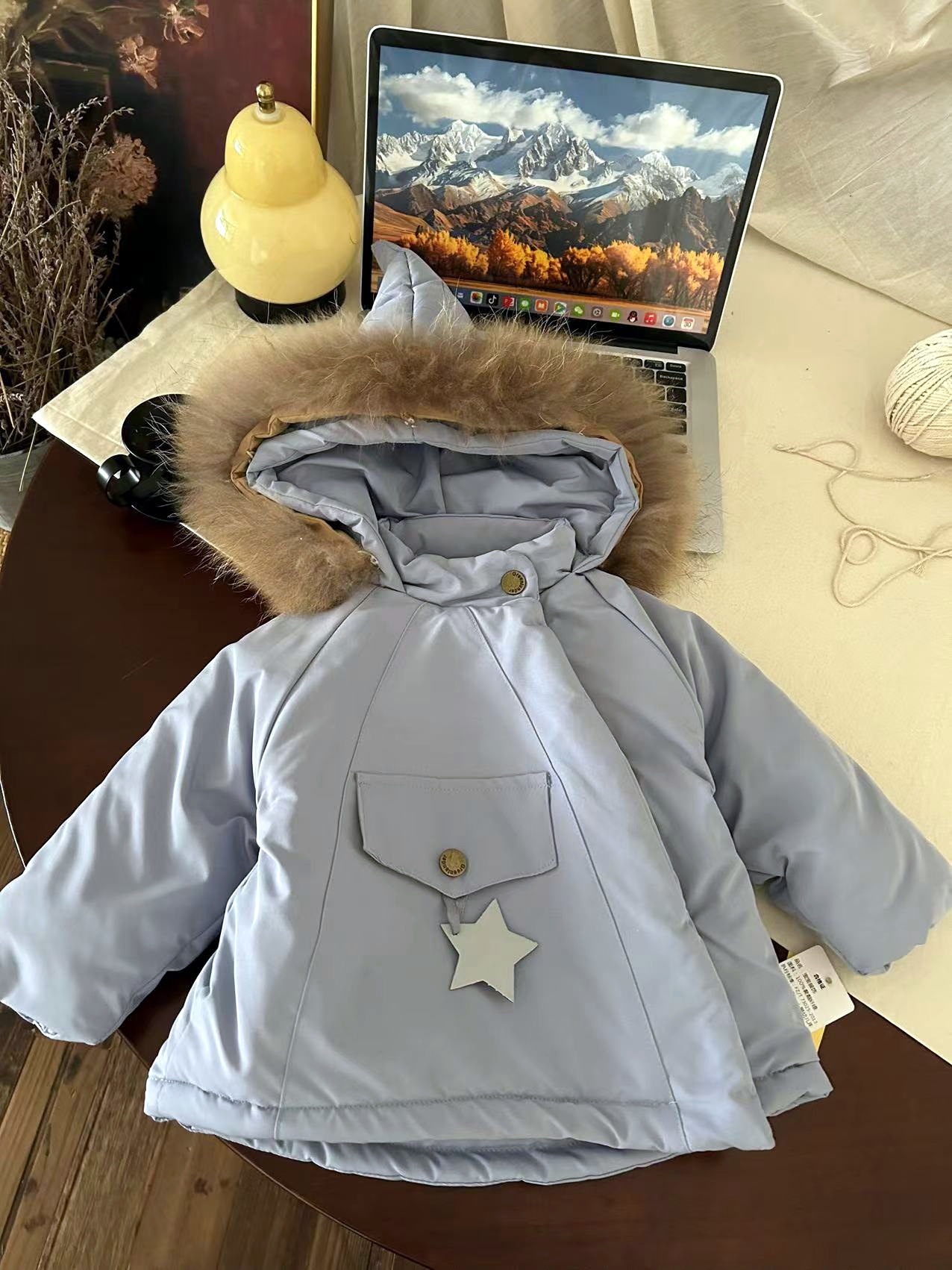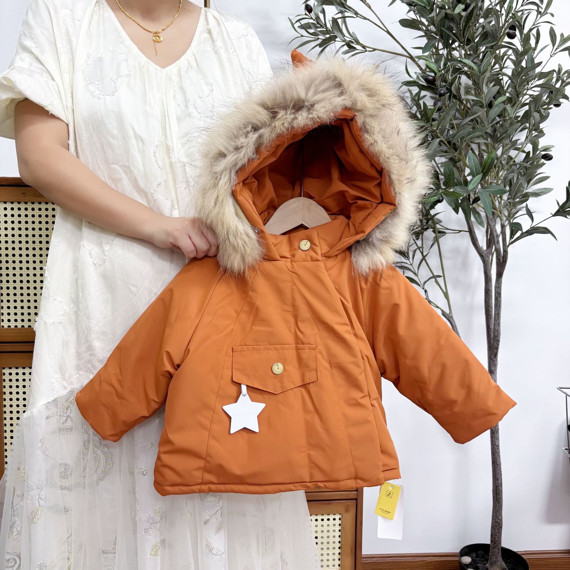겨울 한국 아동복 큰 모피 칼라 귀여운 매직 뾰족한 매트 엘프 코트 모자 코튼 코트 아기 코트 따뜻한