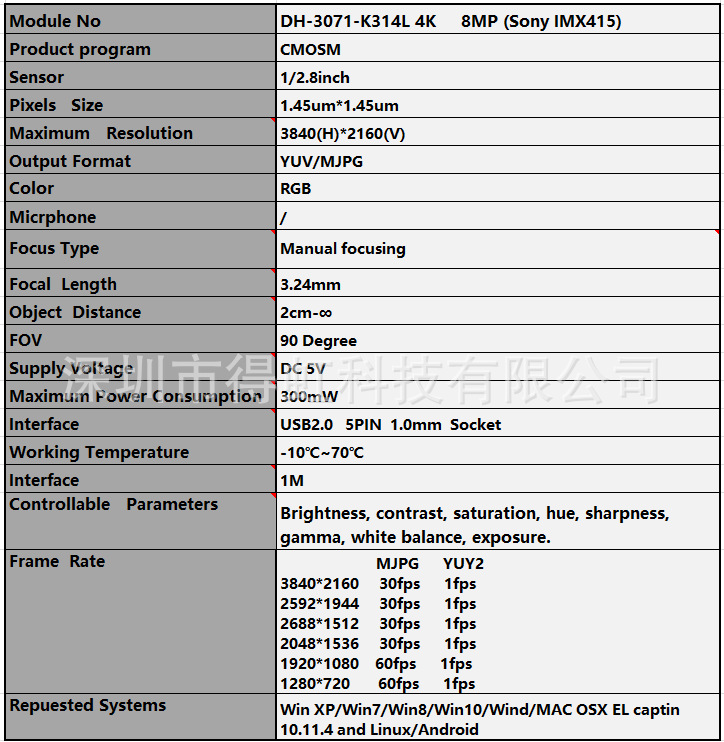 Imx415 카메라 모듈 4K HD 8 백만 픽셀 USB 드라이브없는 산업용 카메라 비전 모듈 광각