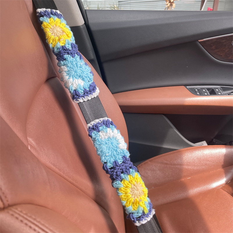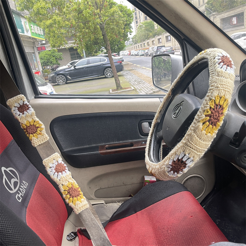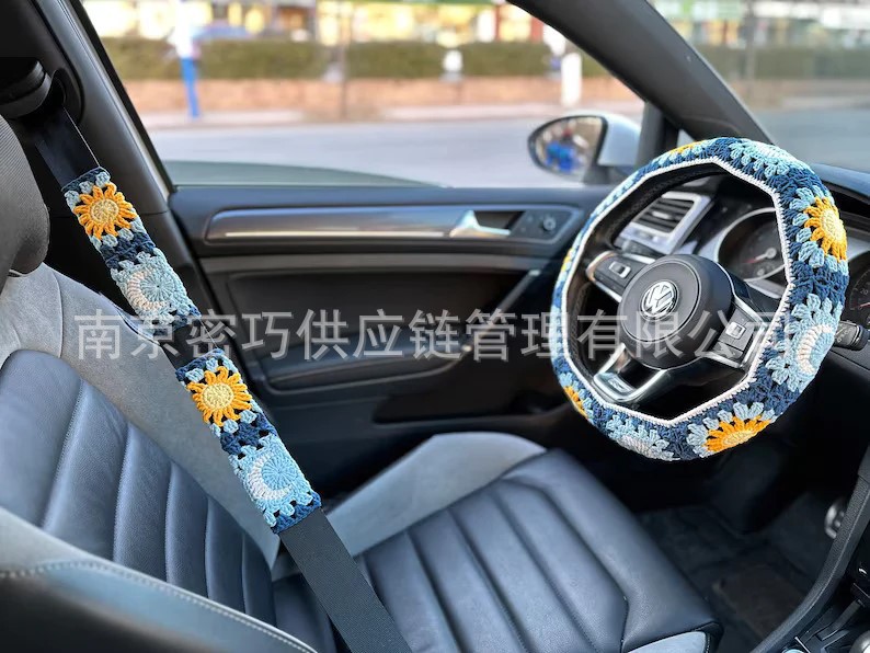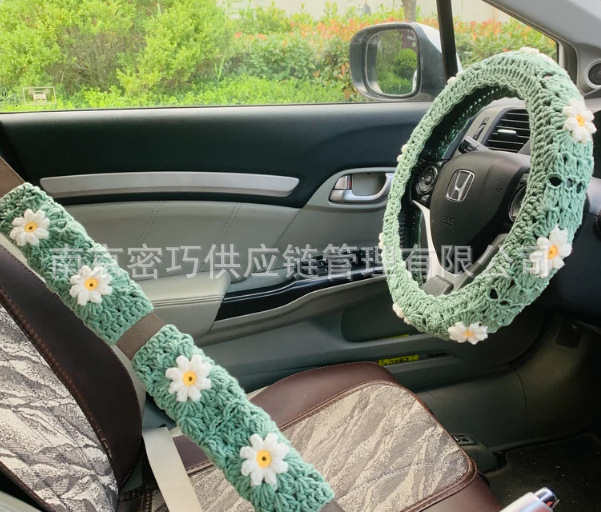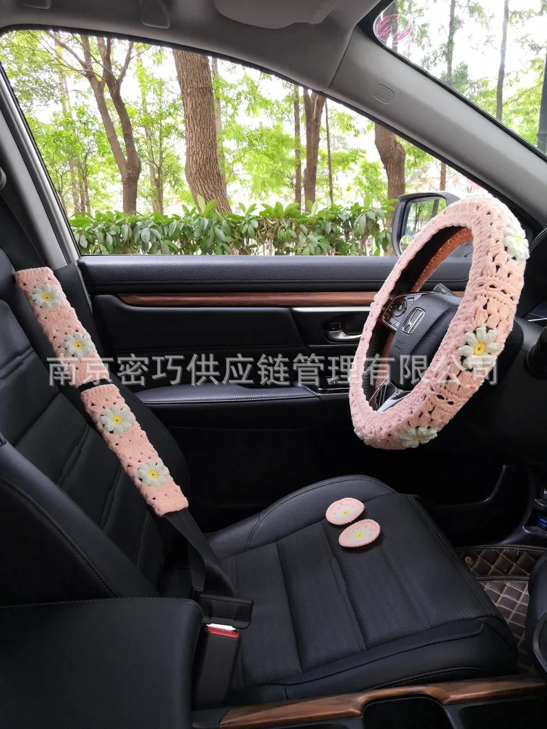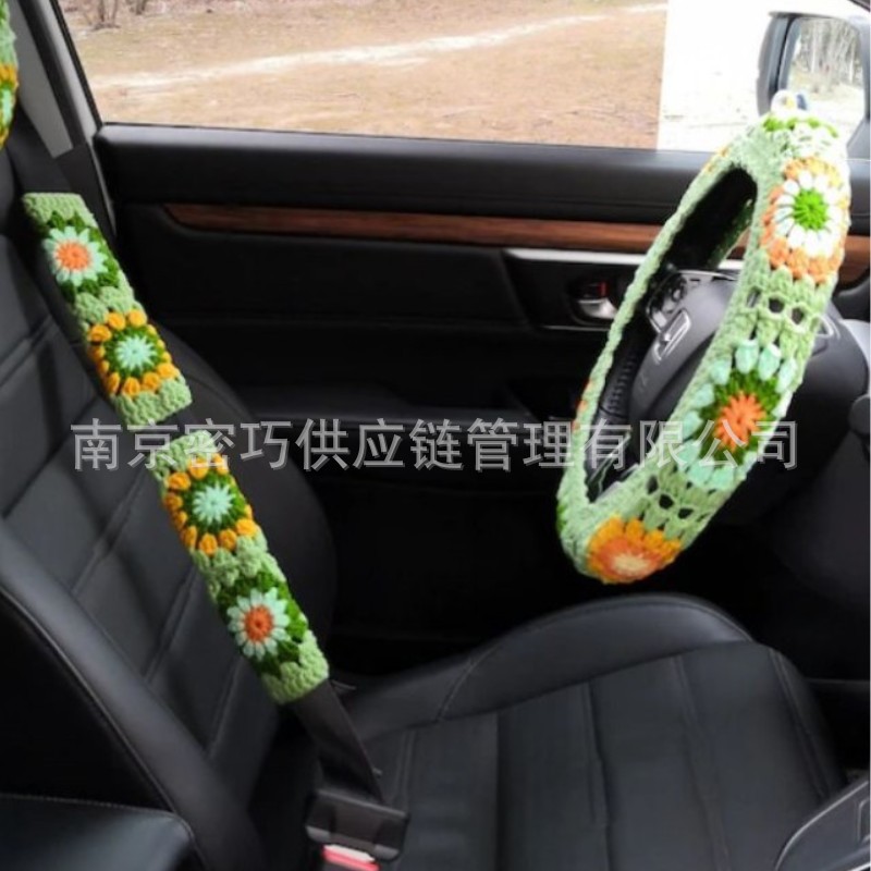아마존 국경 간 자동차 인테리어 수제 크로 셰 뜨개질 꽃 장식 자동차 스티어링 휠 커버 미끄럼 방지 커버 안전 벨트 커버