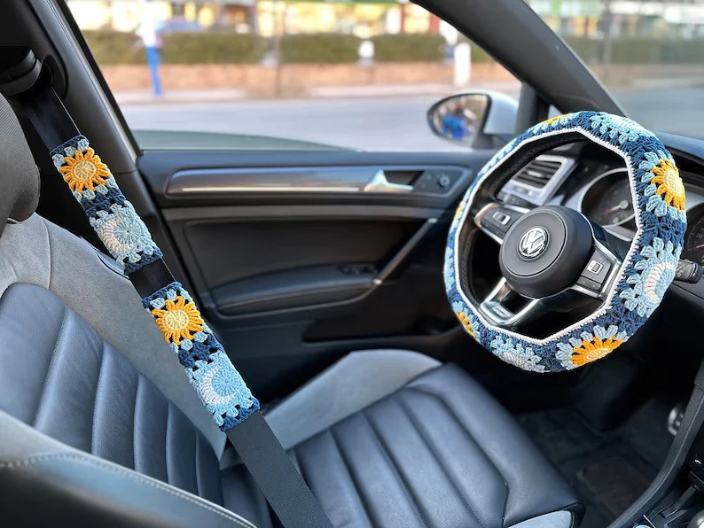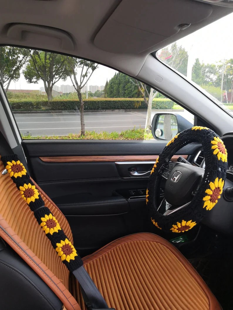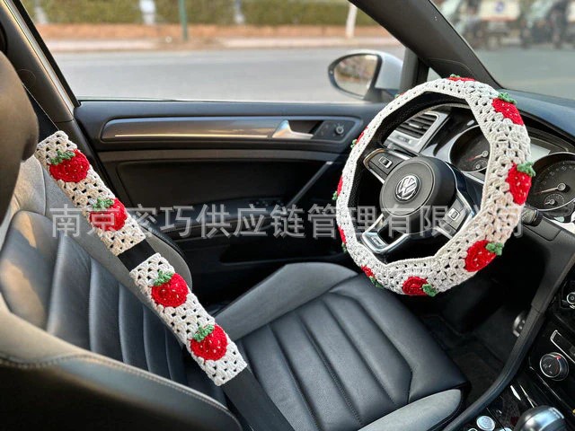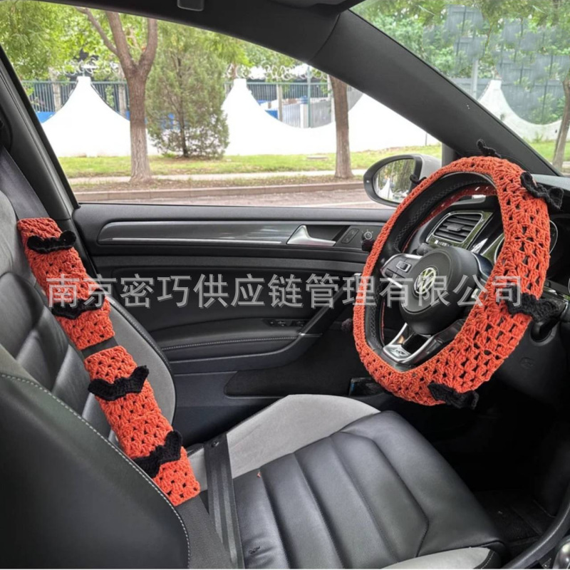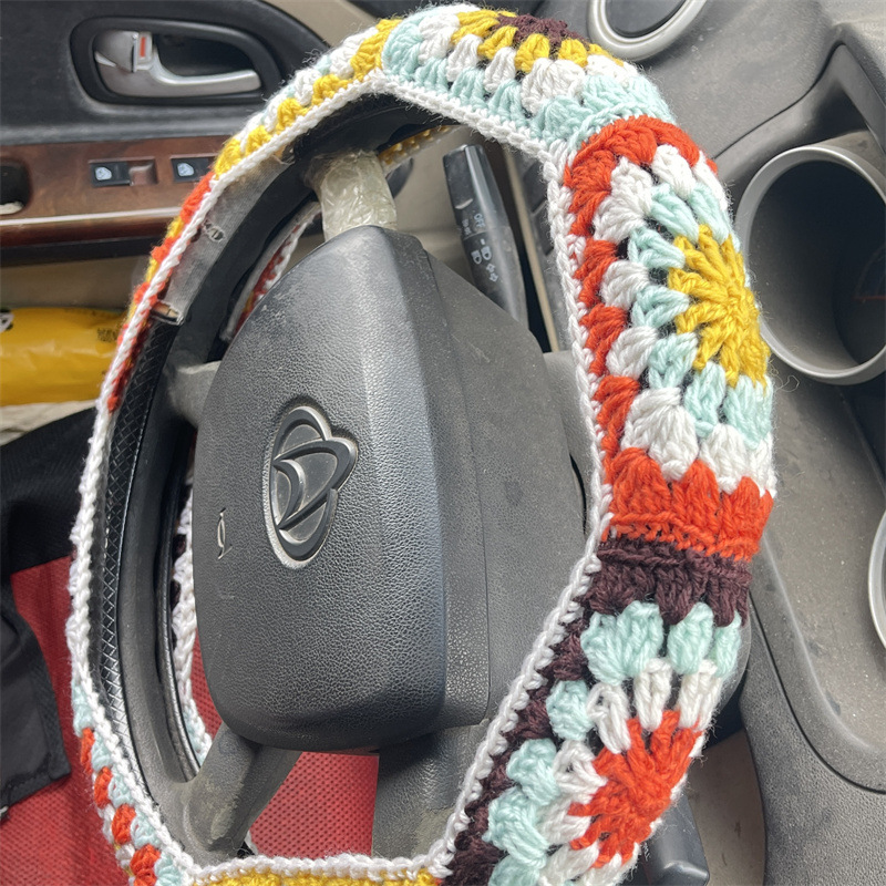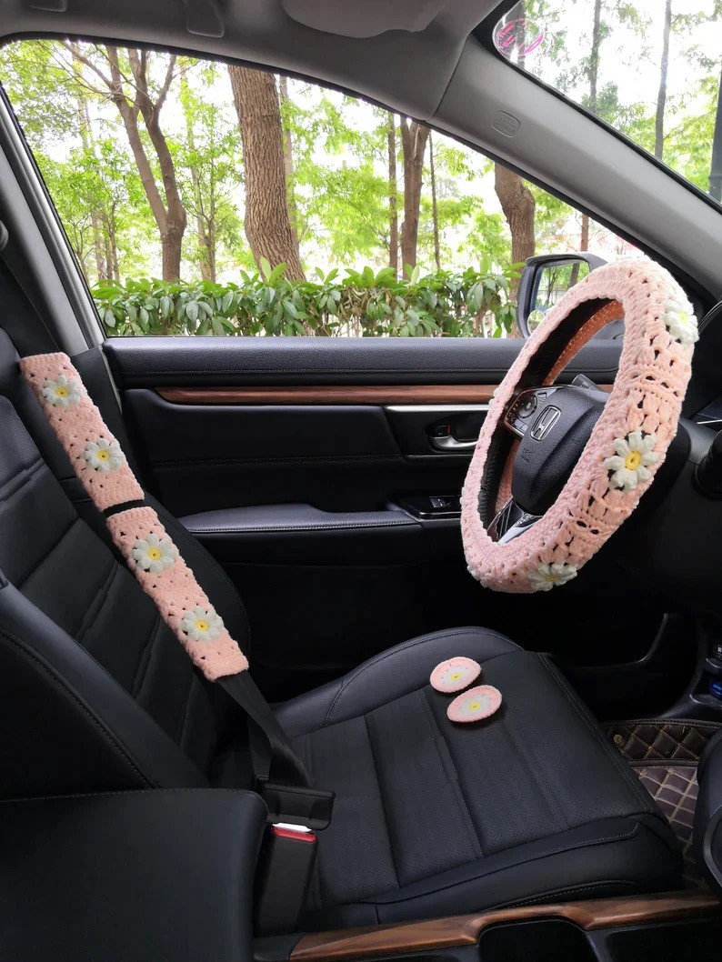 아마존 국경 간 자동차 인테리어 수제 크로 셰 뜨개질 꽃 장식 자동차 스티어링 휠 커버 미끄럼 방지 커버 안전 벨트 커버
