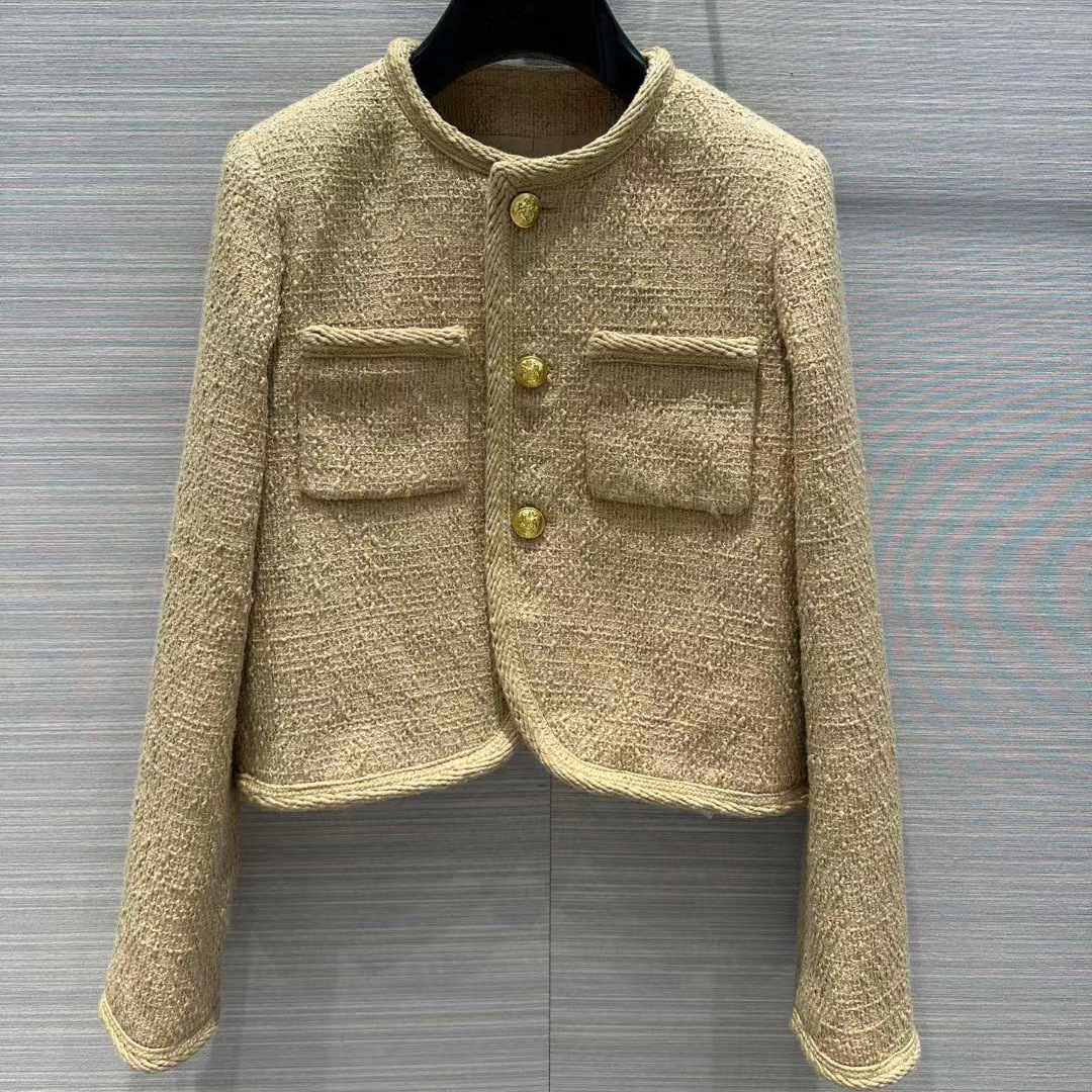 유럽 스타일의 새로운 메탈 버클 재킷 라운드 넥 더블 포켓 작은 향기로운 트위드 카키색 짧은 재킷 여성용