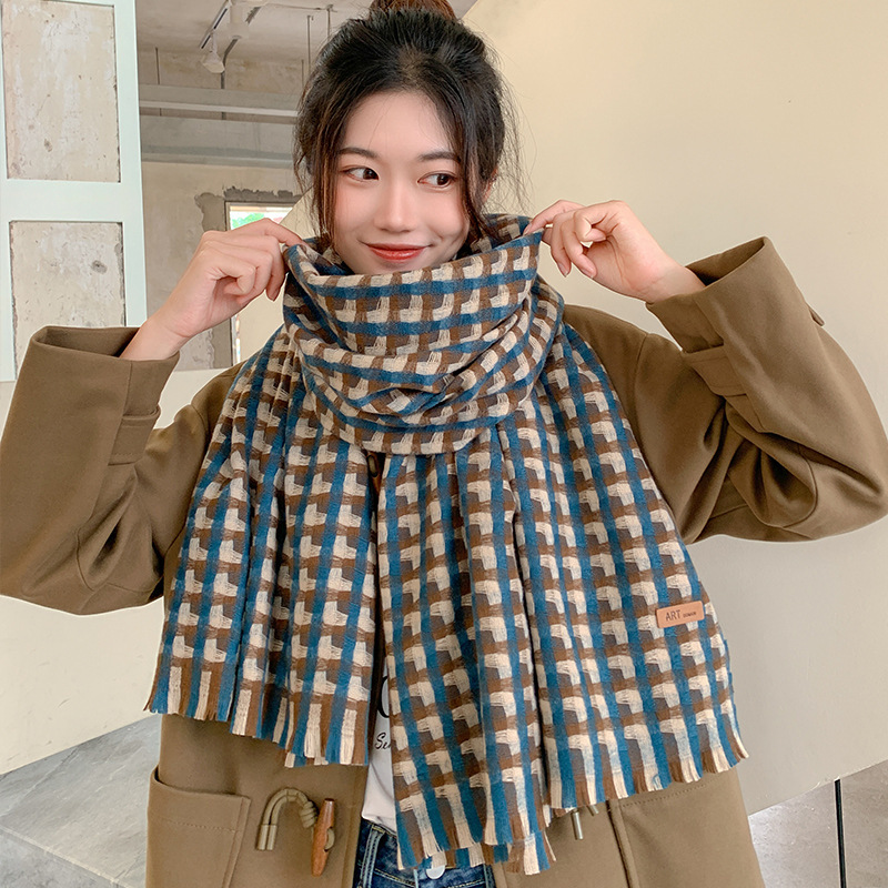 새로운 일본과 한국 스타일 컬러 블록 격자 무늬 스카프 모조 캐시미어 짧은 수염 스카프 여성용 겨울 숄 학생용 이중 목적 따뜻한 목스토어 가기