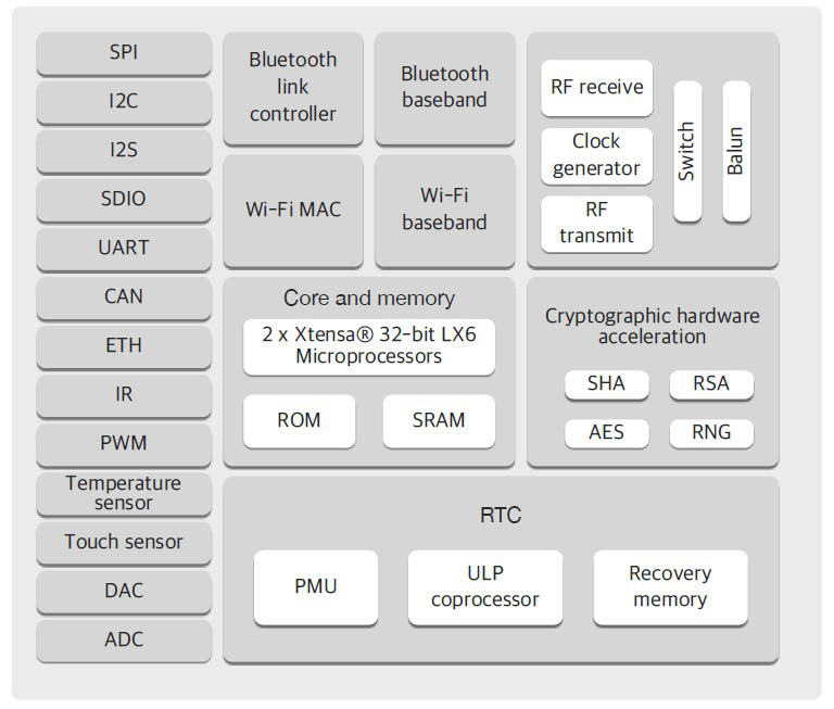 • Xtensa® 32-bit LX6双核处理器,运算能力高达600 DMIPS