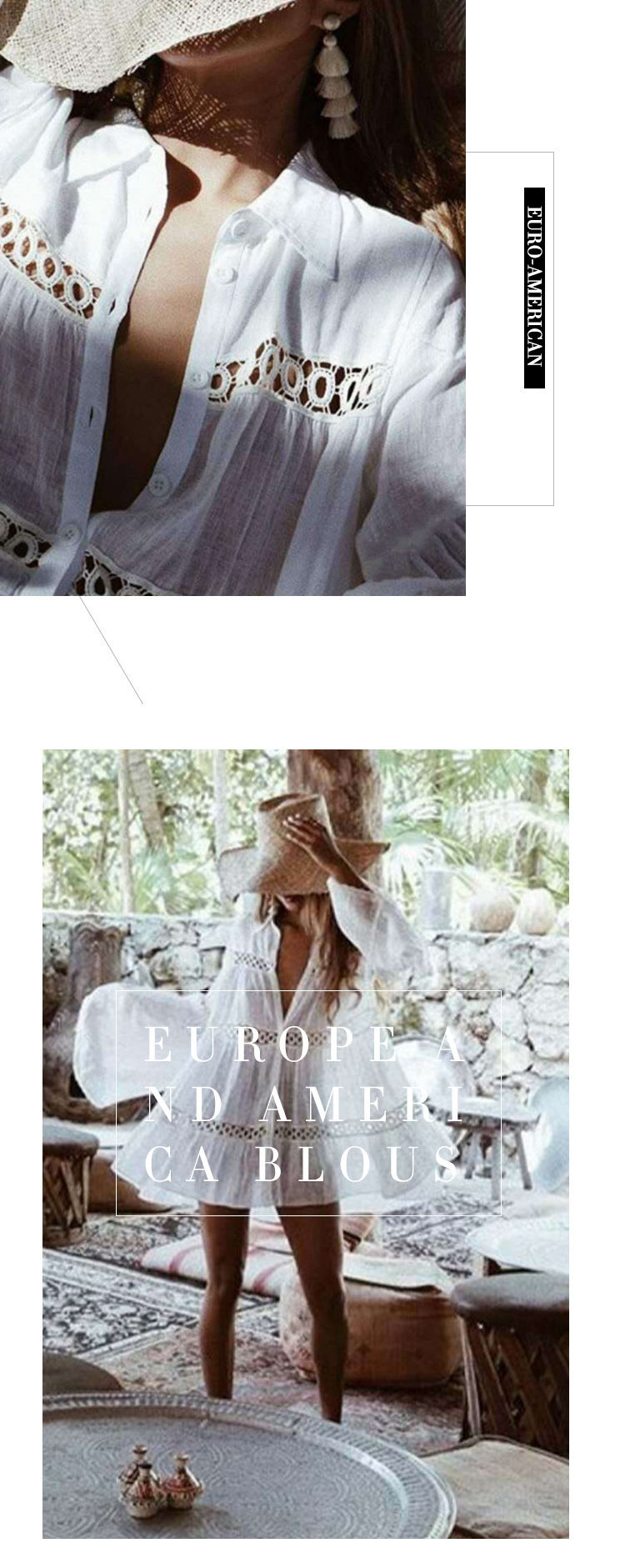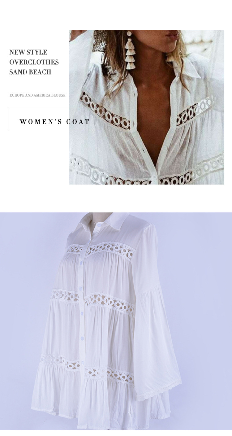 뜨거운 판매 해외 새로운 스타일 면 레이스 셔츠 나팔 소매 비치 블라우스 태양 보호 세트 수영복 재킷 여자의 카디건스토어 가기