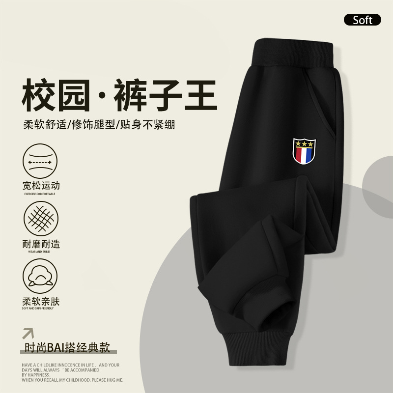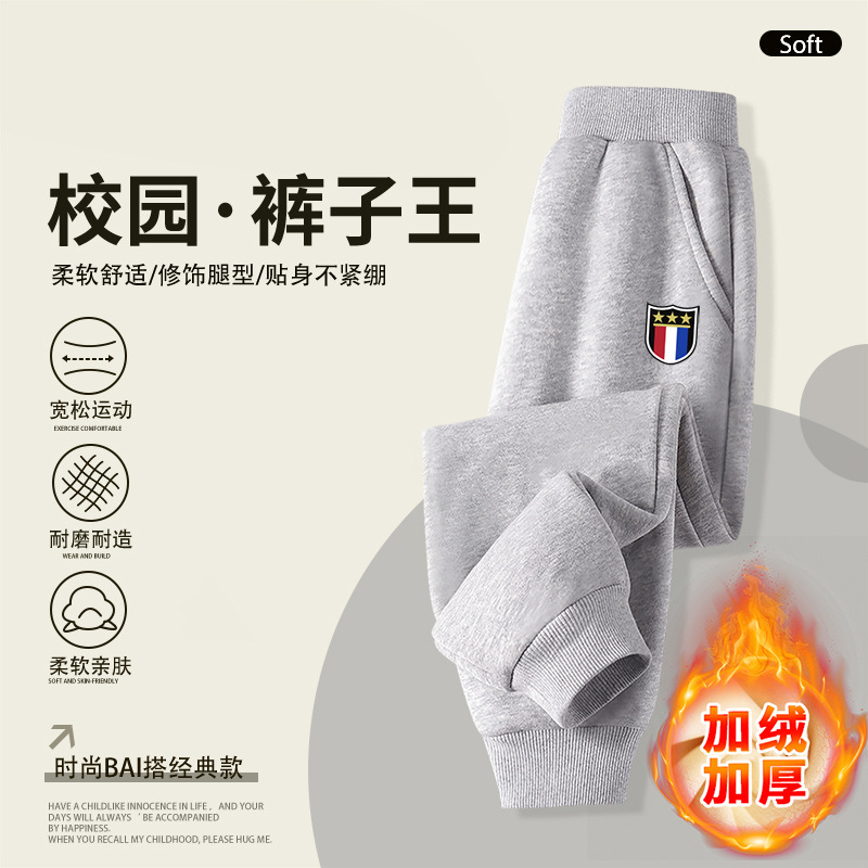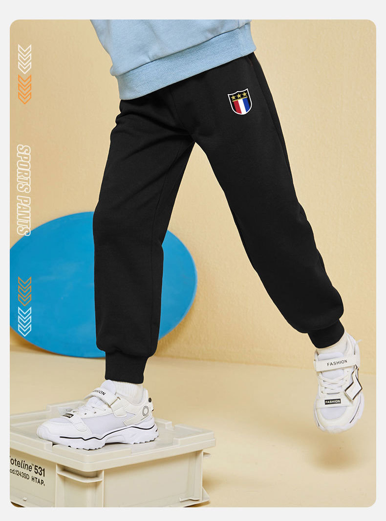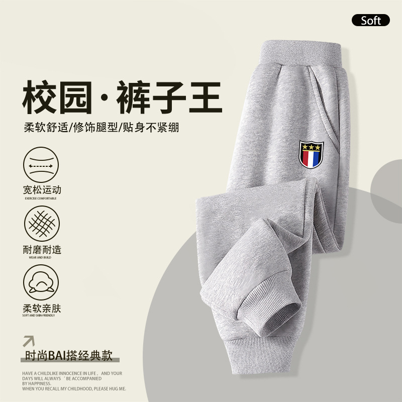 2025 봄 가을 신상 남아용 기모 스웨트팬츠, 중대형 아동용 배지 장식 바지, 멋스럽고 루즈한 신상 스포츠 팬츠, 트렌디스토어 가기