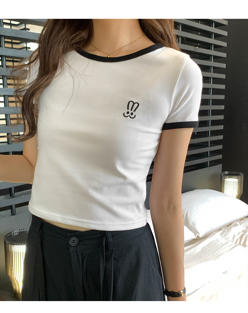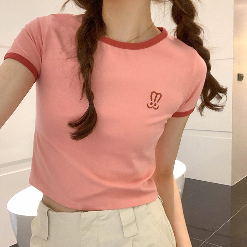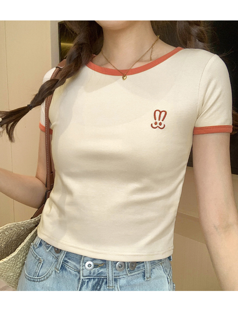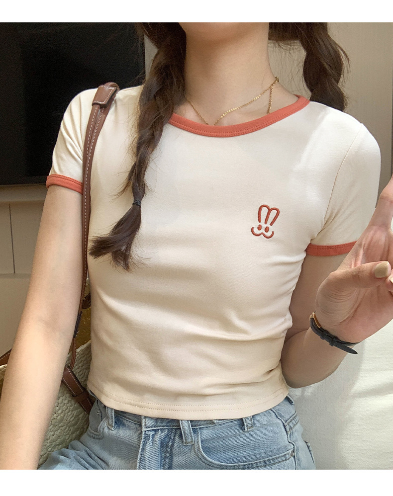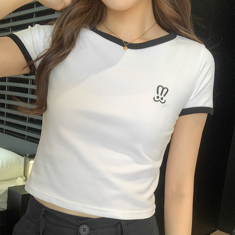 자수 어깨 반팔 티셔츠 여성 여름 2023 새로운 스타일 짧은 티셔츠 달콤하고 매운 라운드 넥 베이스 탑