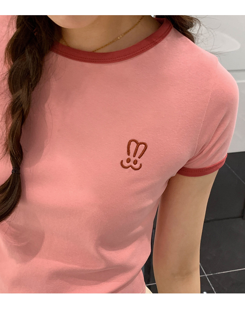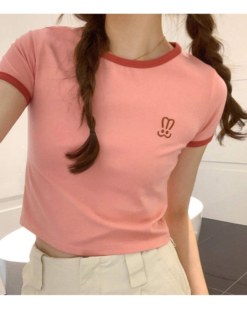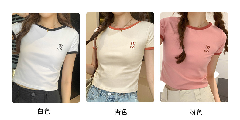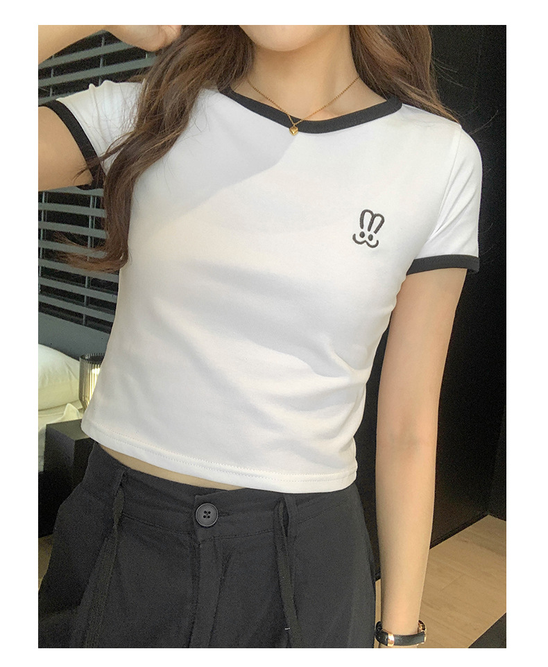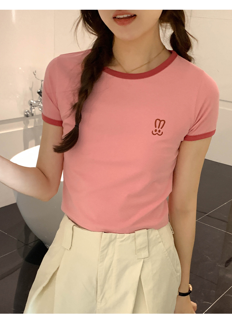 자수 어깨 반팔 티셔츠 여성 여름 2023 새로운 스타일 짧은 티셔츠 달콤하고 매운 라운드 넥 베이스 탑