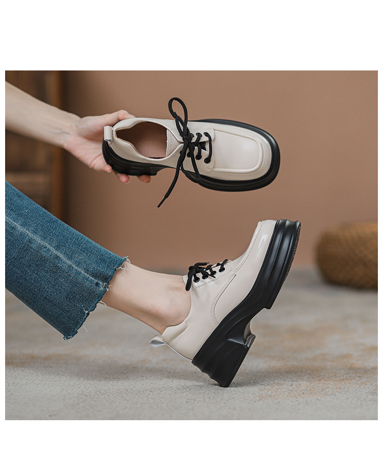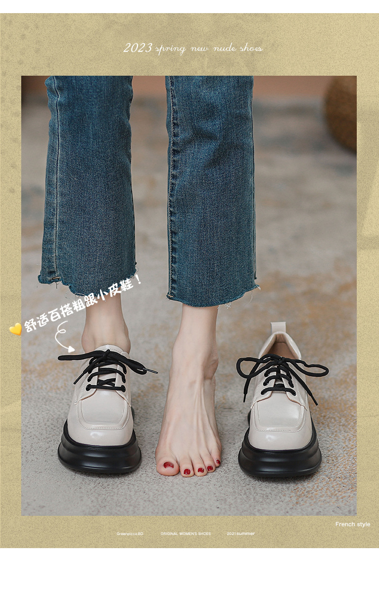 영국 스타일 머핀 레이스 업 작은 가죽 신발 여성용 2023 새로운 하이힐 두꺼운 솔 증가 8cm 로퍼