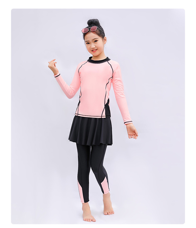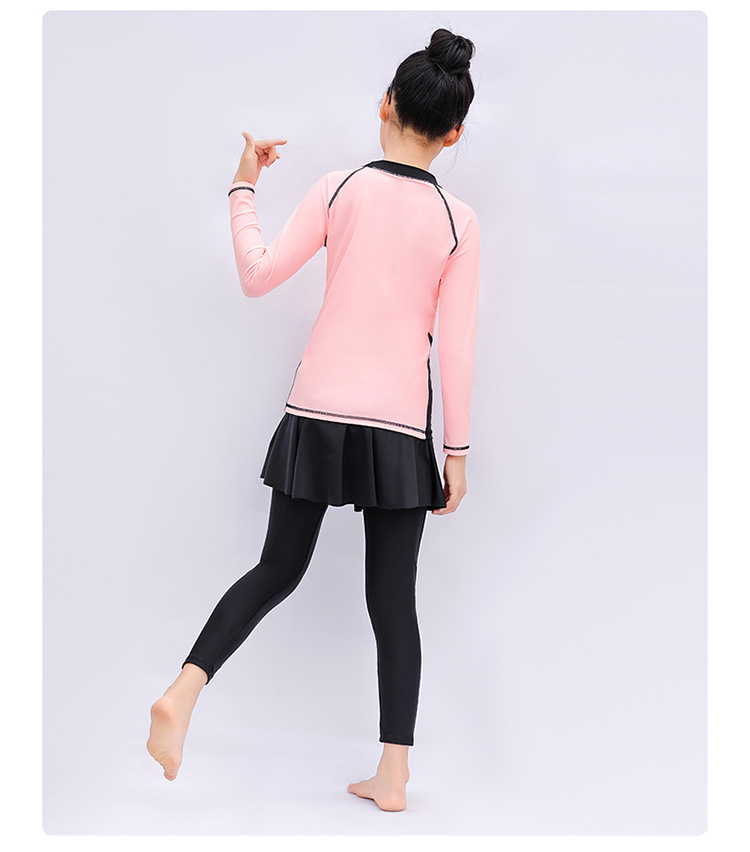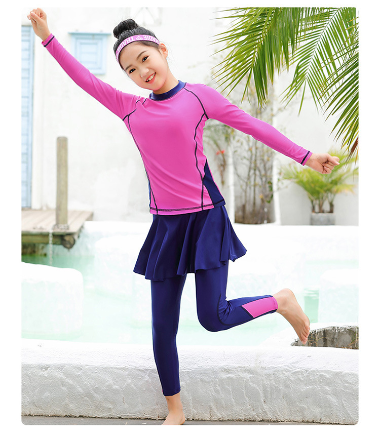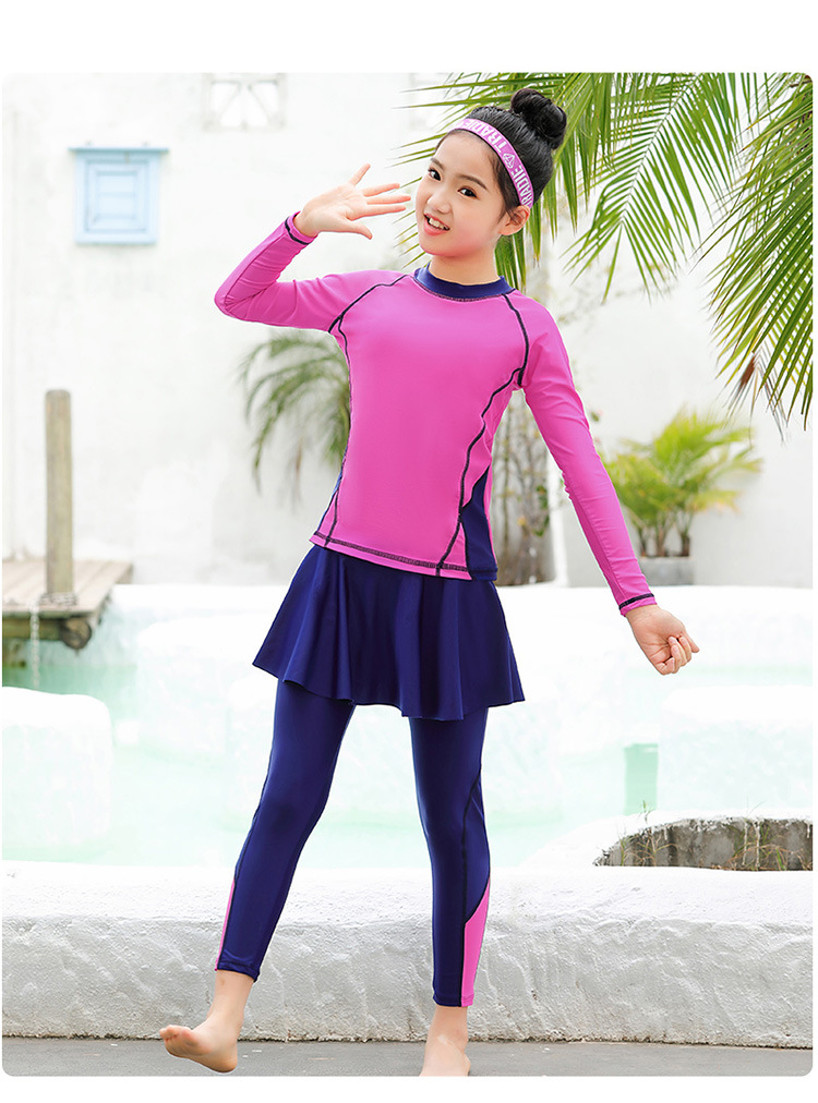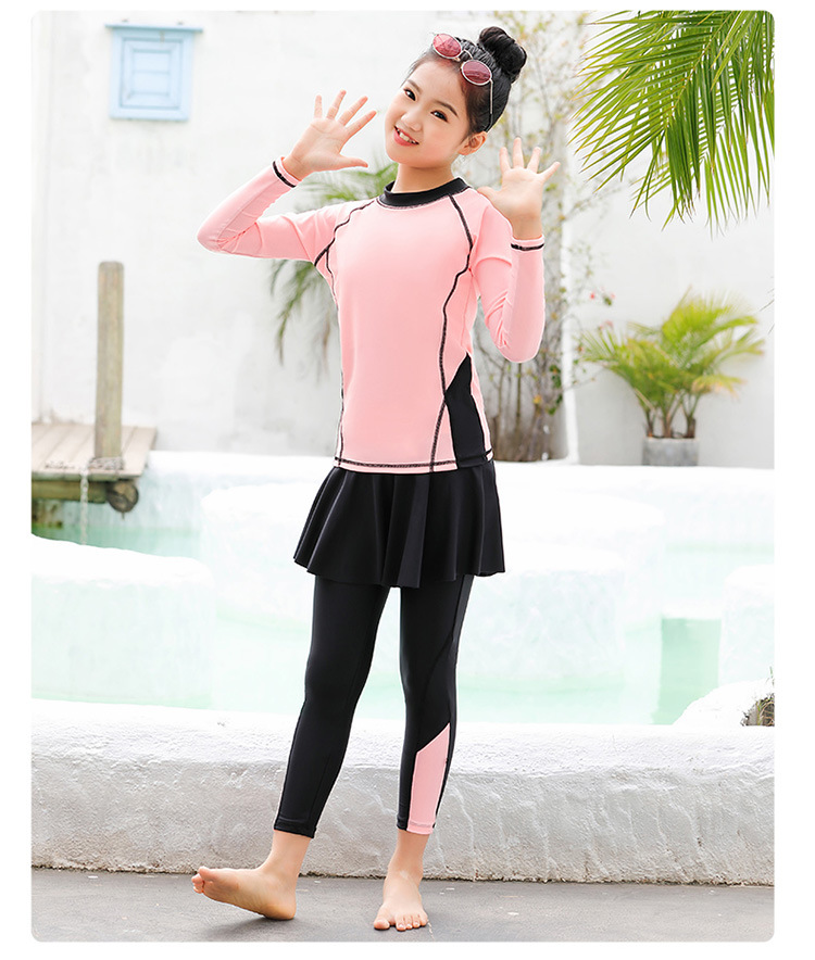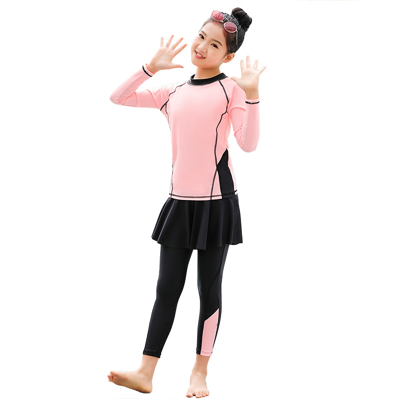 Trissass 2023 새로운 어린이 스플릿 스커트 스타일 여아 수영복 단색 스포츠 큰 어린이 긴 소매 바지