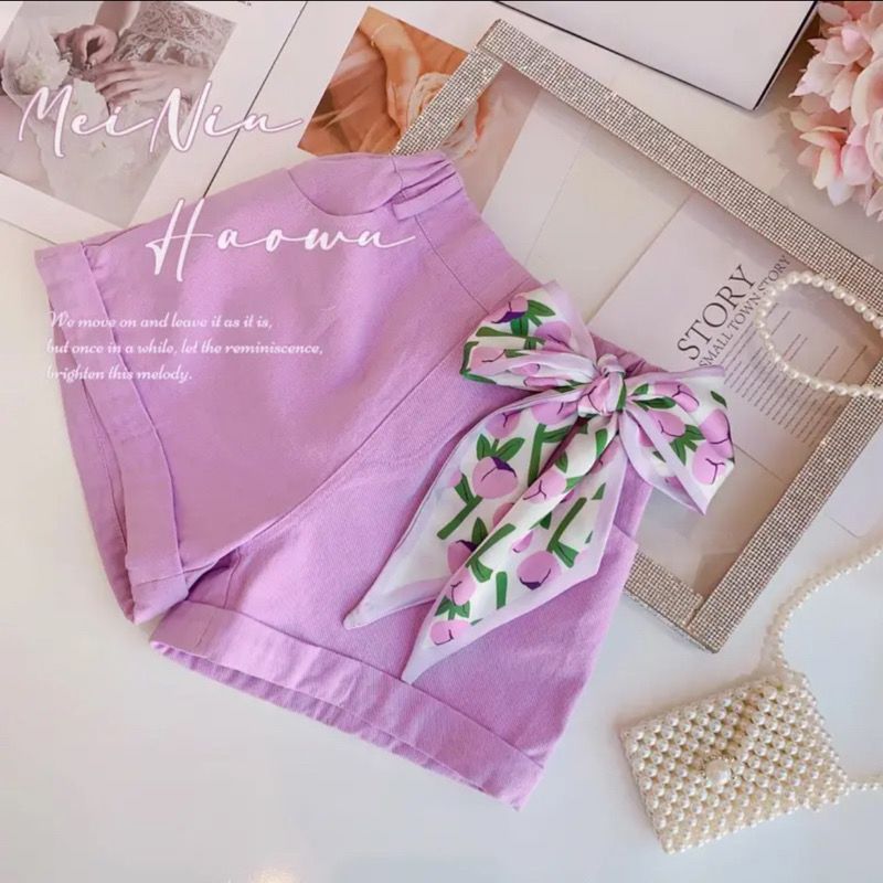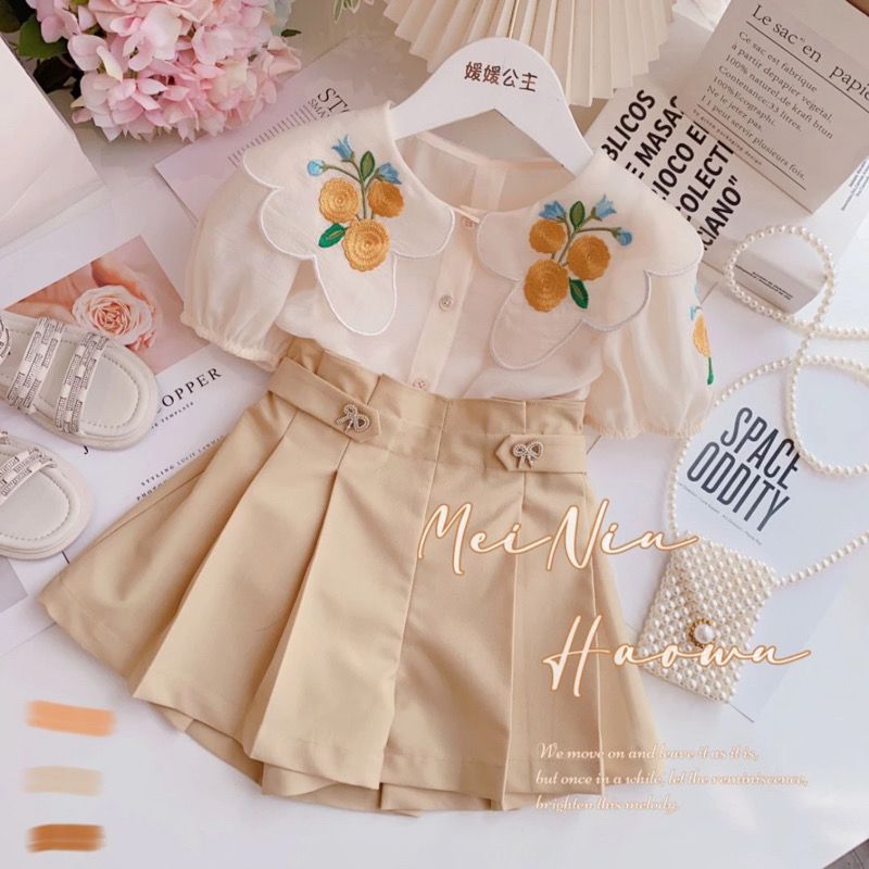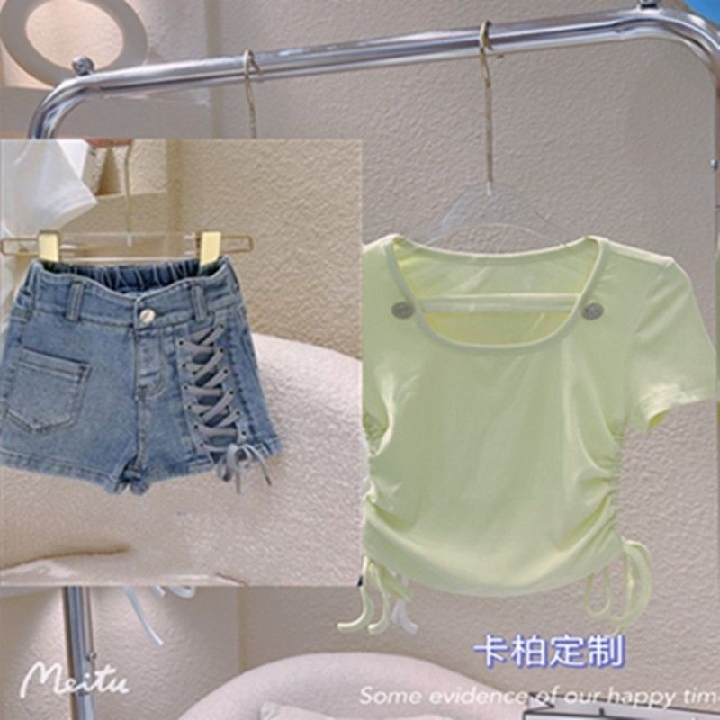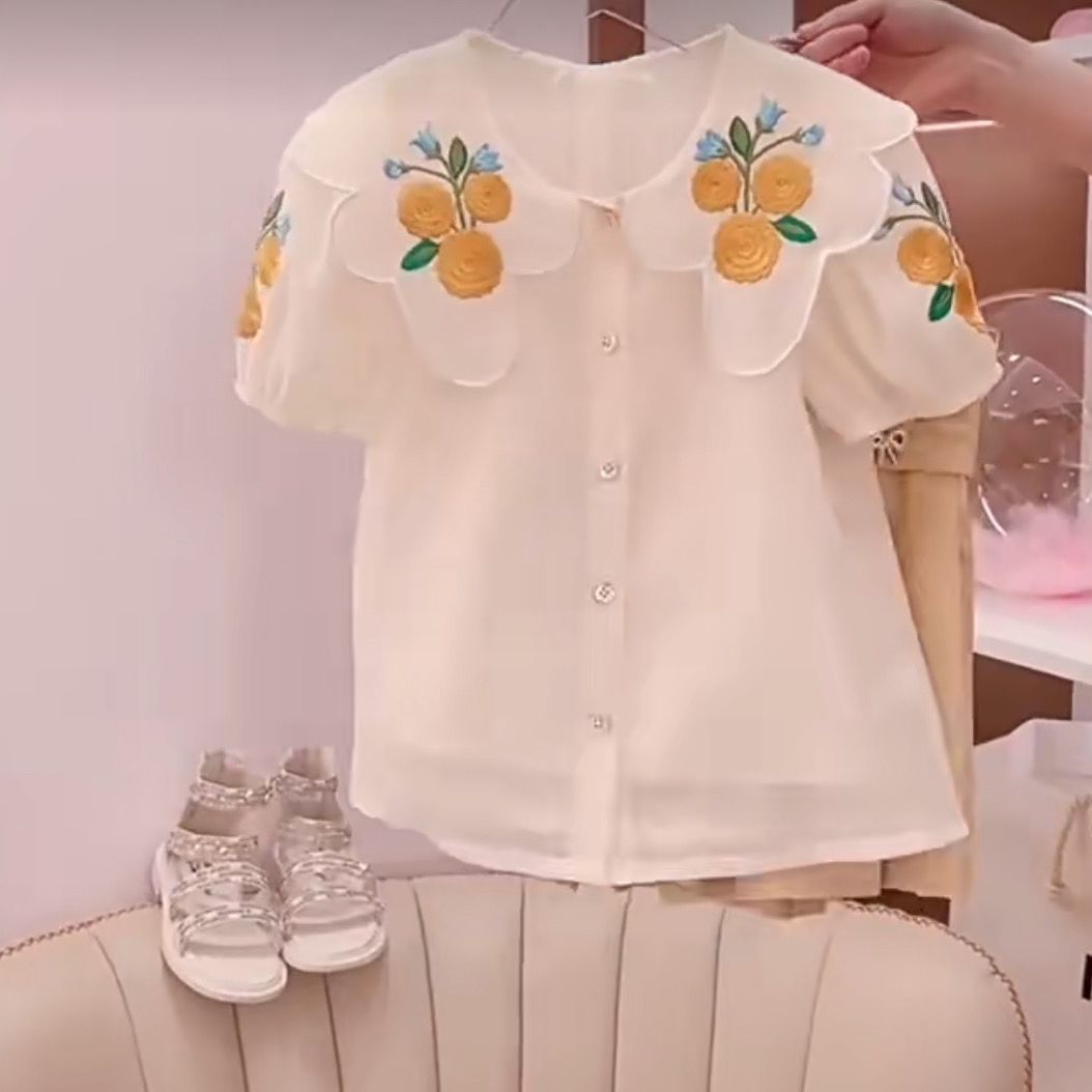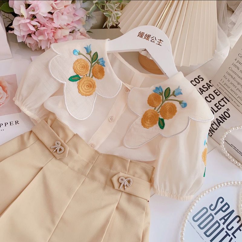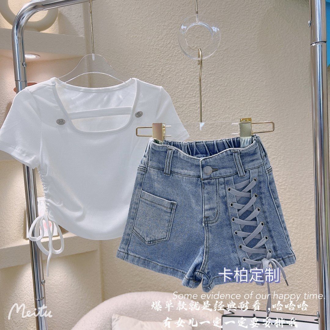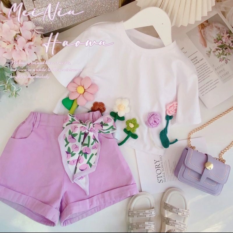 여자 정장 2023 새로운 핑크 인쇄 짧은 소매 투피스 세트 입체 꽃 티셔츠 키즈 캐주얼 짧은스토어 가기
