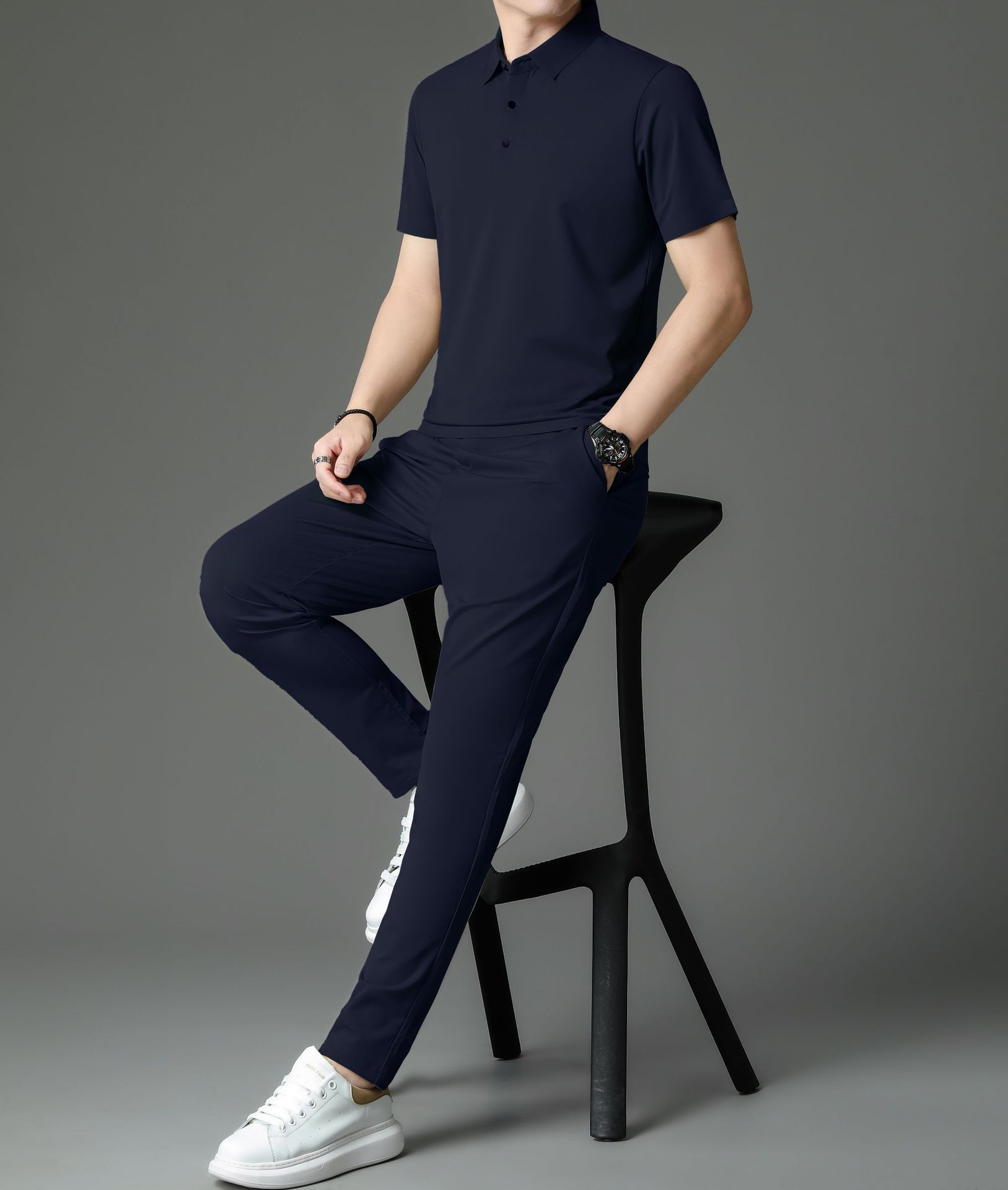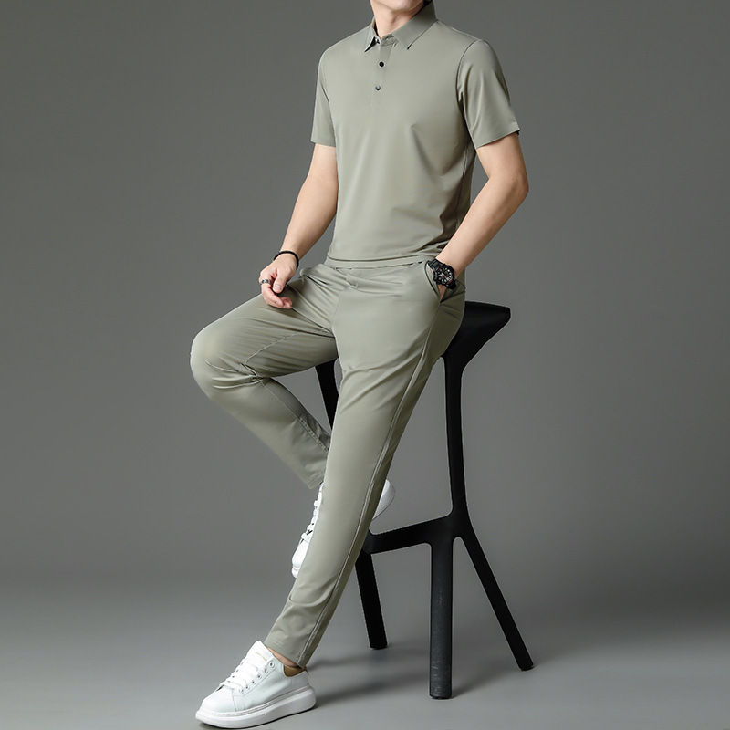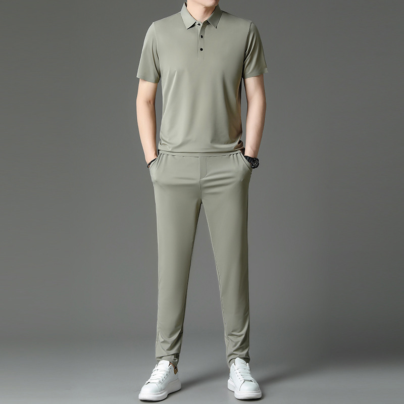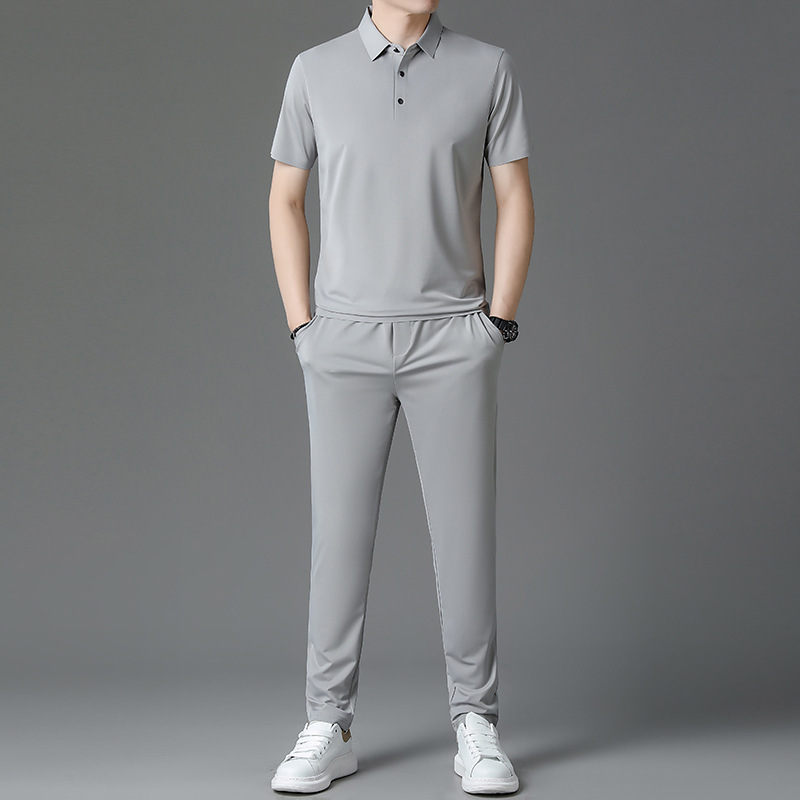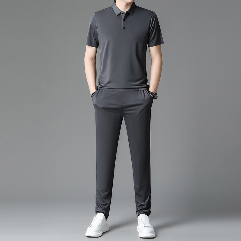 冰丝顺滑男式休闲套装 夏季新品青年短袖翻领T恤运动长裤两件套男