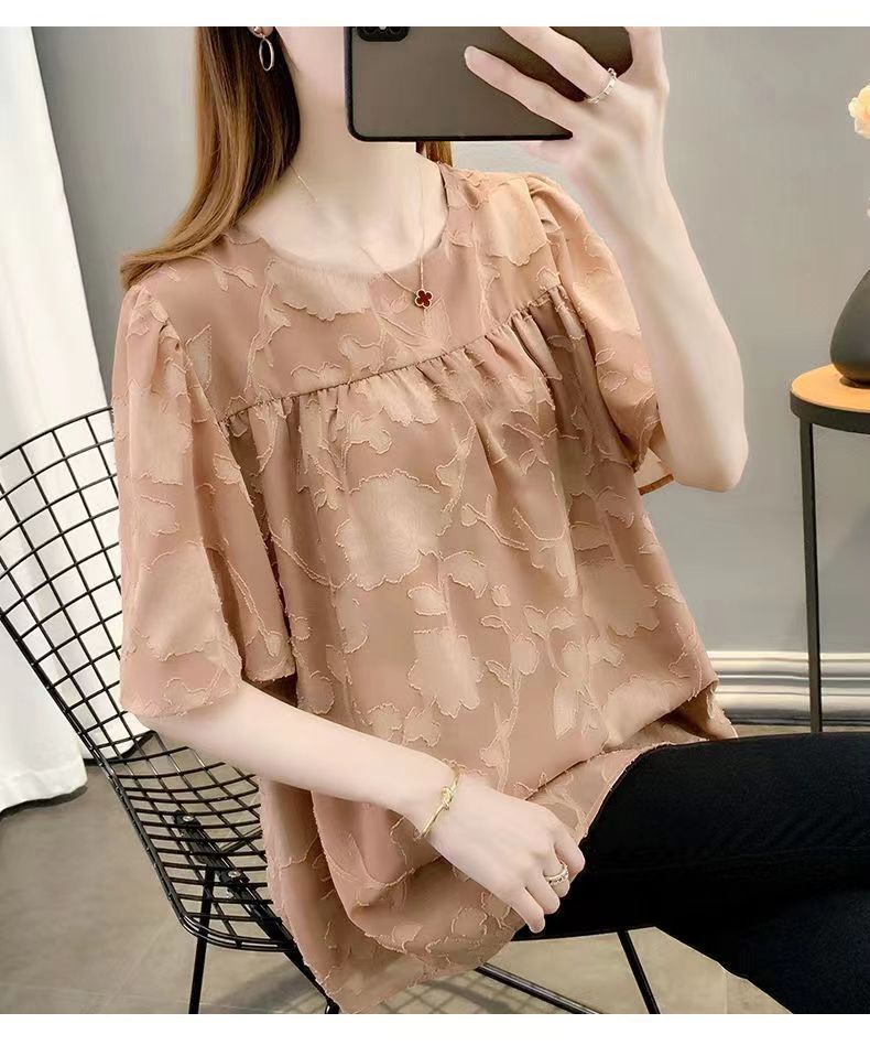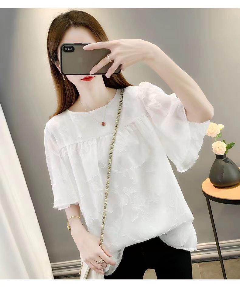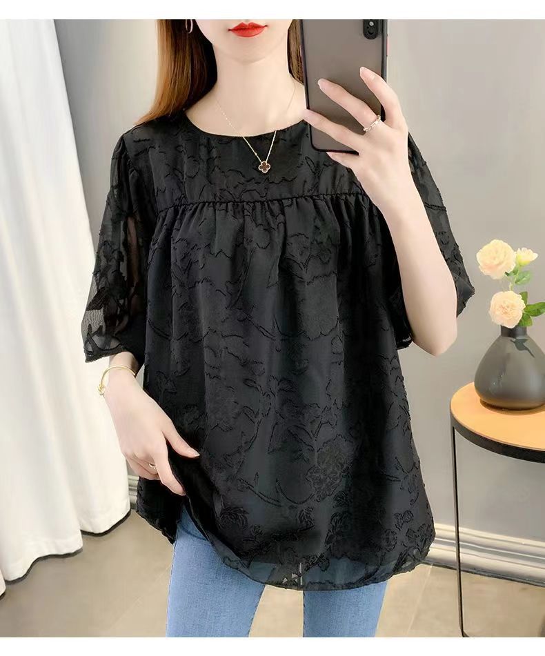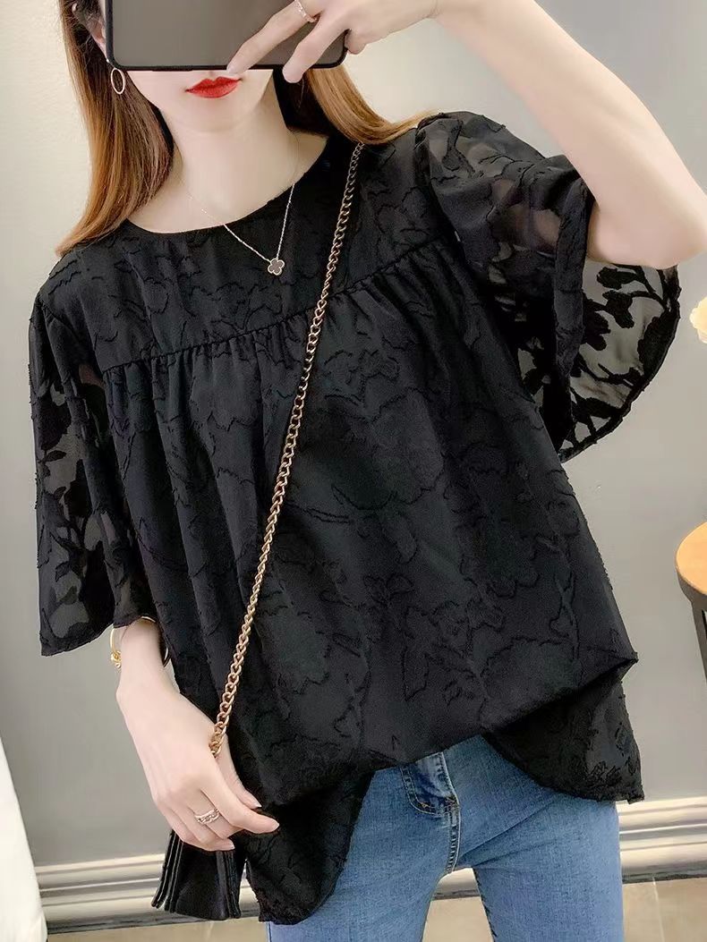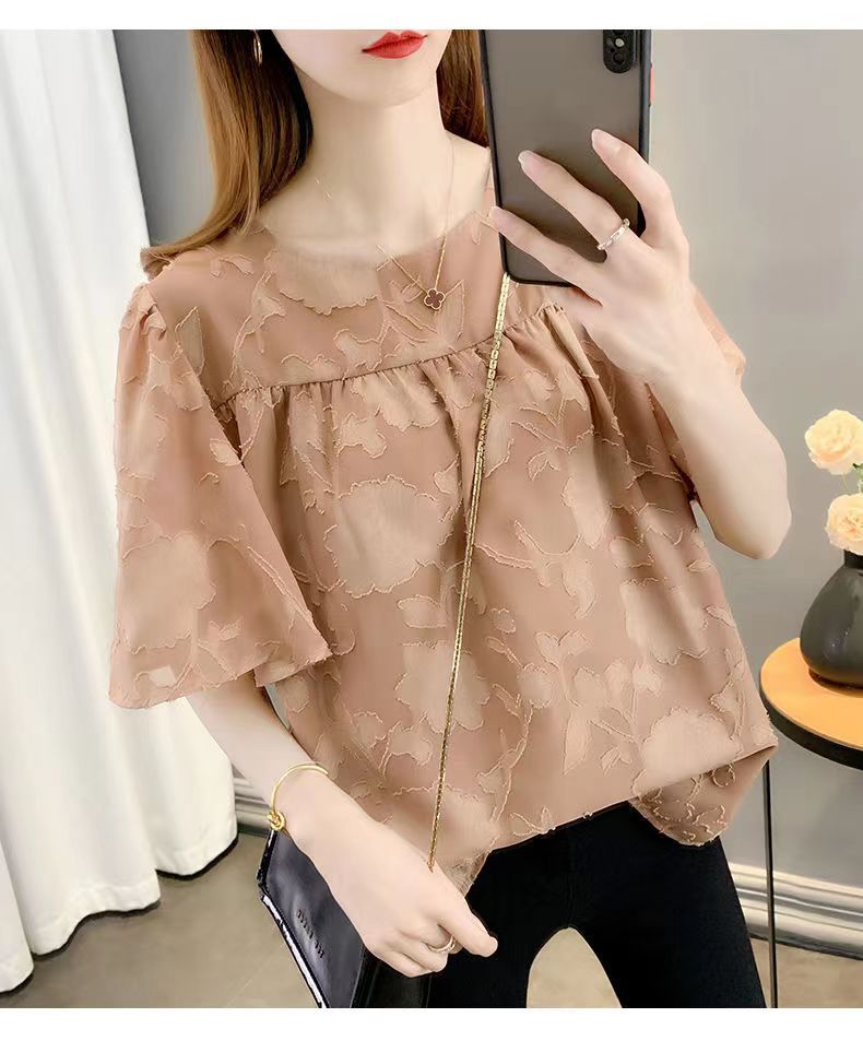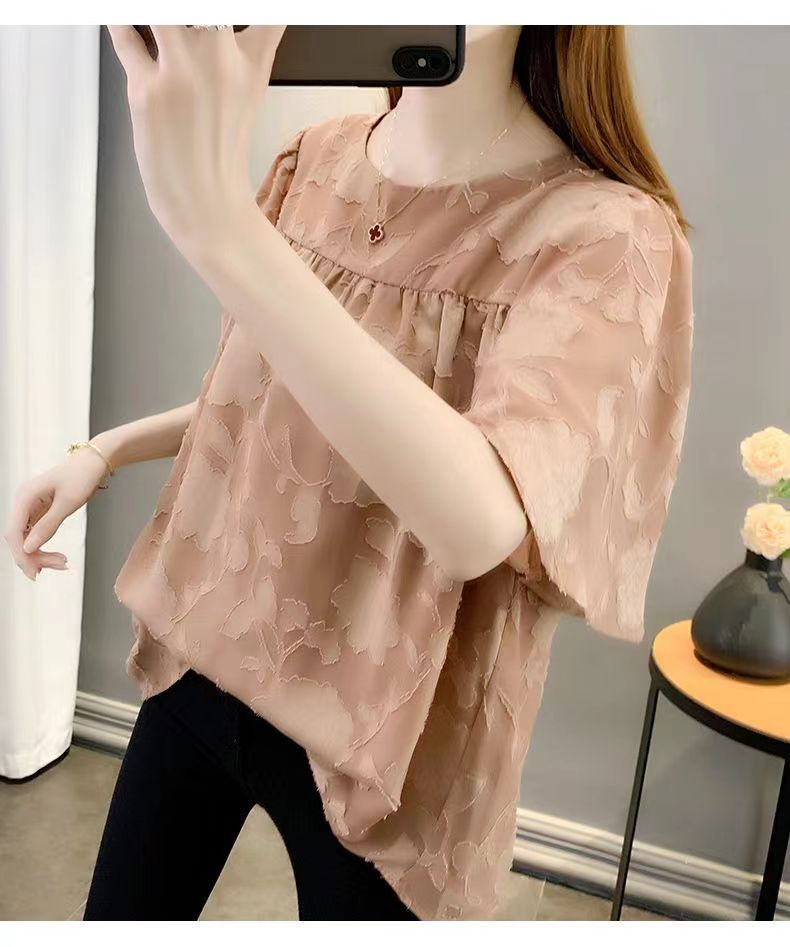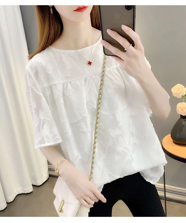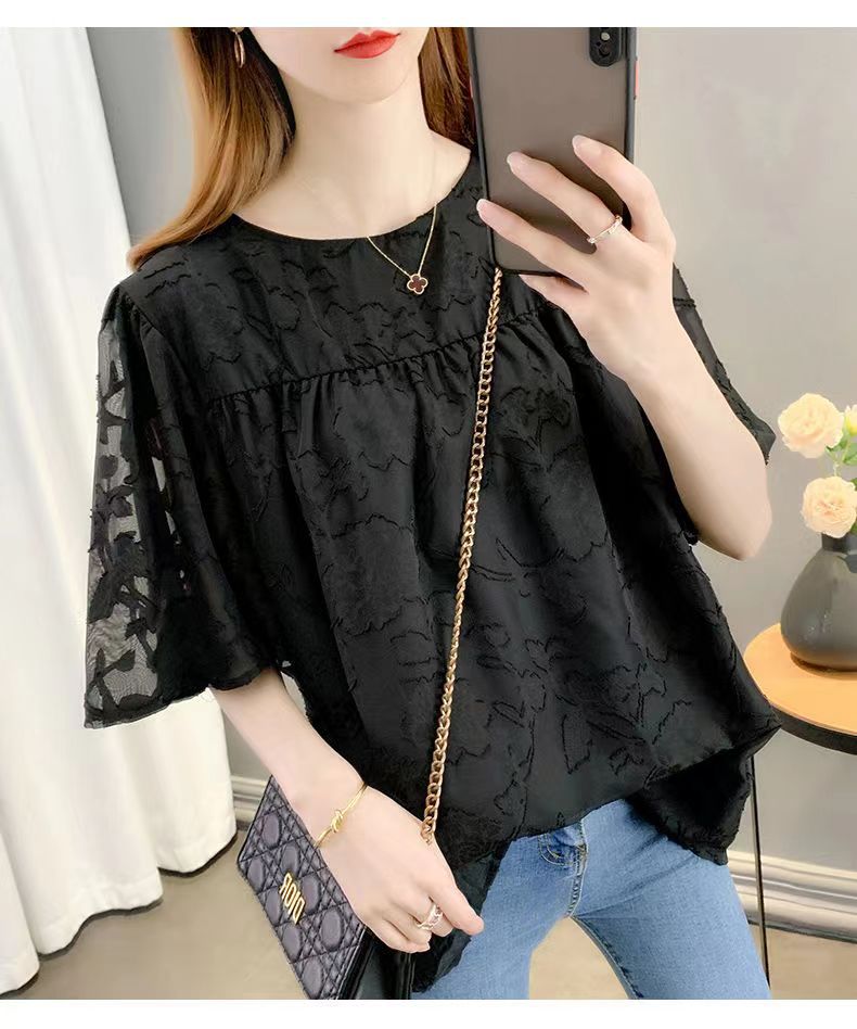 레이스 중공 크로 셰 뜨개질 라운드 넥 짧은 소매 쉬폰 셔츠 봄과 여름 2023 새로운 한국어 느슨한 플러스 사이즈 티셔츠 여성의 탑