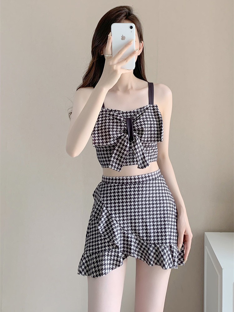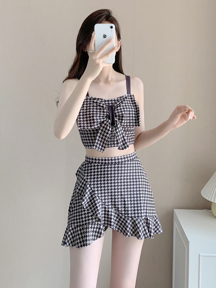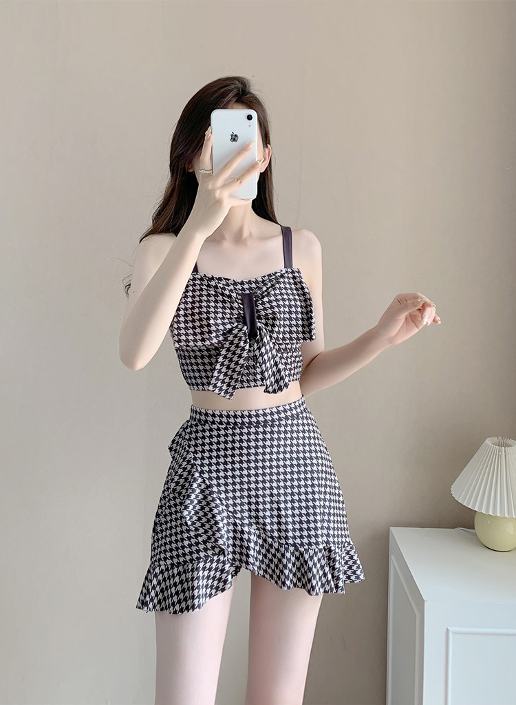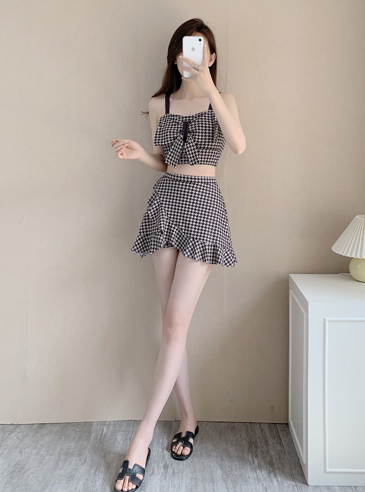 수영복 여성용 스커트 하이 웨이스트 스플릿 섹시한 등이없는 보우 슬링 격자 무늬 여성용 샤넬 스타일 수영복 복서 반바지스토어 가기