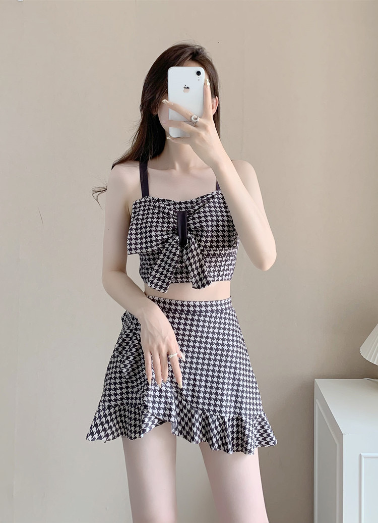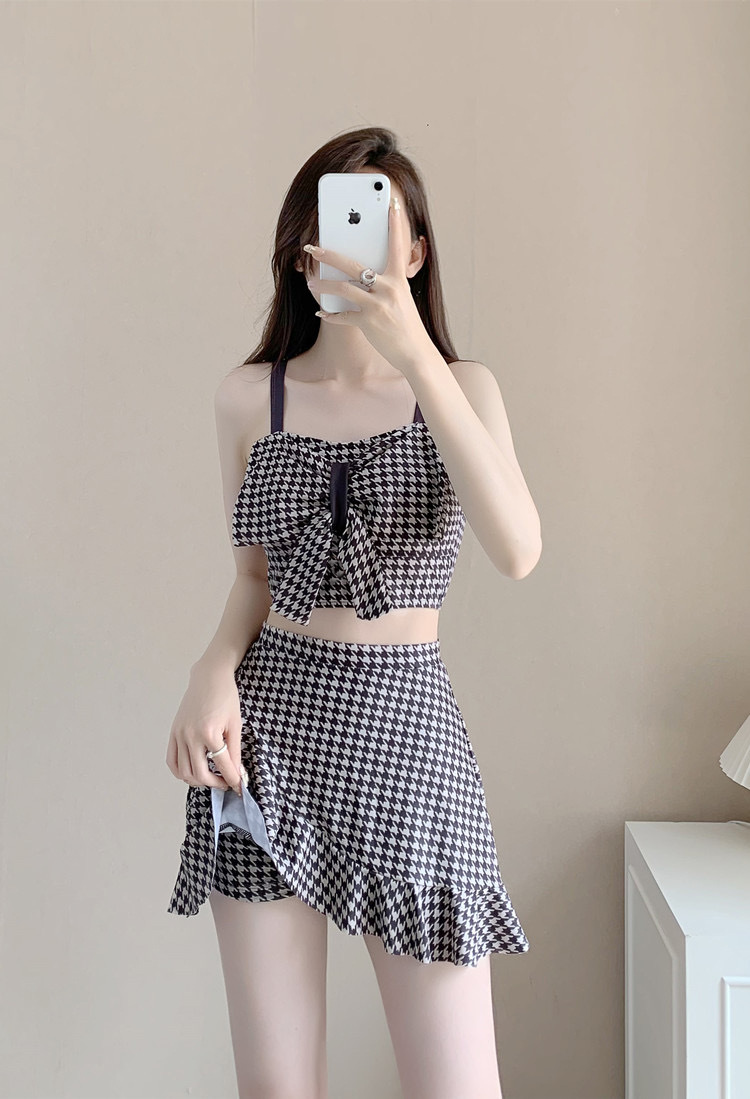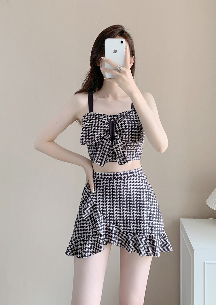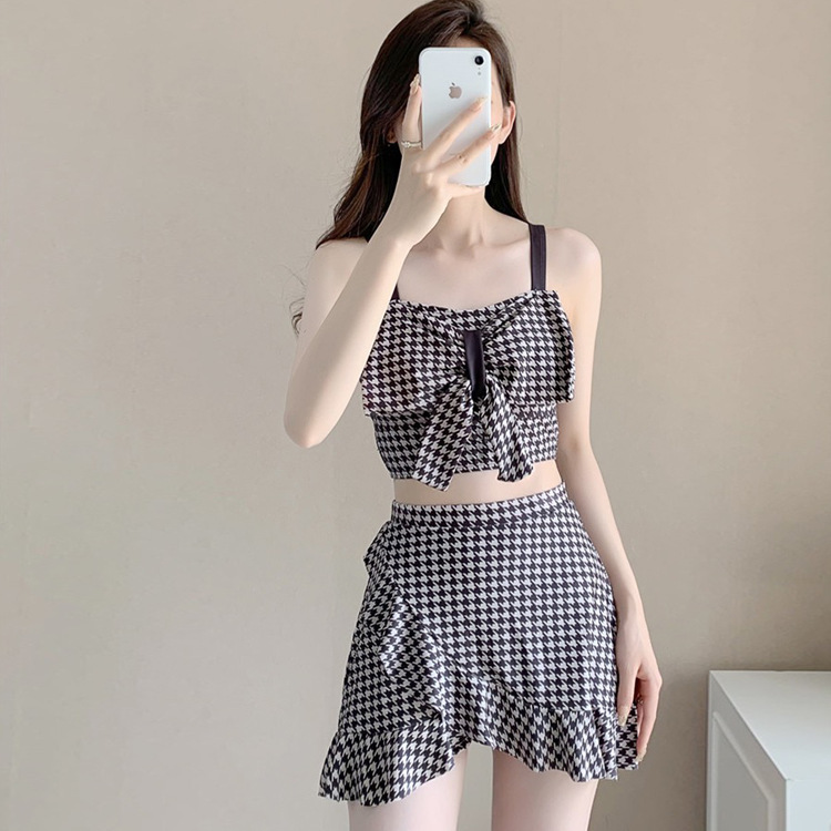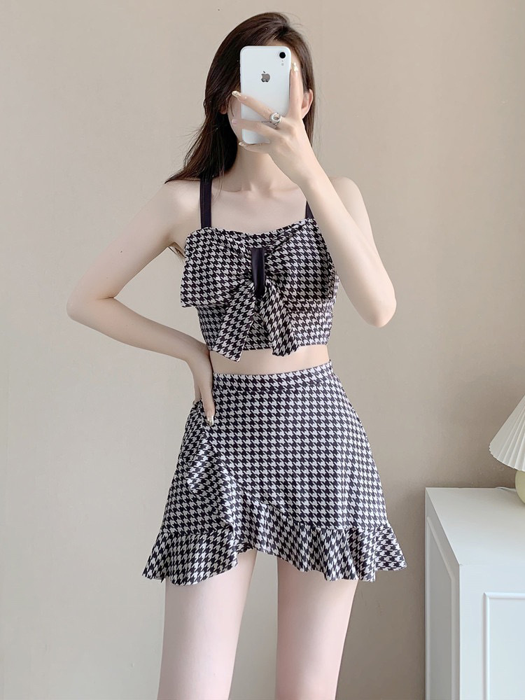 수영복 여성용 스커트 하이 웨이스트 스플릿 섹시한 등이없는 보우 슬링 격자 무늬 여성용 샤넬 스타일 수영복 복서 반바지스토어 가기