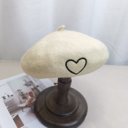 甜美可爱韩系爱心刺绣羊毛贝雷帽女秋冬网红画家帽显脸小头围亲子