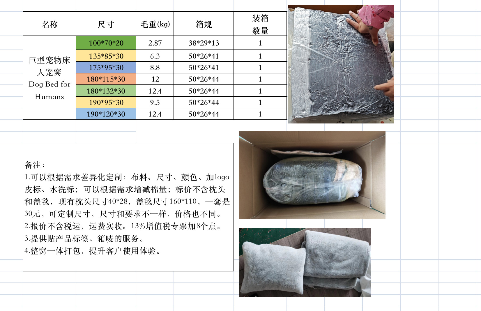 人狗床可定制尺寸、颜色、布料,加水洗标,可代贴产品条码和箱唛,可配套枕头和毯子,可任意定制尺寸。同款长毛布料人宠床也可以做。