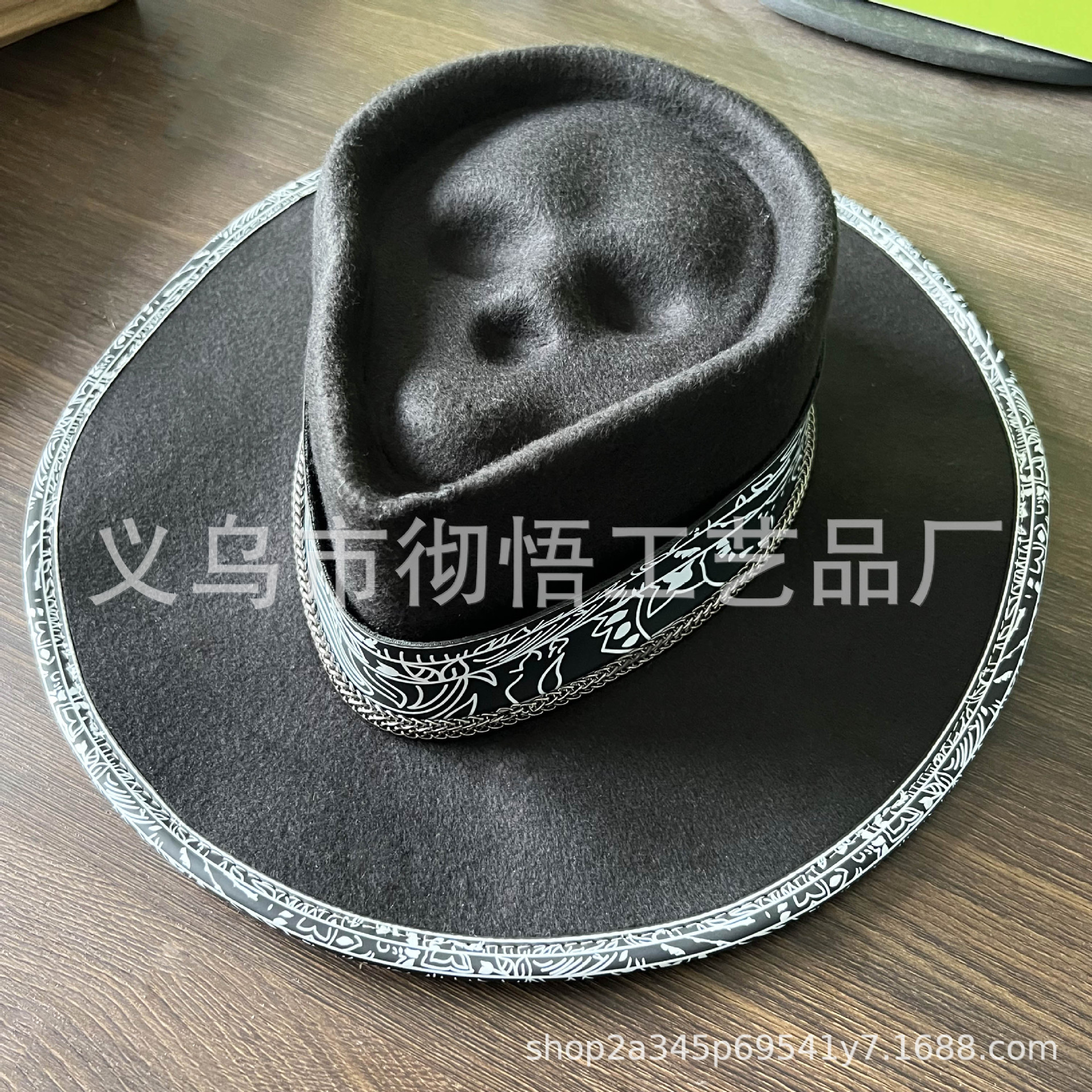 独立站跨境“悲伤的收割者”手工骷髅帽毛毡牛仔帽万圣节新款2023