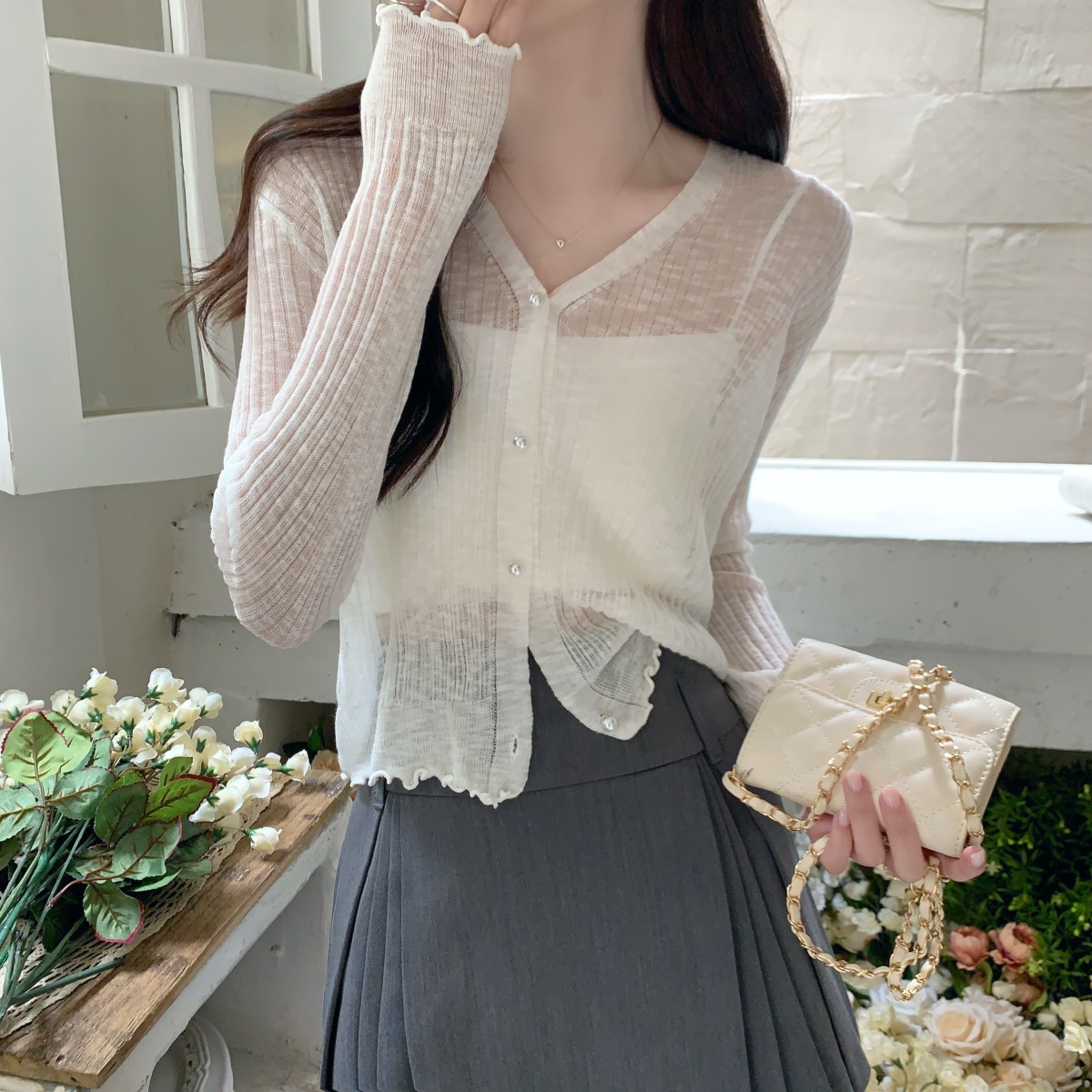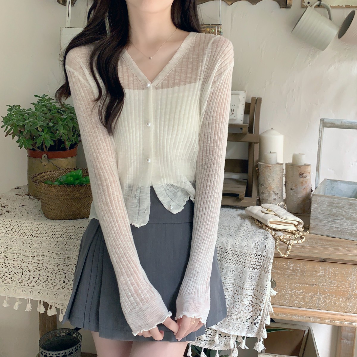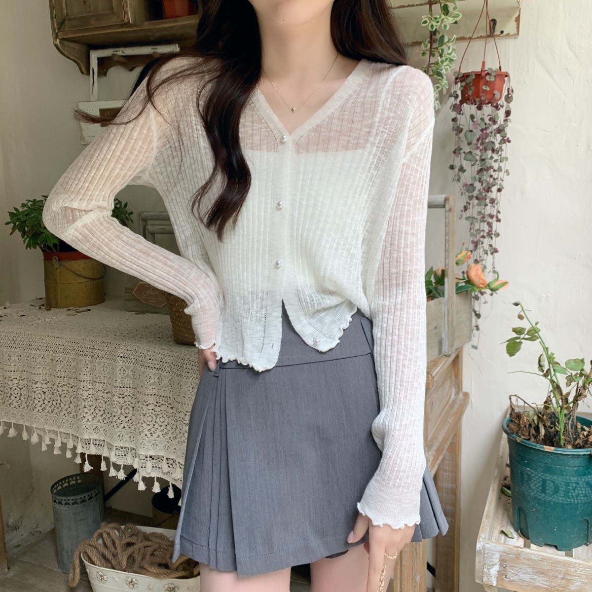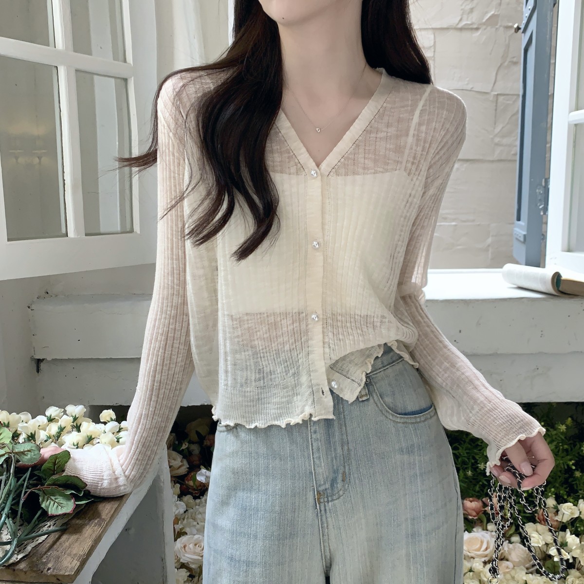 3579#防晒衣开衫女薄款宽松木耳边外搭吊带裙披肩短款针织冰丝衫