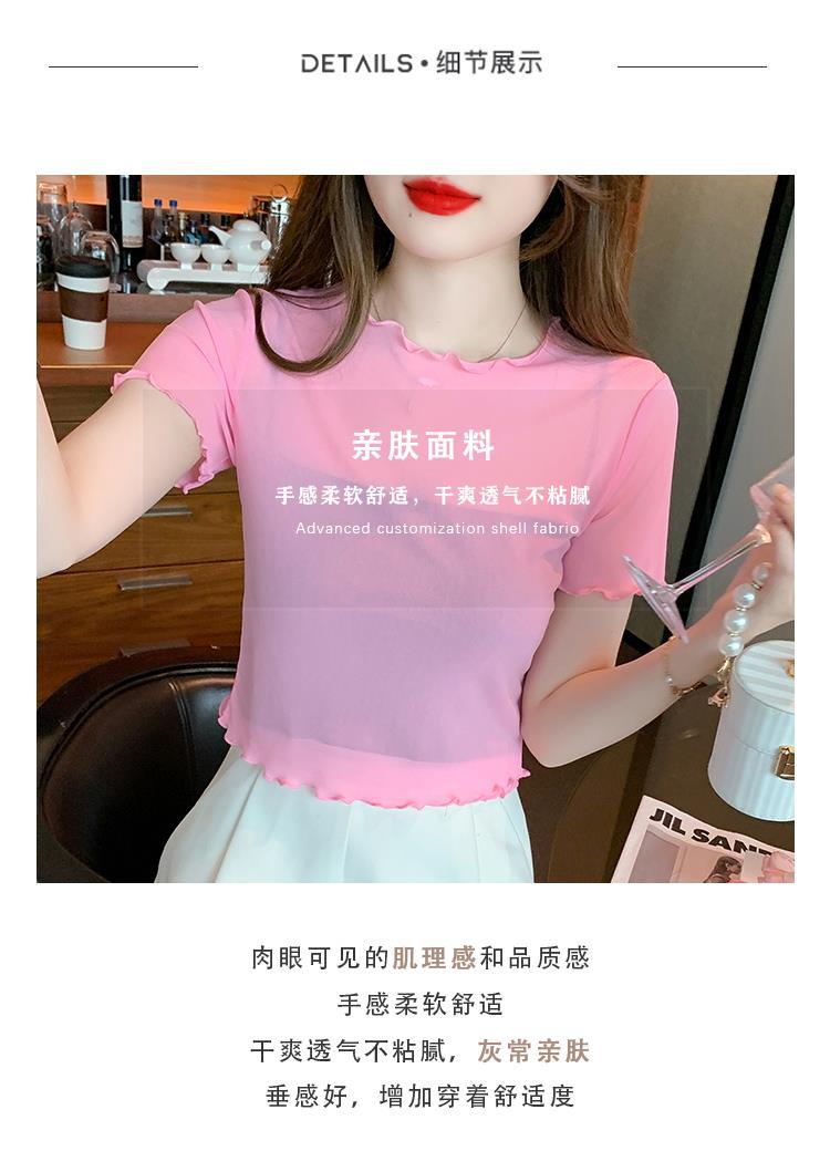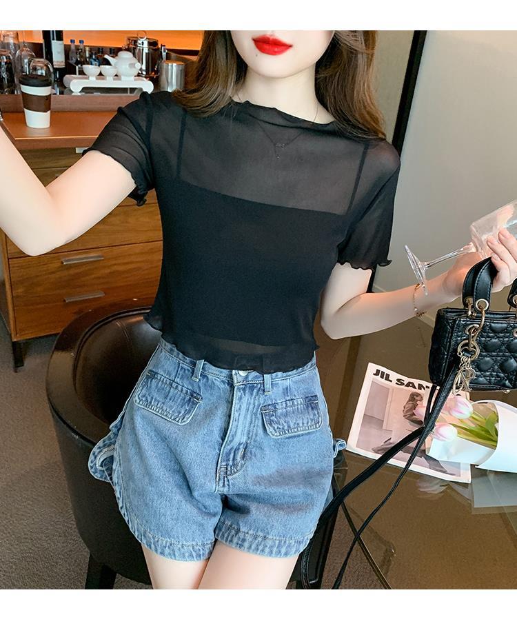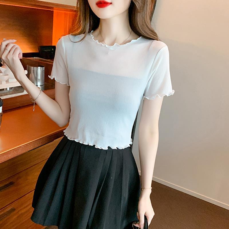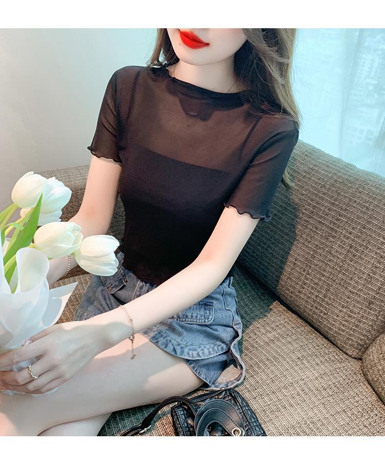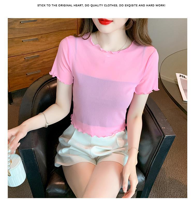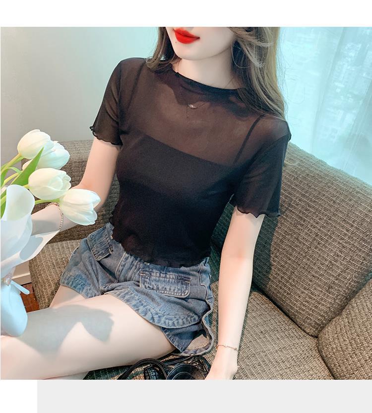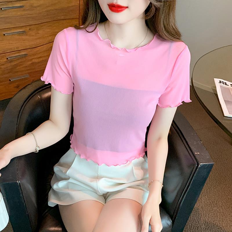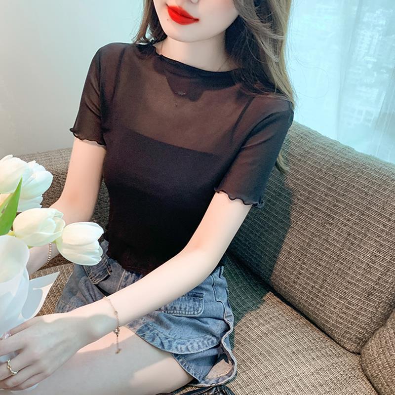 2023 여름 새로운 솔리드 컬러 올매치 짧은 슬림핏 슬리밍 블라우스 시스루 메쉬 여성용 반팔 내부 티셔츠스토어 가기