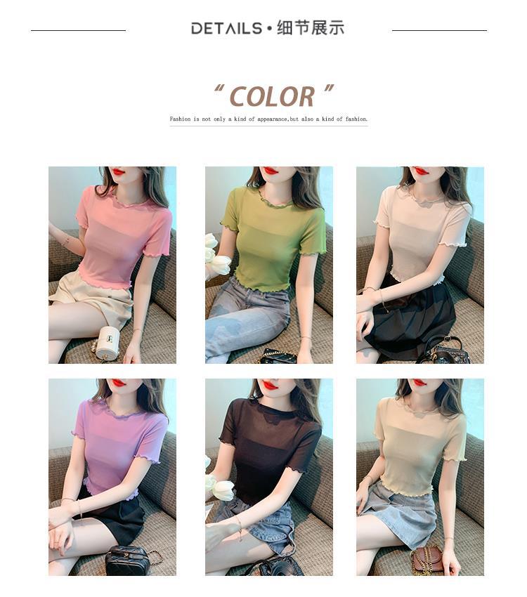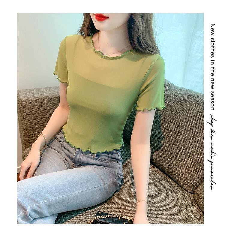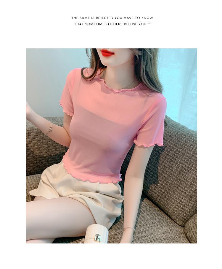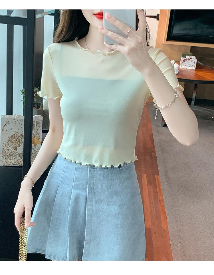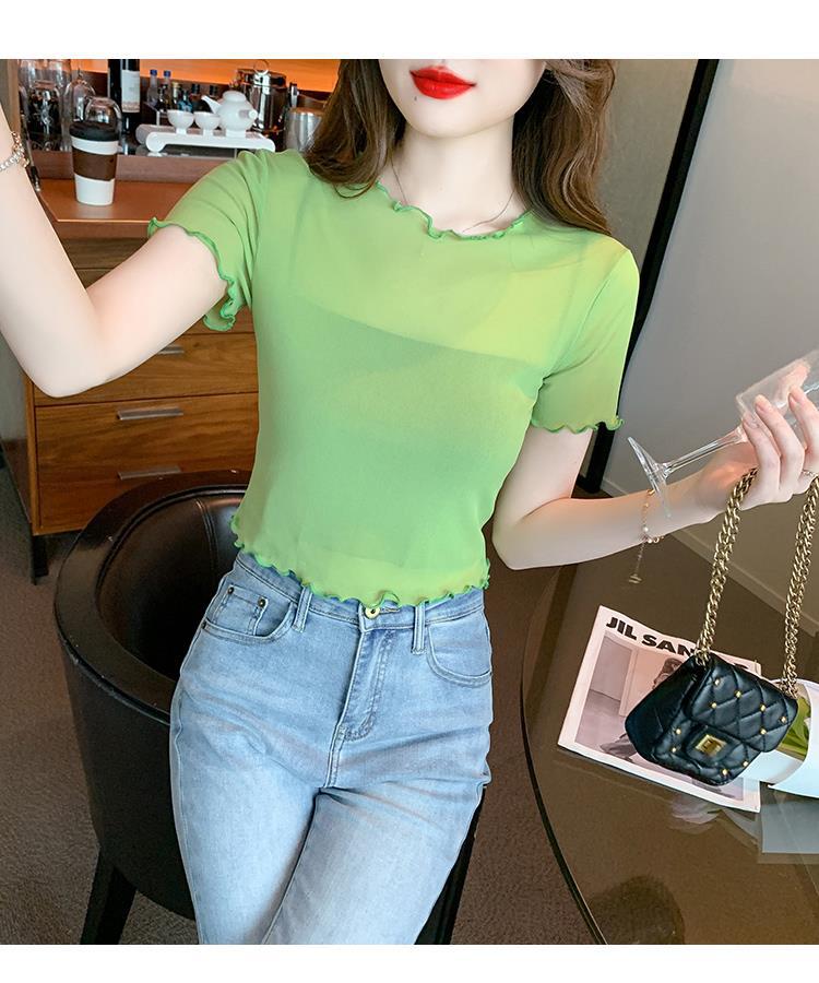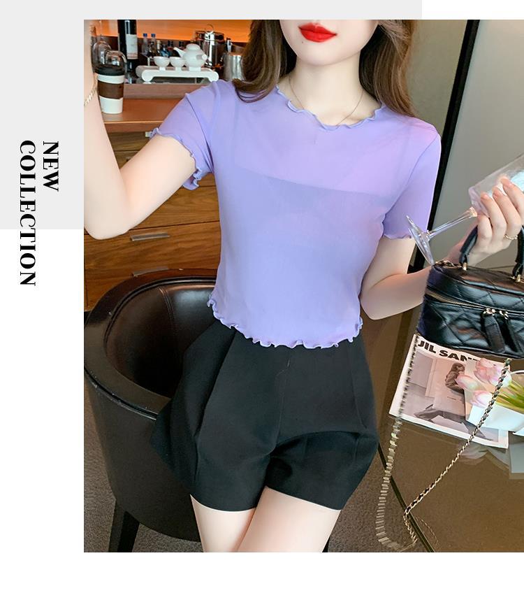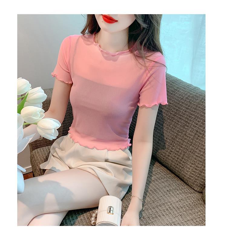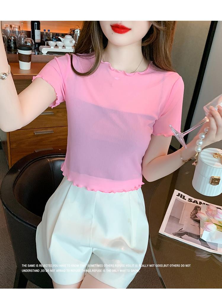 2023 여름 새로운 솔리드 컬러 올매치 짧은 슬림핏 슬리밍 블라우스 시스루 메쉬 여성용 반팔 내부 티셔츠스토어 가기