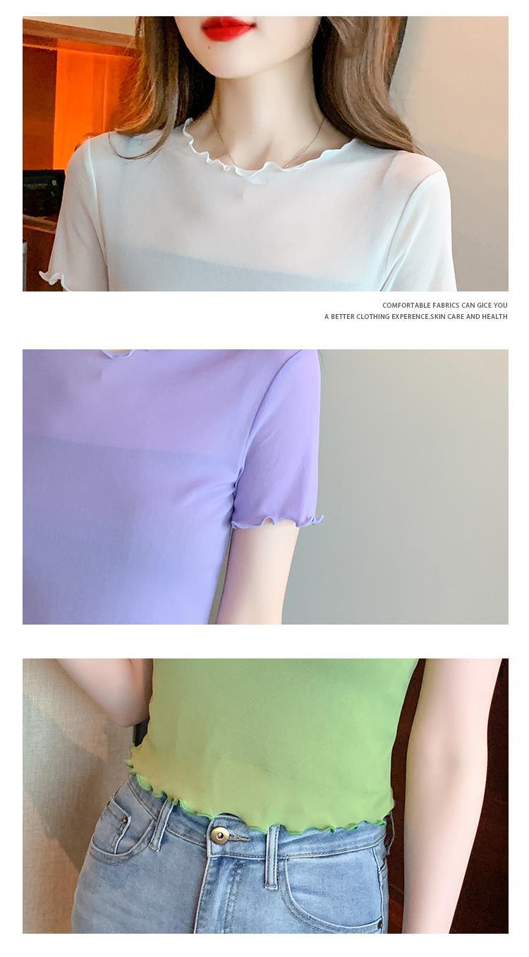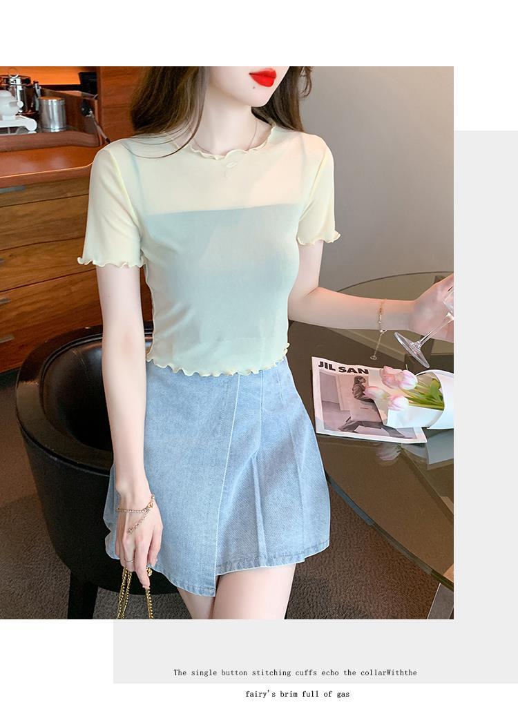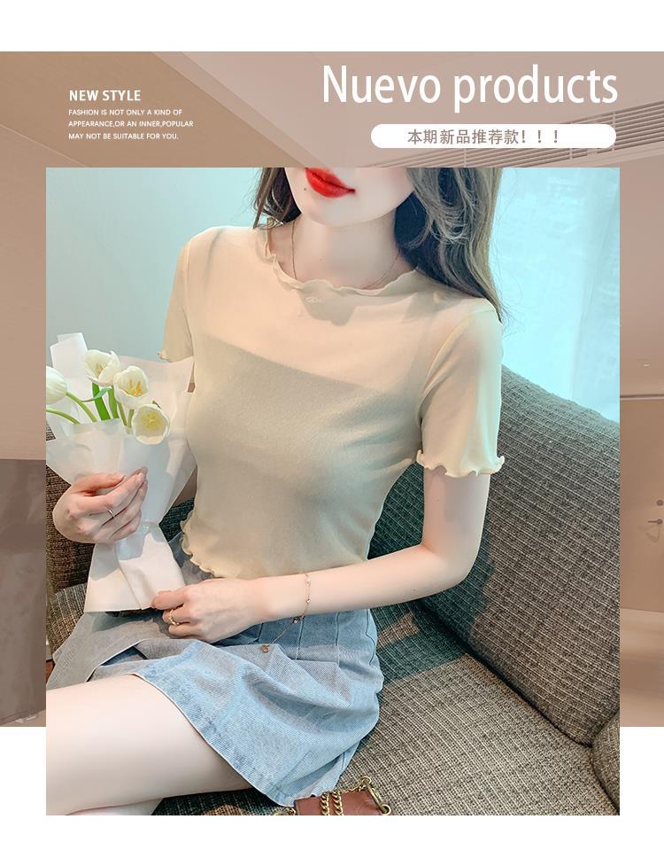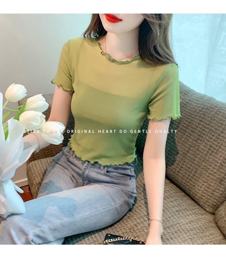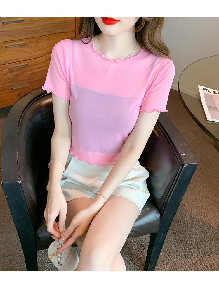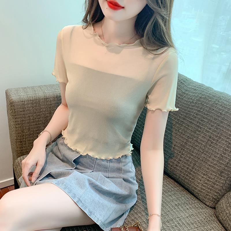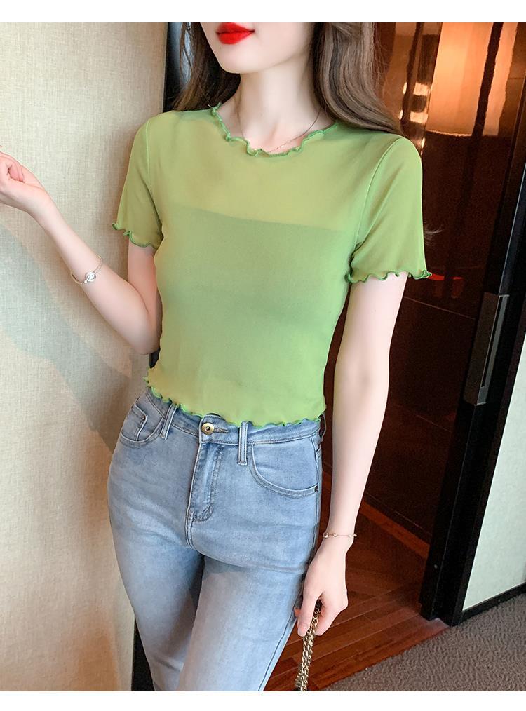 2023 여름 새로운 솔리드 컬러 올매치 짧은 슬림핏 슬리밍 블라우스 시스루 메쉬 여성용 반팔 내부 티셔츠스토어 가기