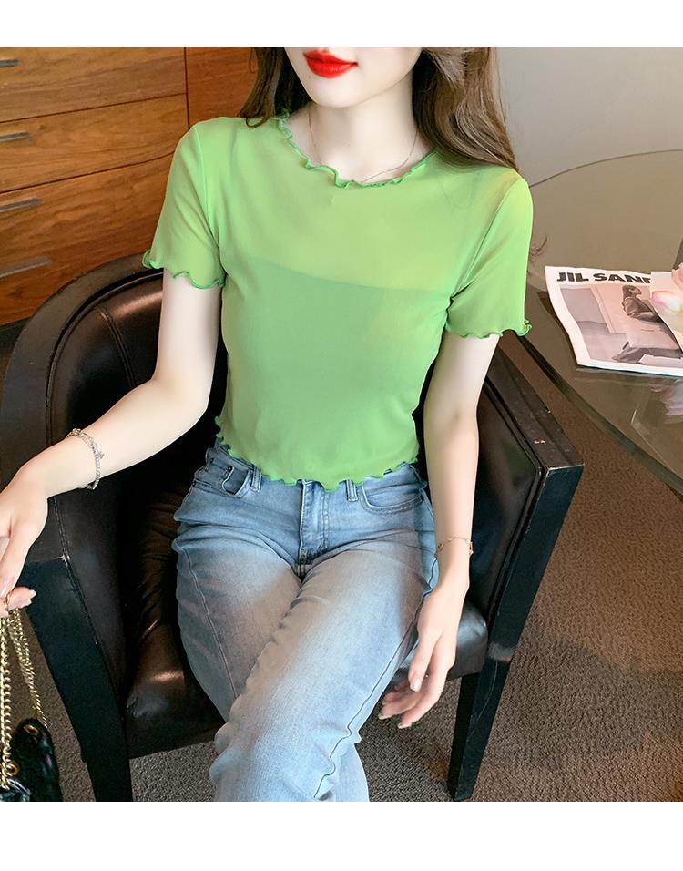 2023 여름 새로운 솔리드 컬러 올매치 짧은 슬림핏 슬리밍 블라우스 시스루 메쉬 여성용 반팔 내부 티셔츠