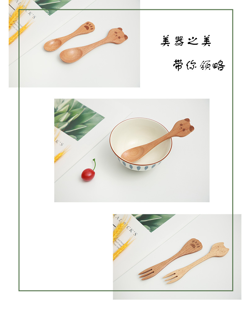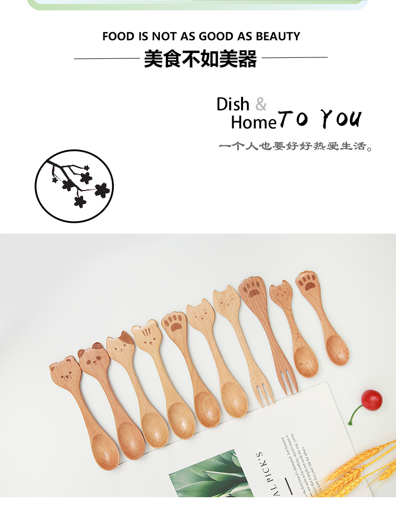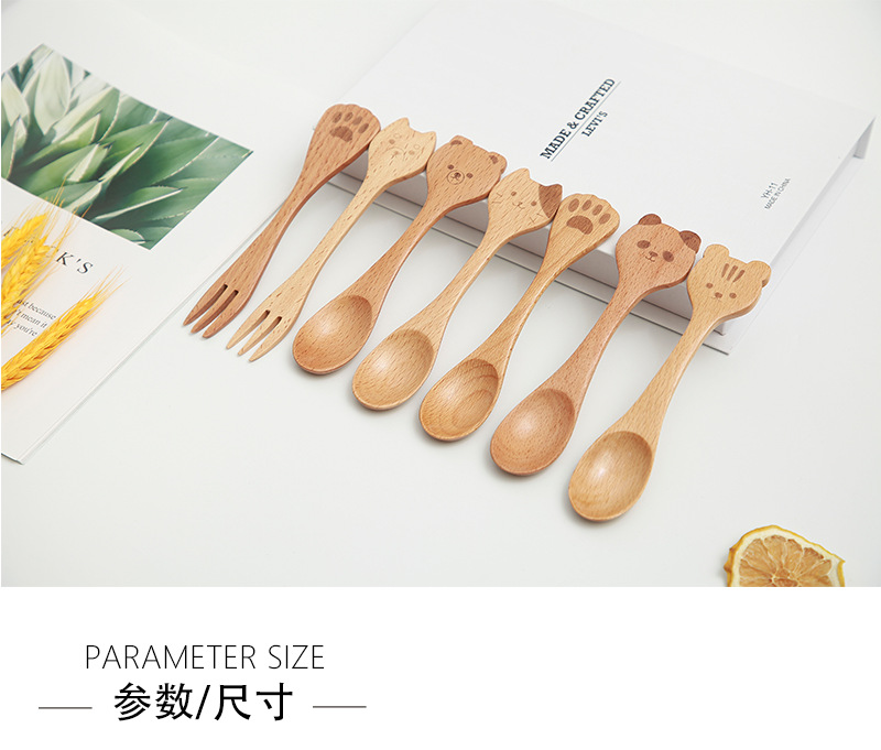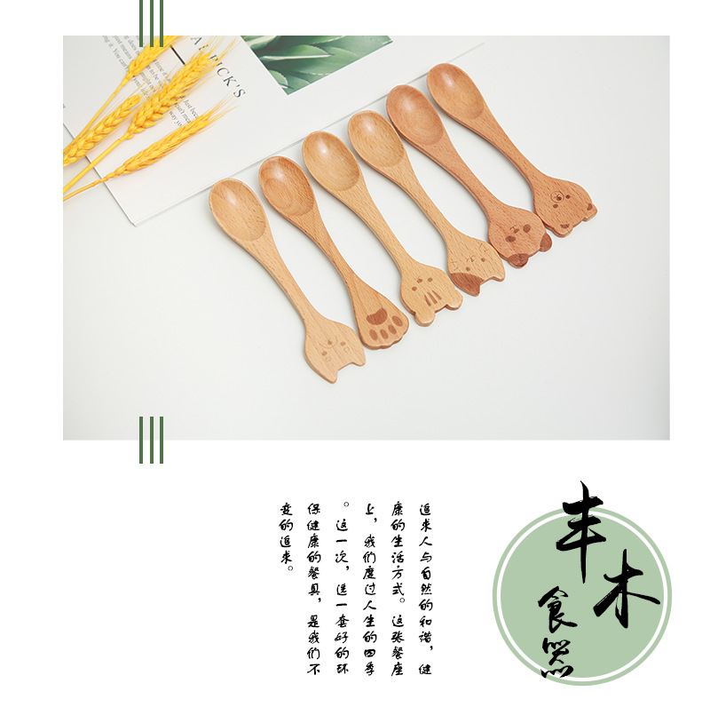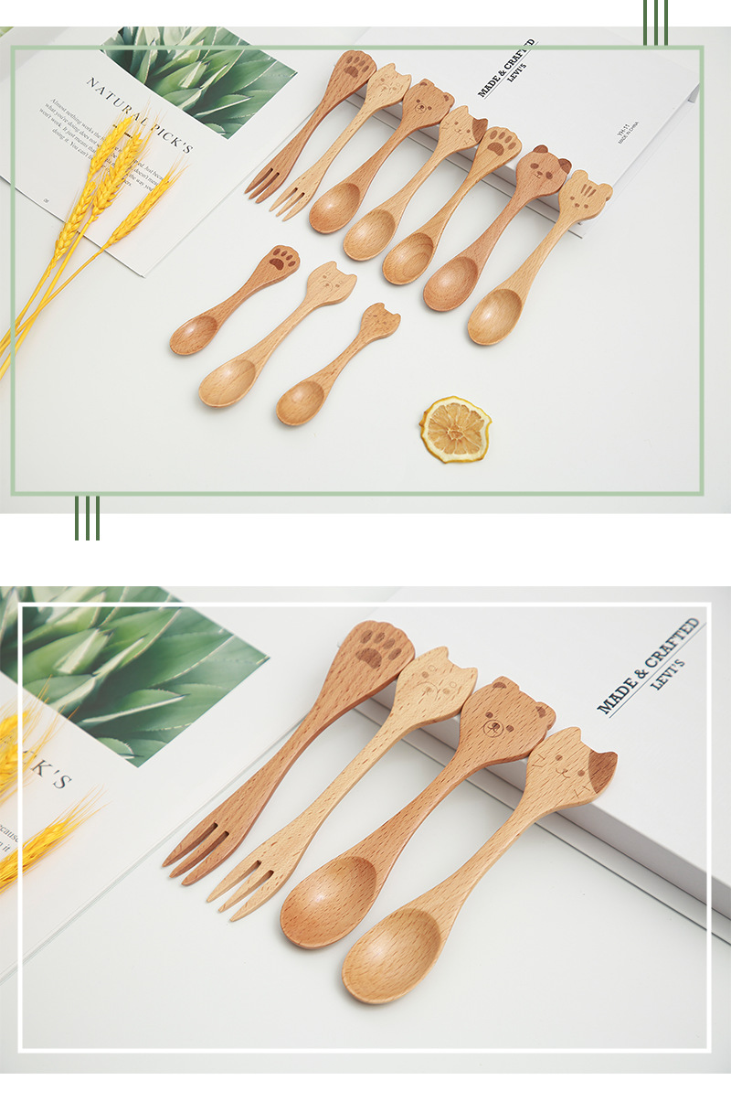 일본식 창조적 인 나무 커피 동물 숟가락 포크 샐러드 휴대용 혼합 숟가락 너도밤 나무 색깔 어린이 나무 숟가락 새겨진 로고스토어 가기