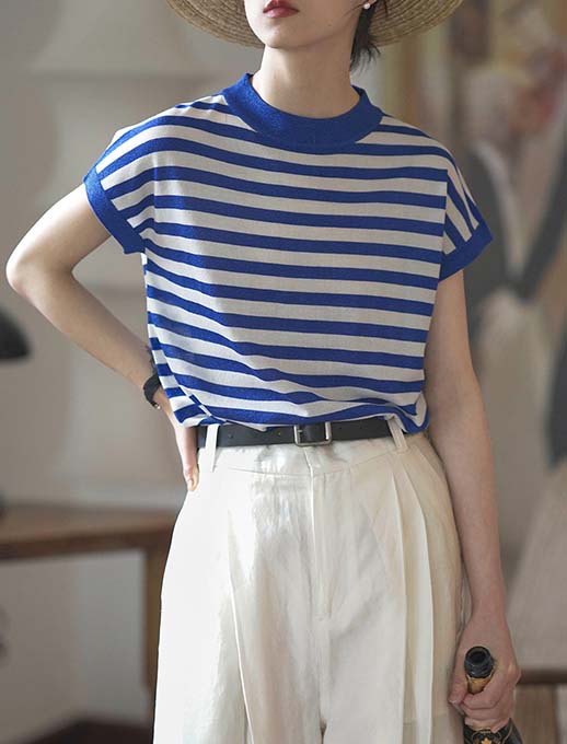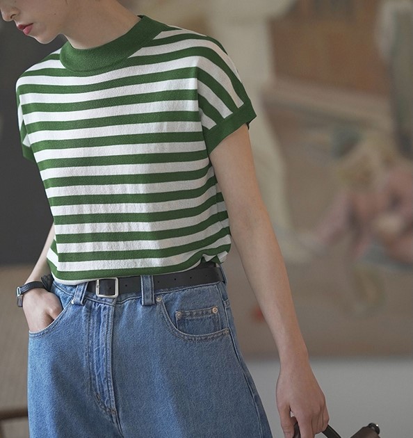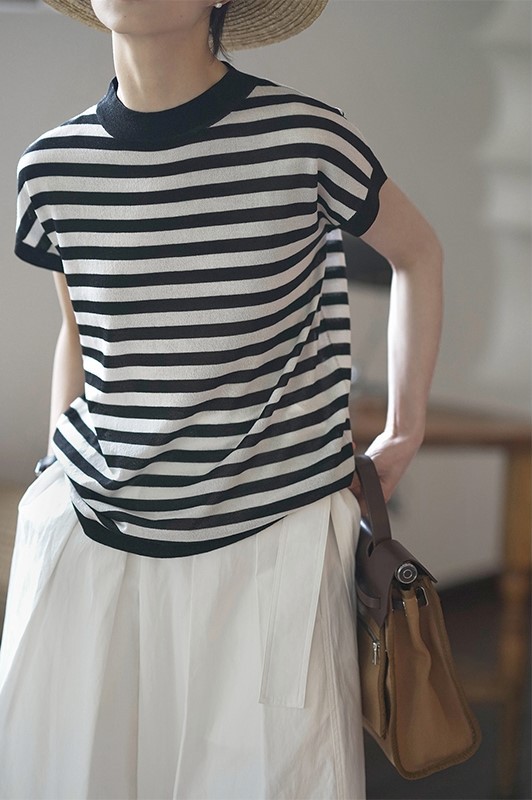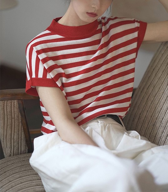 여름 프랑스 스트라이프 숄더 바디 티셔츠 니트 반팔 여성용 독특한 디자인 루즈한 탑 여성용 풀오버 아이스 실크 얇은스토어 가기
