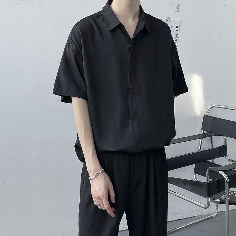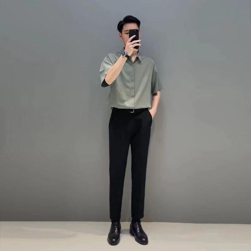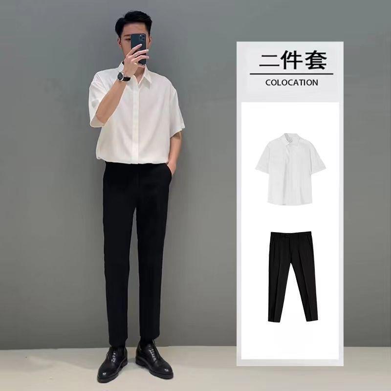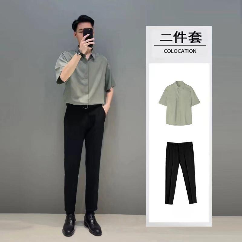 비 다림질 드레이핑 반팔 셔츠 남성용 아이스 실크 여름 세트 가벼운 성숙한 바람 세트 느슨한 셔츠 남성스토어 가기