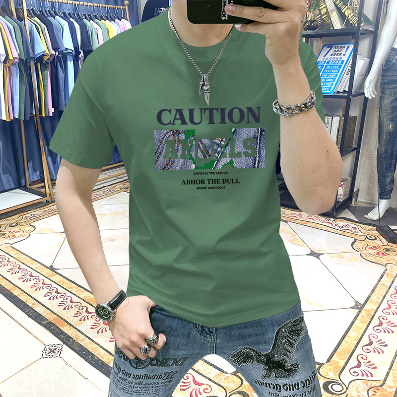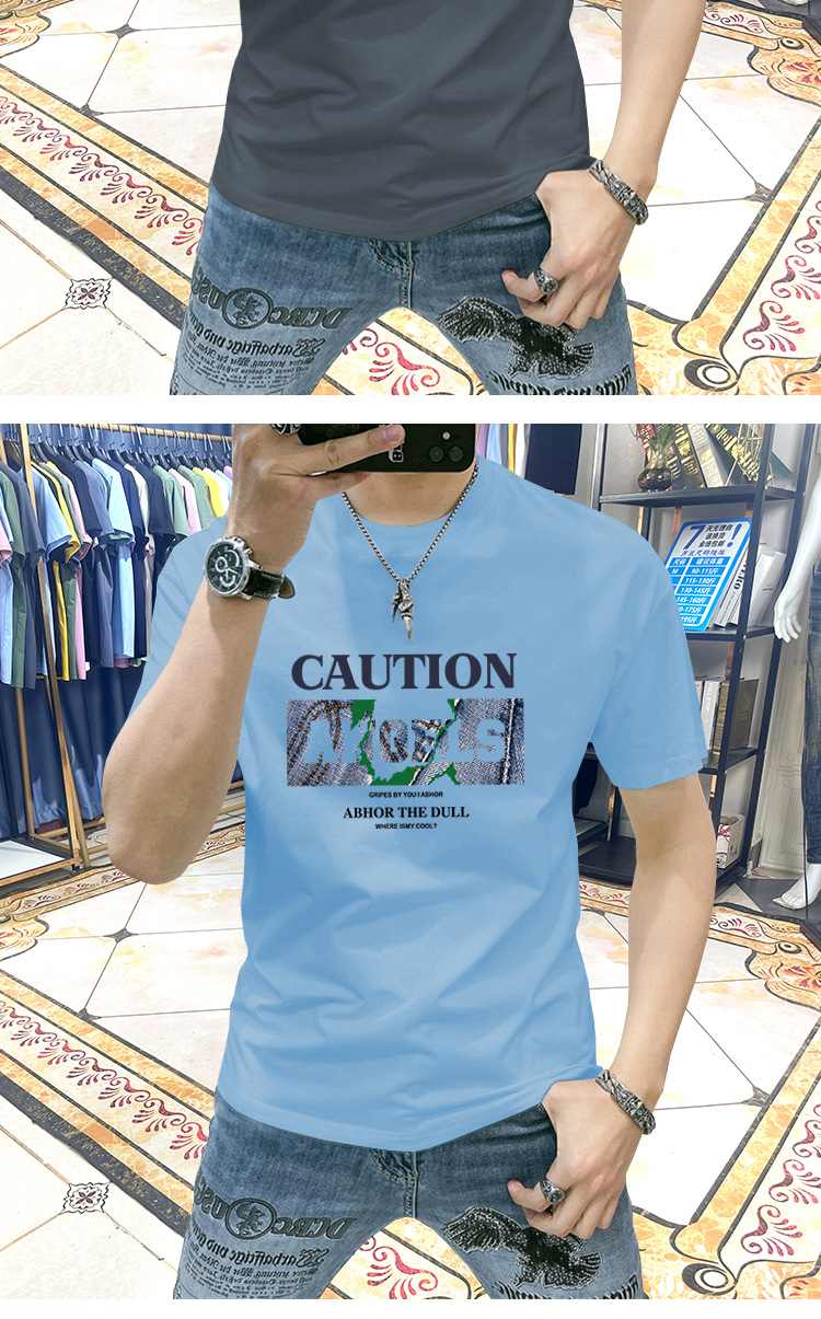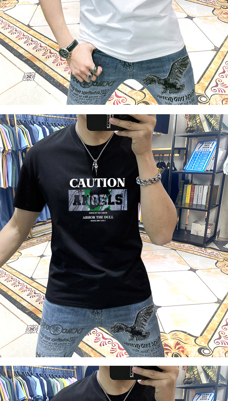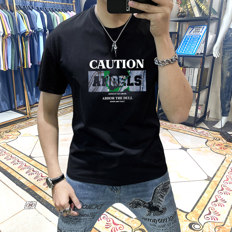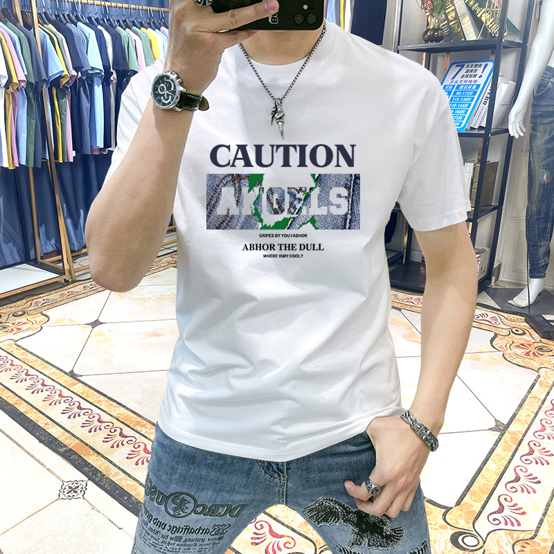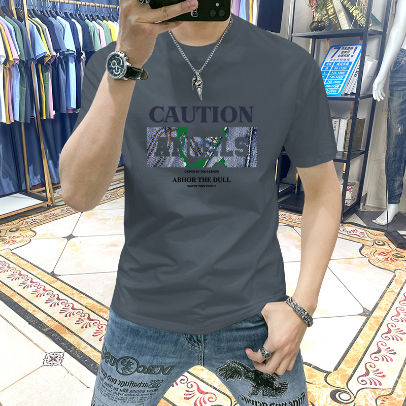 남성용 티셔츠 반팔 2023 New 데님 레터 프린트 슬림핏 잘생긴 슬림핏 탑 남성용 티셔츠스토어 가기