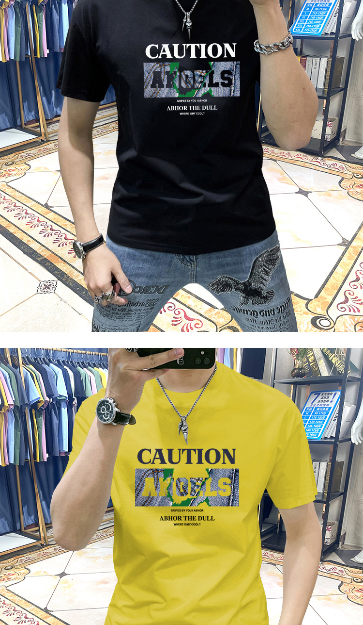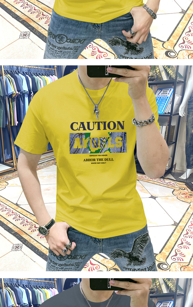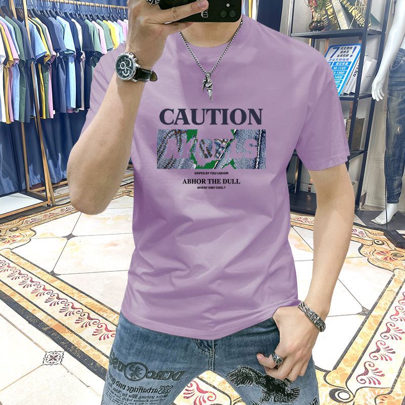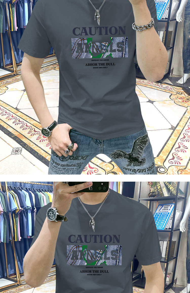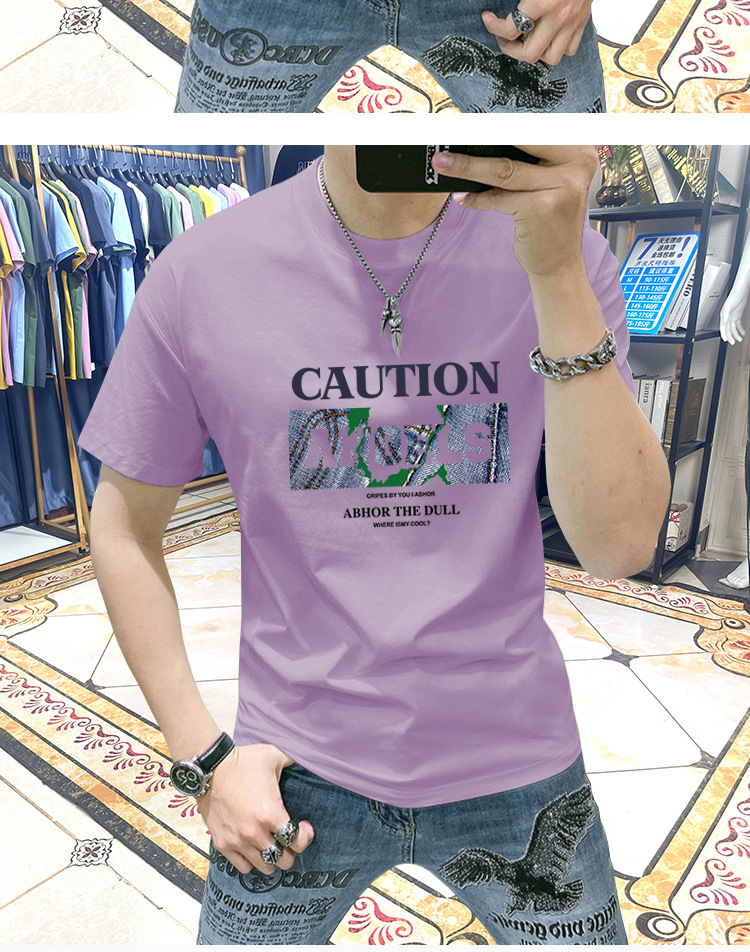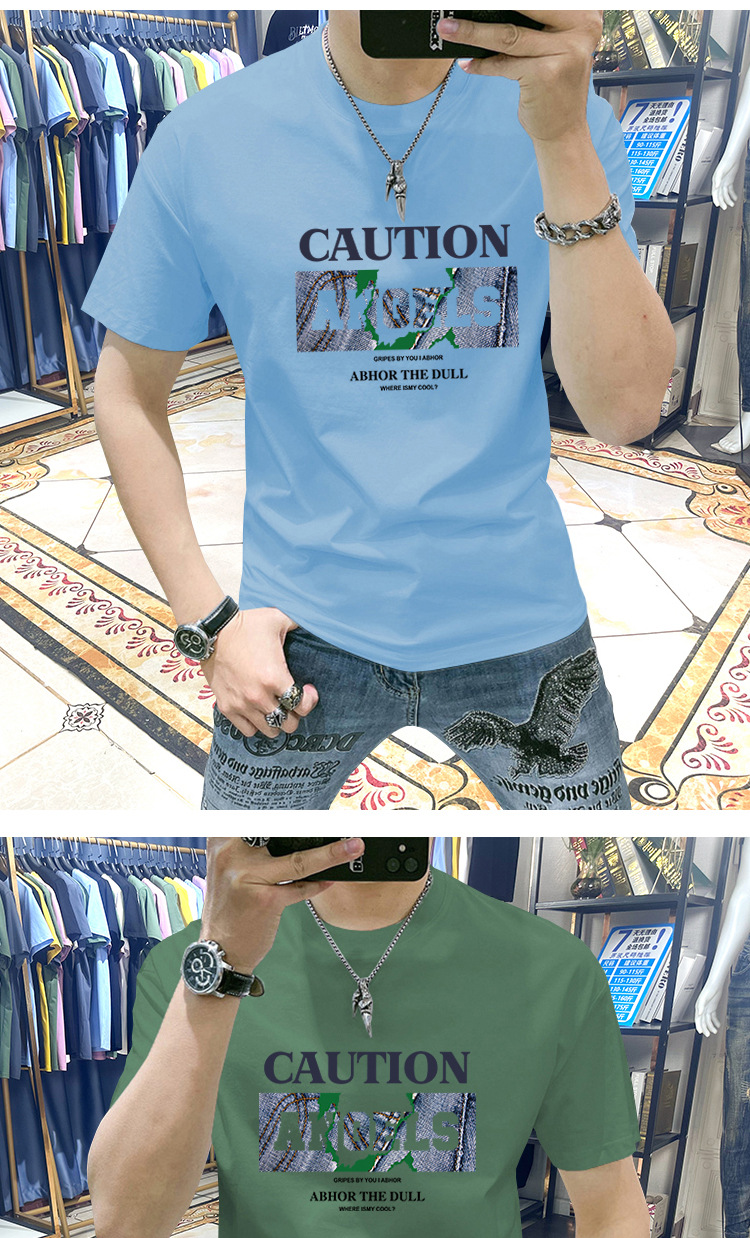 남성용 티셔츠 반팔 2023 New 데님 레터 프린트 슬림핏 잘생긴 슬림핏 탑 남성용 티셔츠스토어 가기
