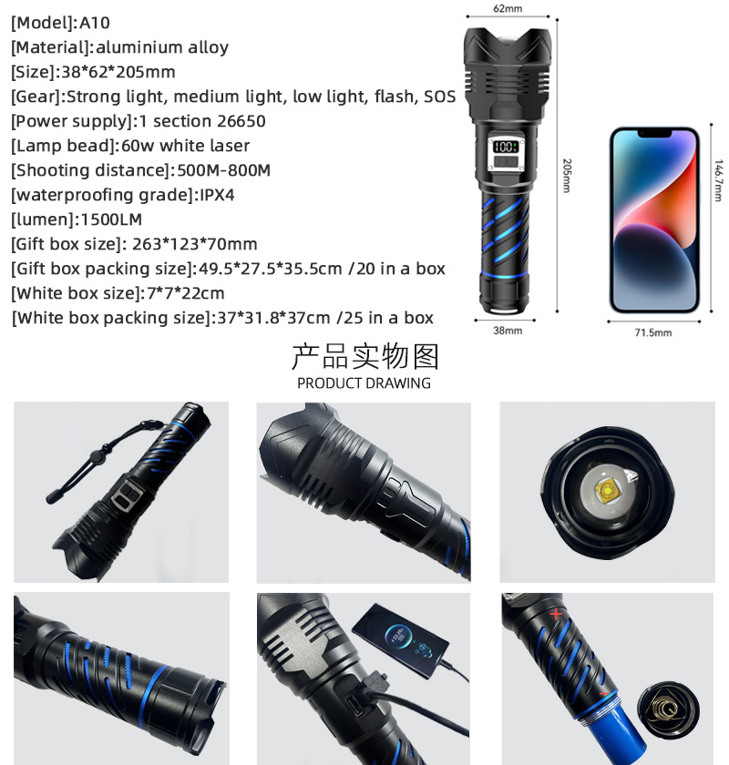 • [절묘한 항공기 상자 포장] A10-60w 백색 레이저 심지 + 26650 배터리 5000mah + type-c 데이터 케이블