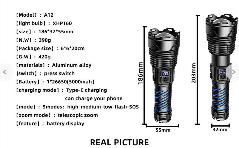 • [선물 상자 세트] A12-P160+26650 5000mah+type-c 데이터 케이블