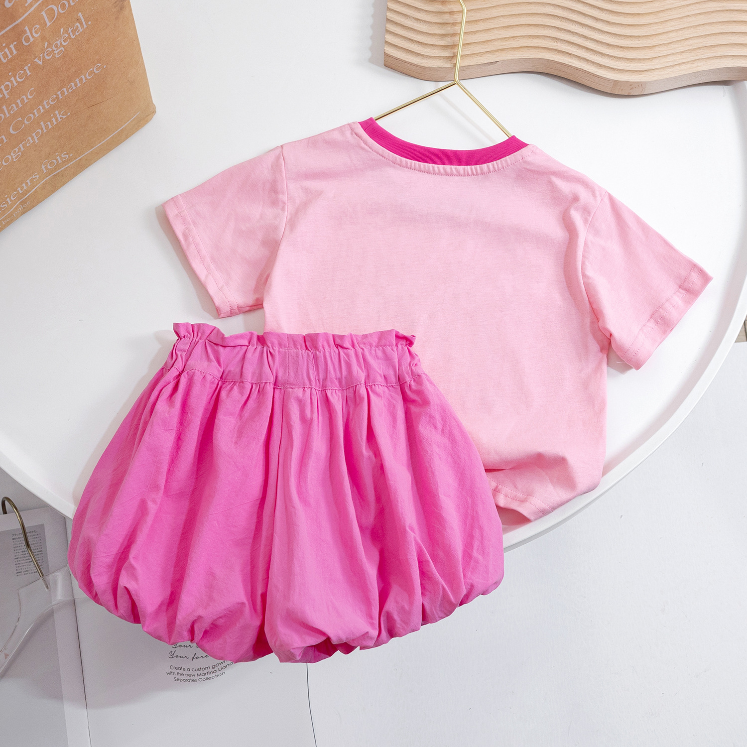 아기 소녀 여름 정장 2025 새로운 여자 한국 스타일 인쇄 반팔 티셔츠 귀여운 꽃 봉오리 바지 투피스 유행 세트