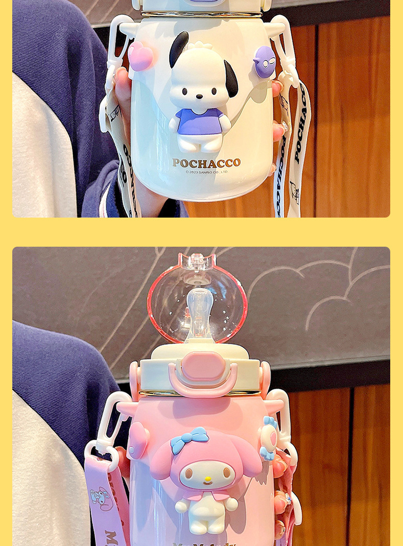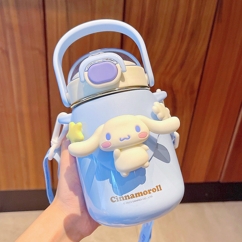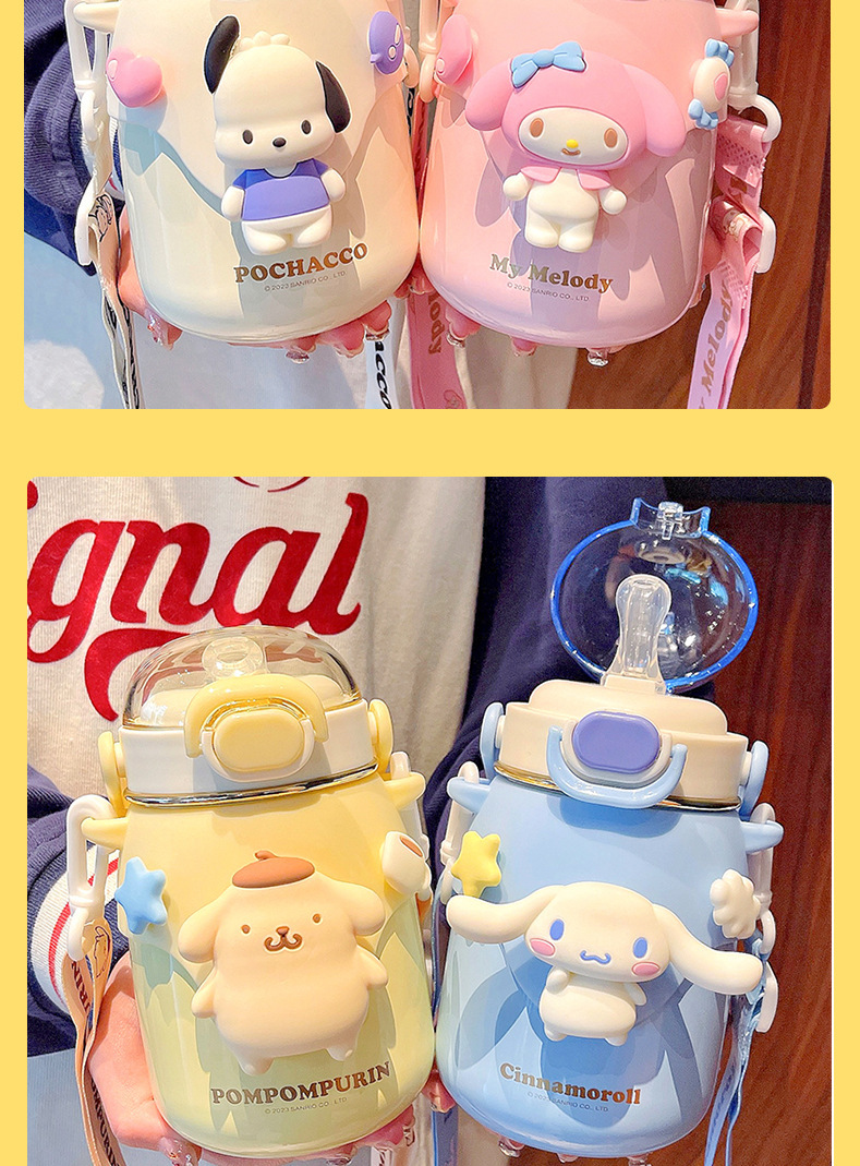 대용량 만화 어린이 보온병 컵 하이 컬러 값 산리오 스트랩 배꼽 빨대 컵 야외 크로스 바디 마시는 주전자