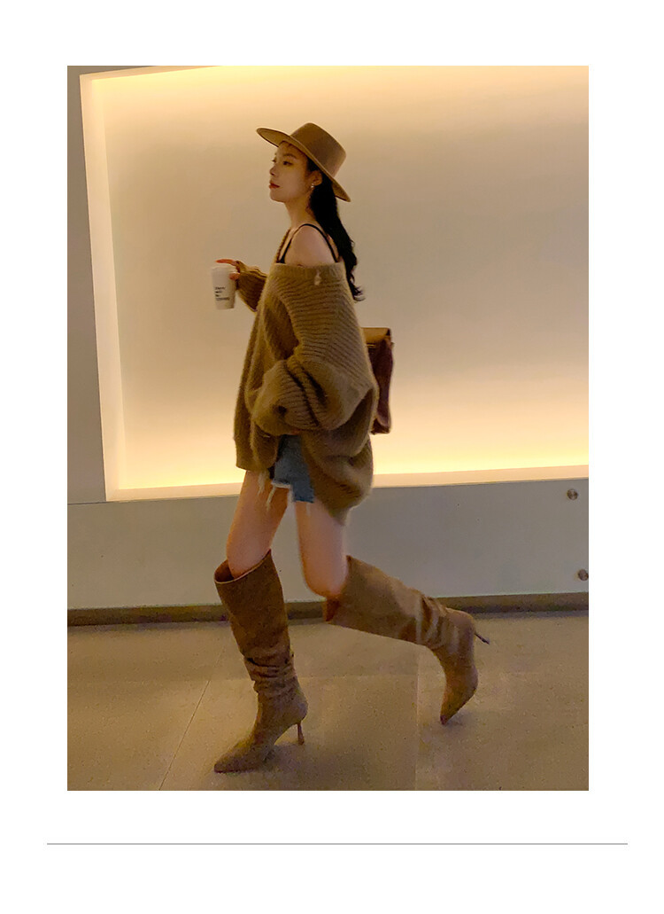 큰 튜브 둘레 더미 부츠 지적 발가락 부츠 여성 대형 스틸레토 하이 부츠 하이힐 두꺼운 다리 무릎 위 부츠스토어 가기