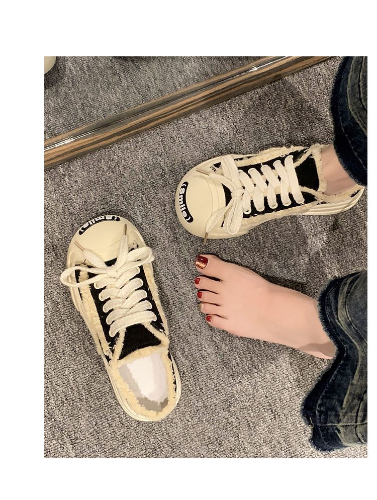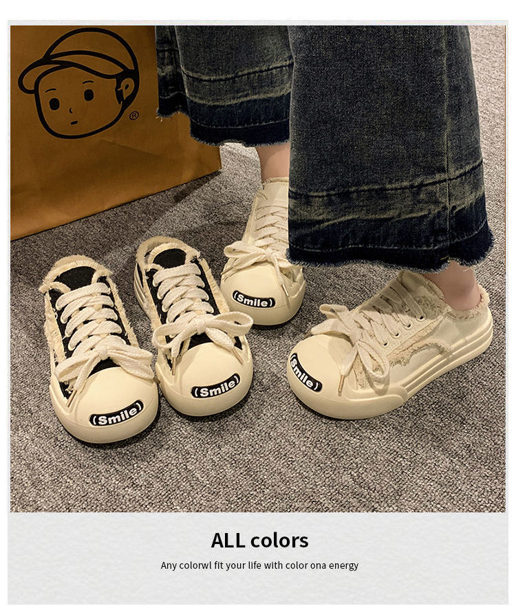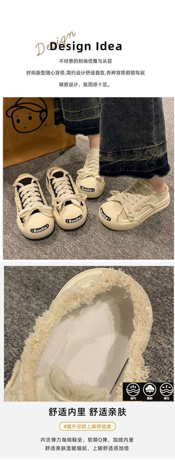 여성을위한 Xiaoxiangfeng 오픈 스마일 캔버스 슬리퍼 2023 여름 새로운 패션 Baotou 하프 슬리퍼 두꺼운 밑창 캐주얼 보드 신발
