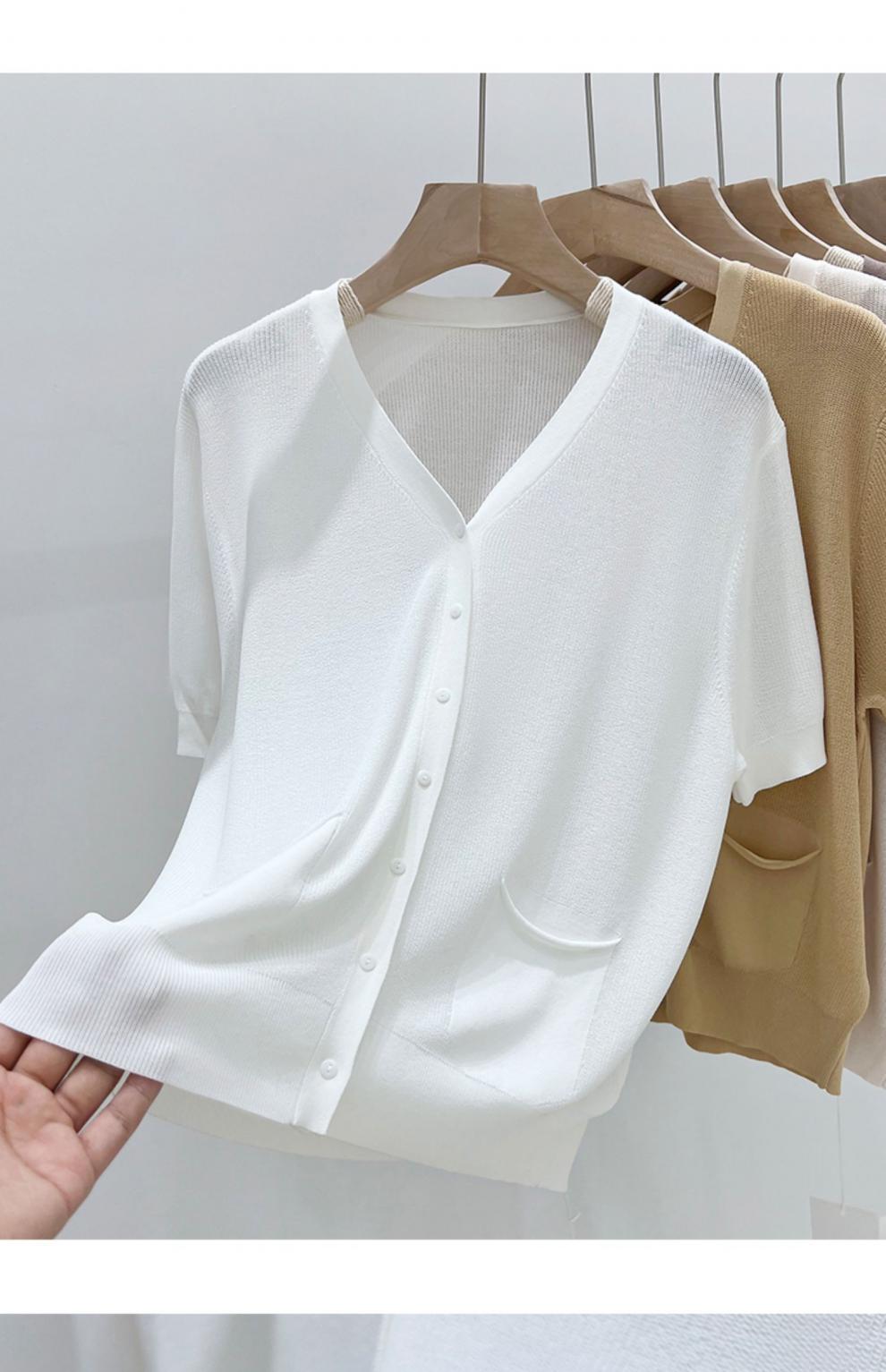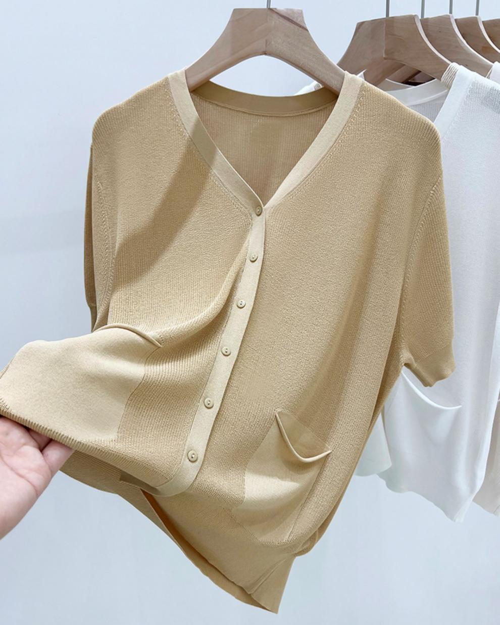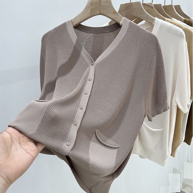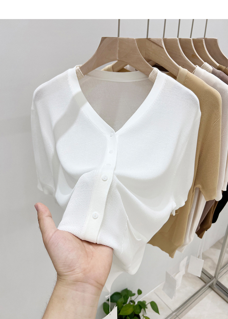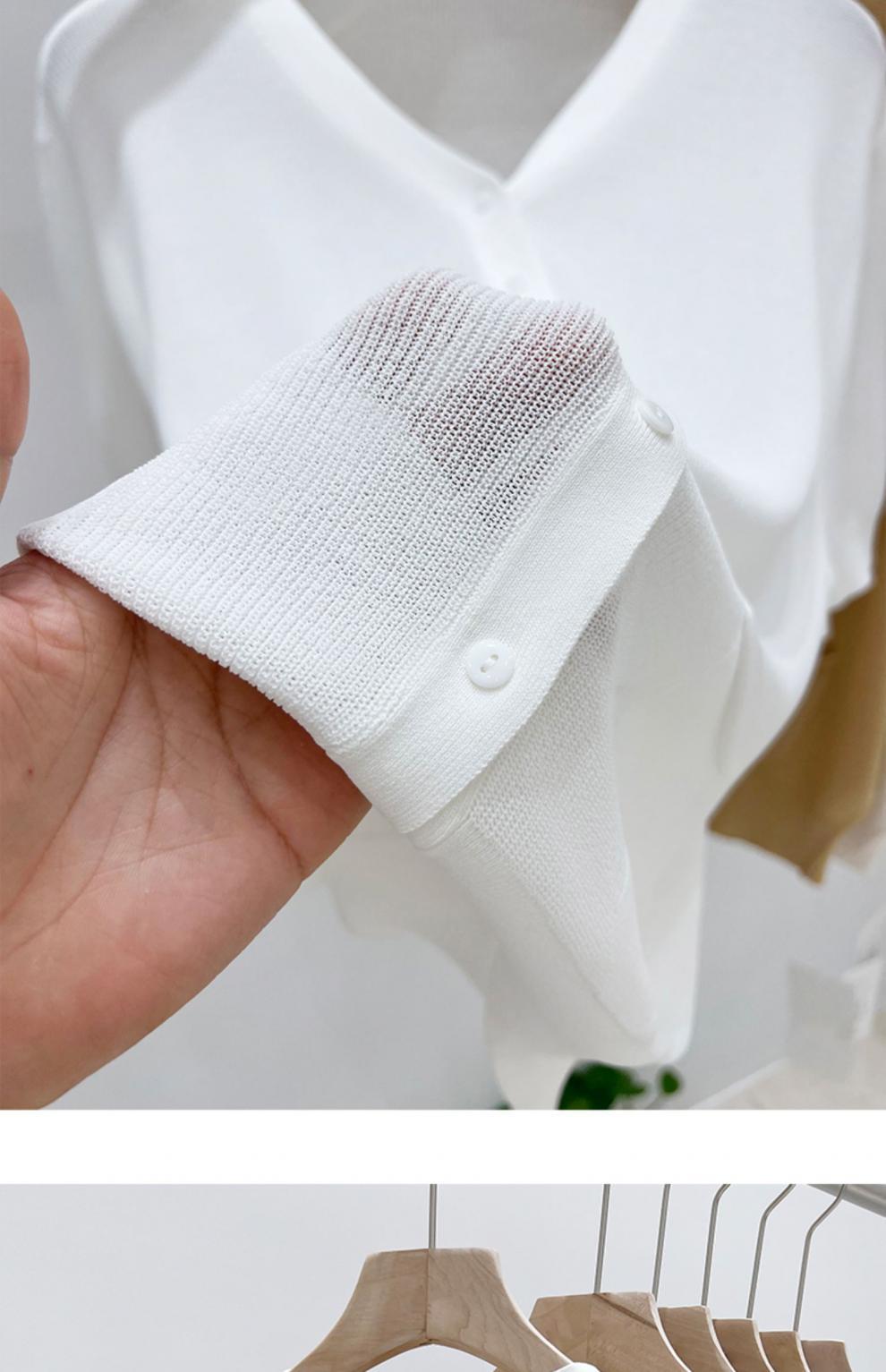 V-넥 반팔 어깨 니트 가짜 가디건 여성용 여름 얇은 탑 2023 새로운 느슨한 슬림 셔츠