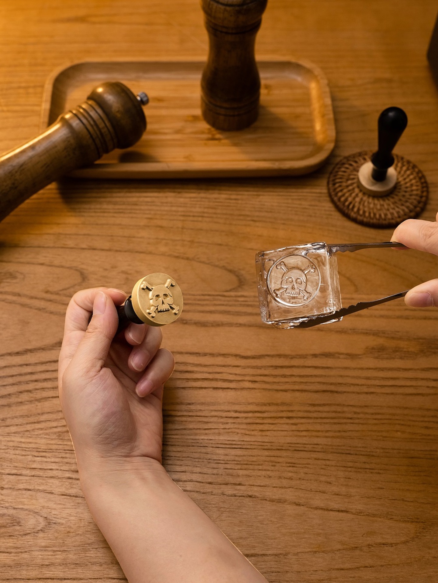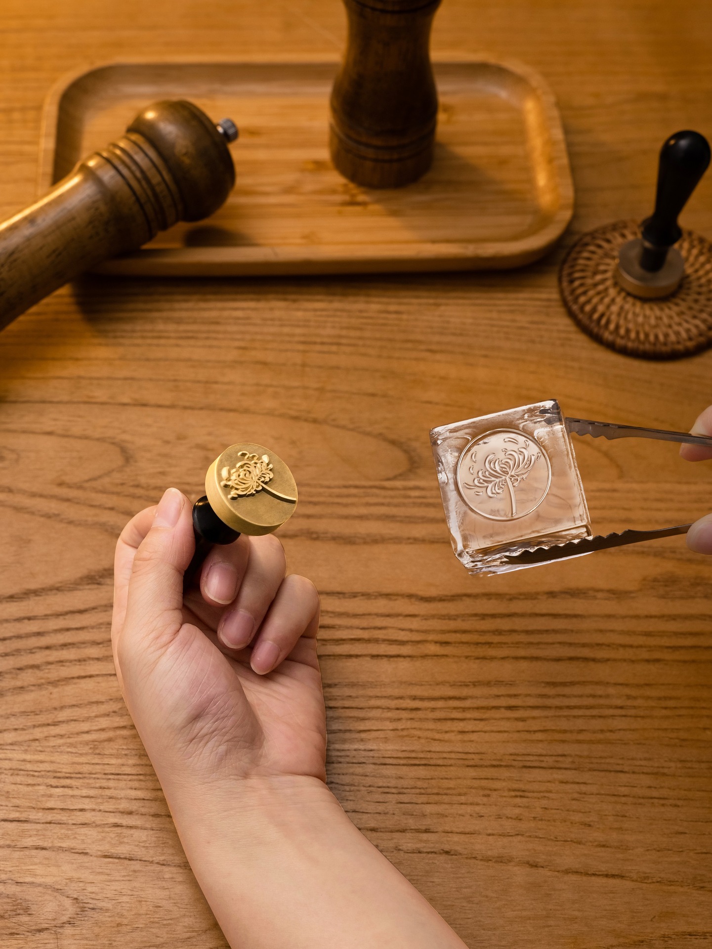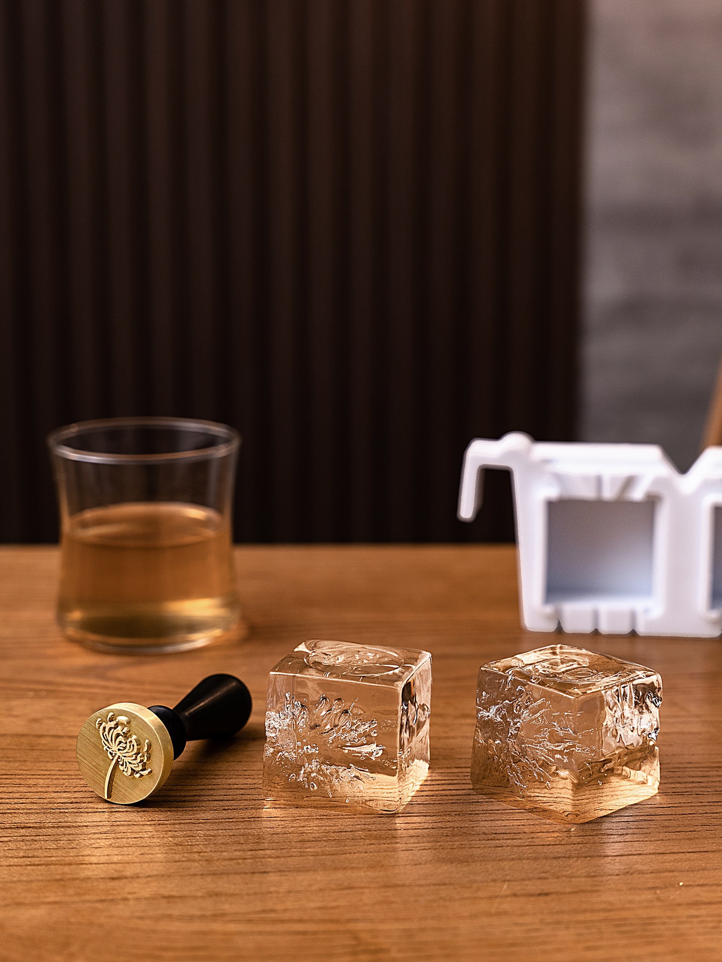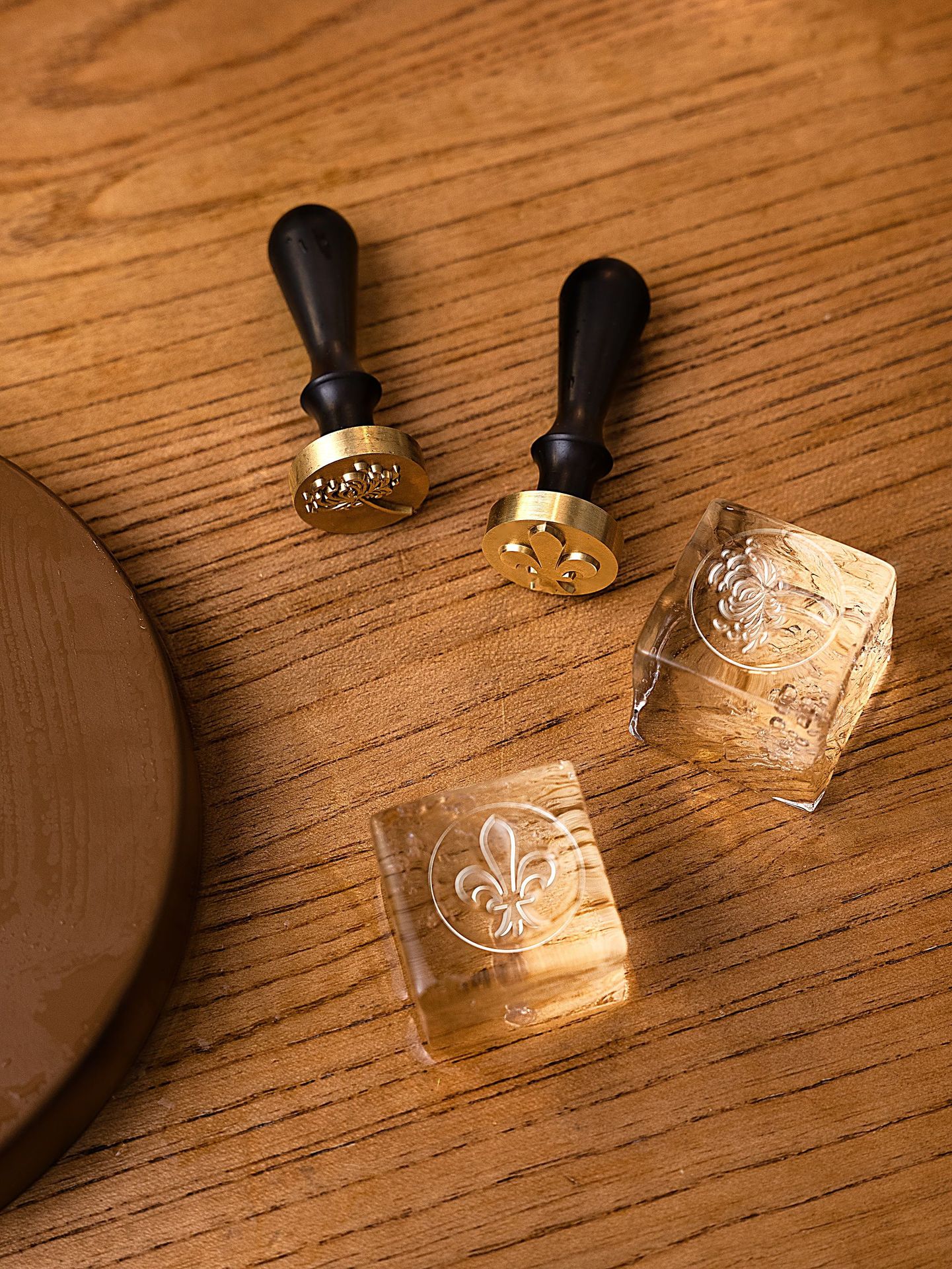 LFGB 3CM 식품 등급 아이스 큐브 케이크 스탬프 아이리스 플라워 퍼플 색상의 히노키 나무 손잡이 아이스 큐브 스탬프스토어 가기