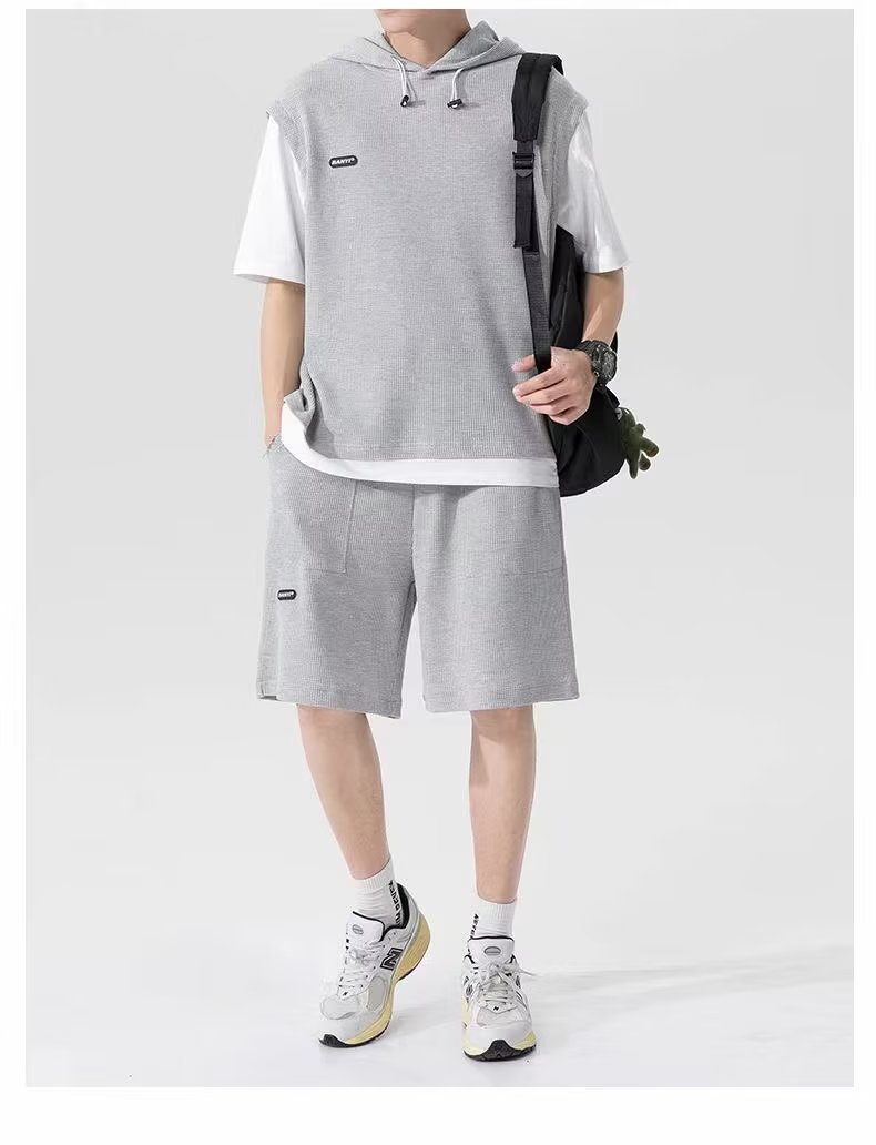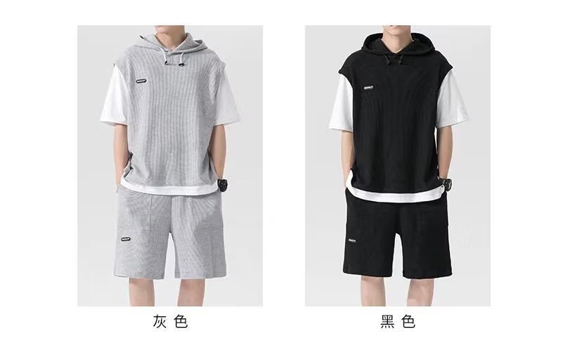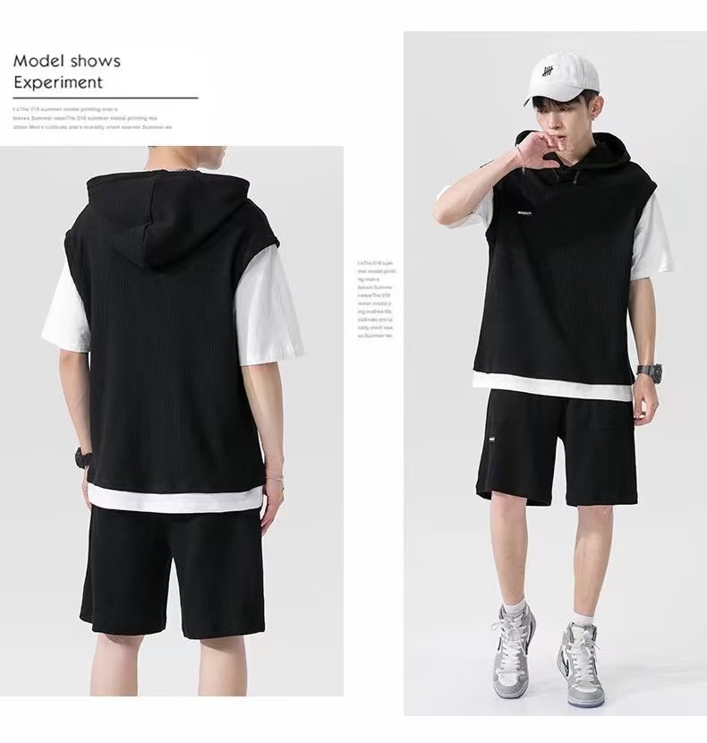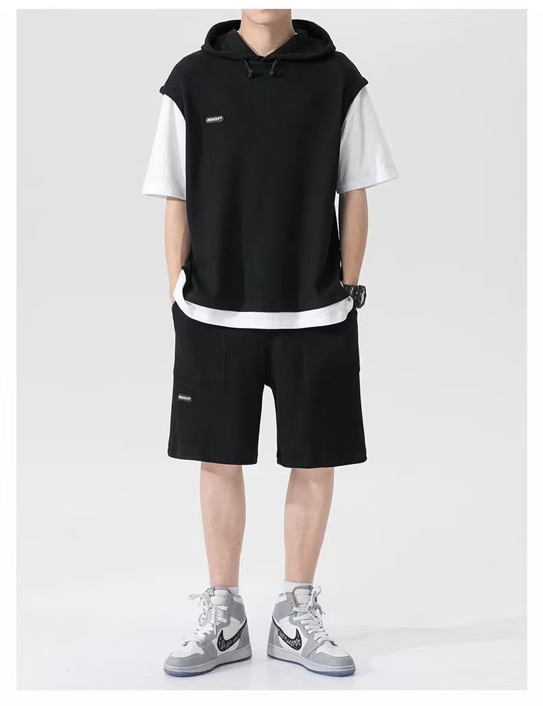 가짜 2 피스 와플 반팔 스포츠 세트 남자 봄과 여름 후드 티셔츠 반바지 2 피스 잘 생긴 남자 의류 세트