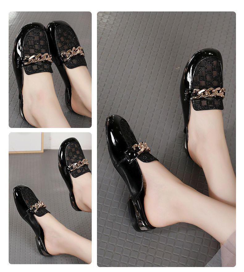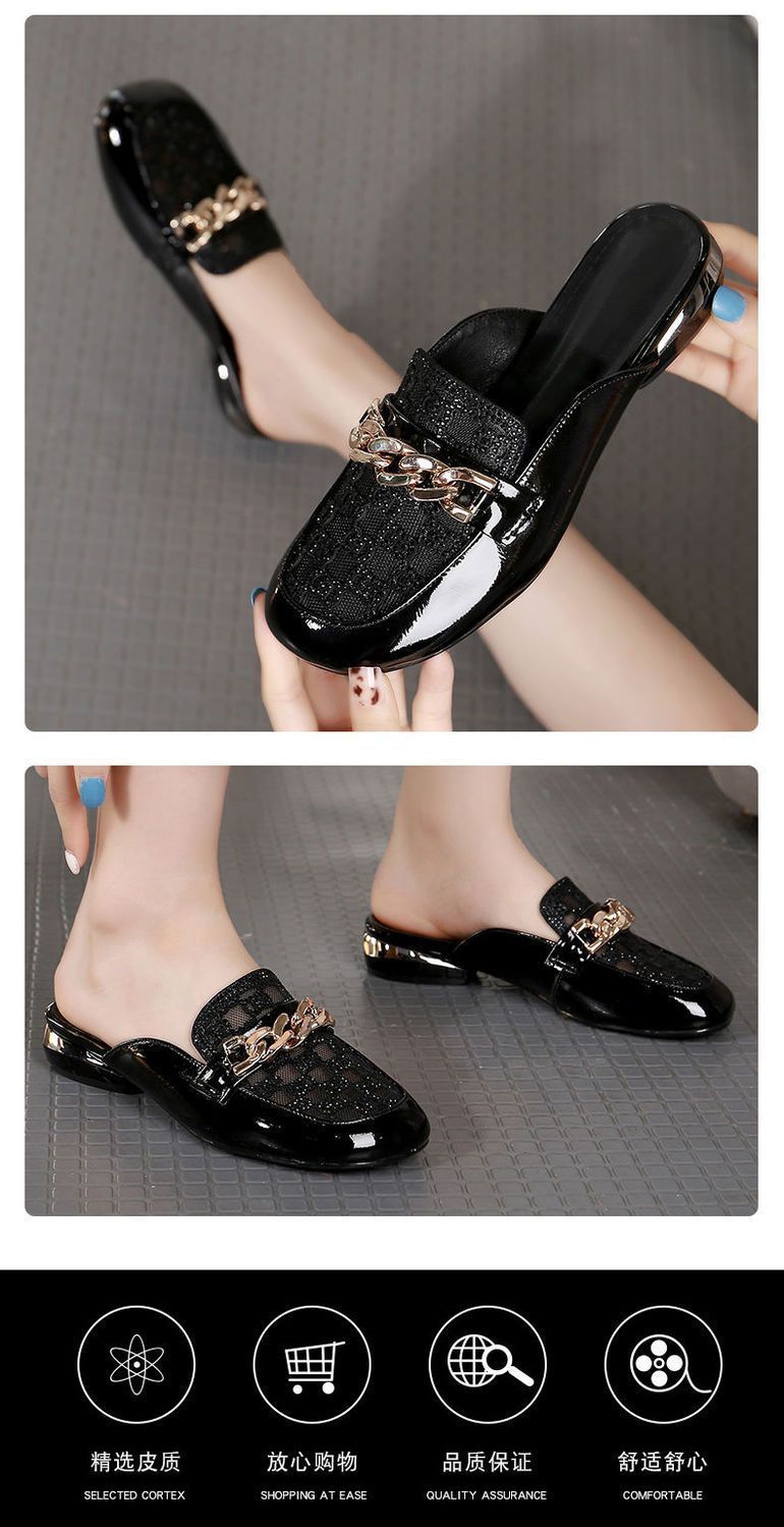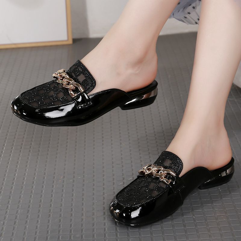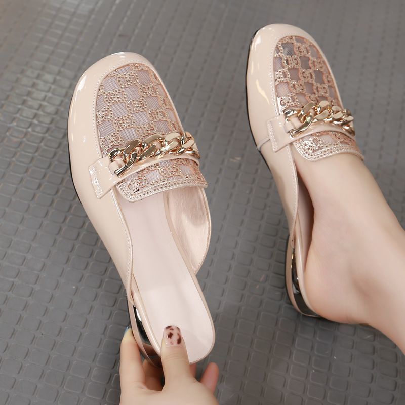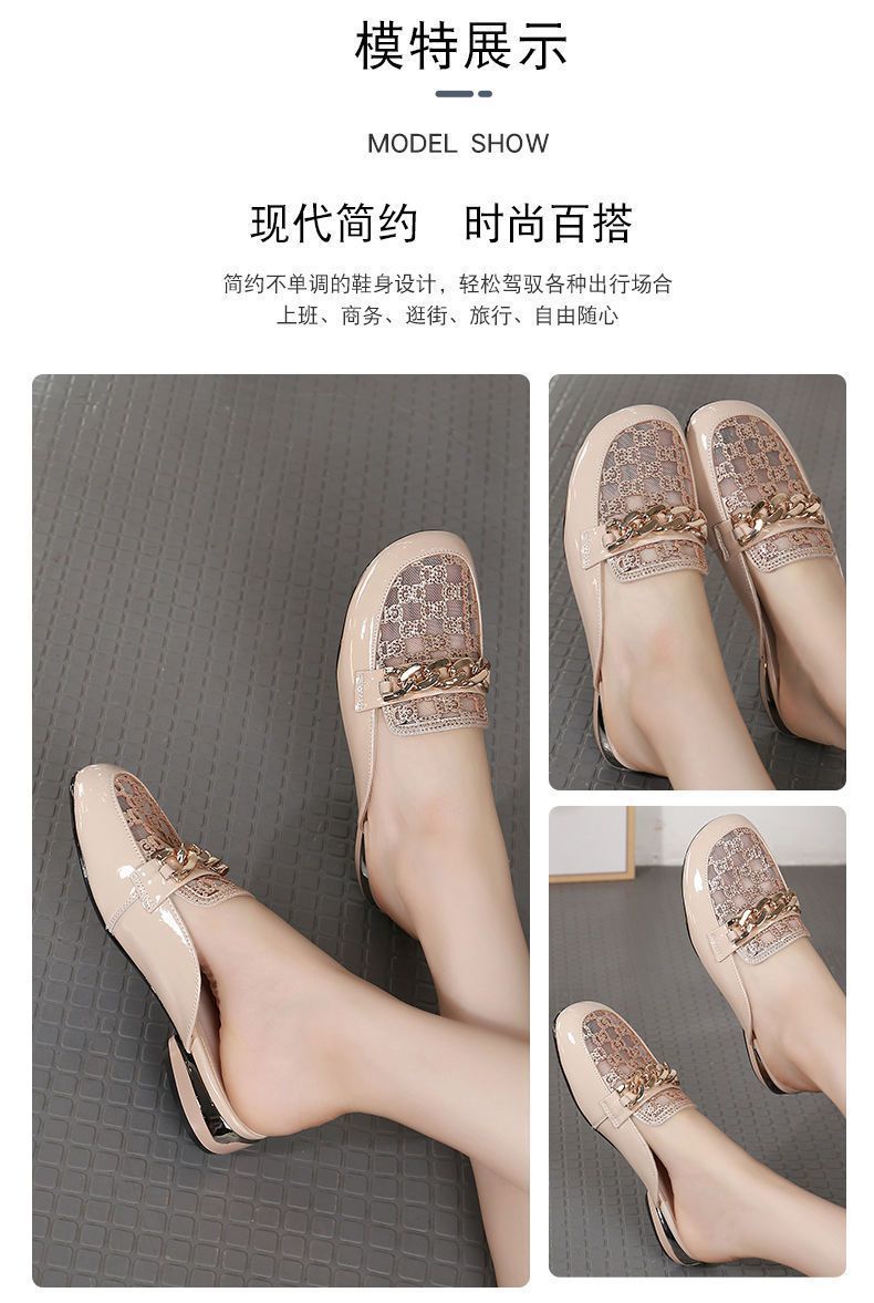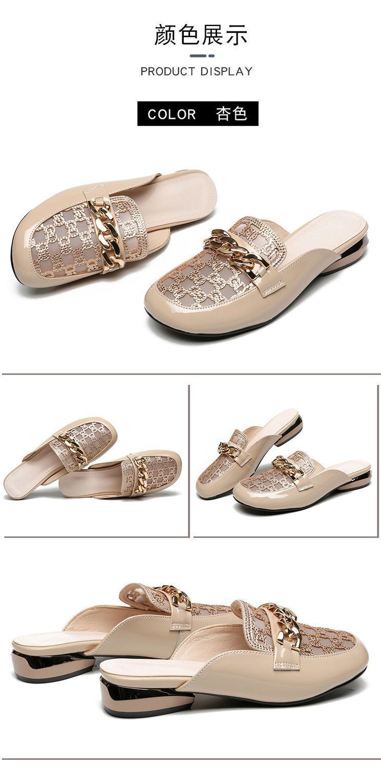 여성용 부드러운 가죽 슬리퍼 대형 2023 봄 여름 패션 다용도 플랫 바닥 두꺼운 굽 발가락 반 슬리퍼 외출 샌들 중공스토어 가기