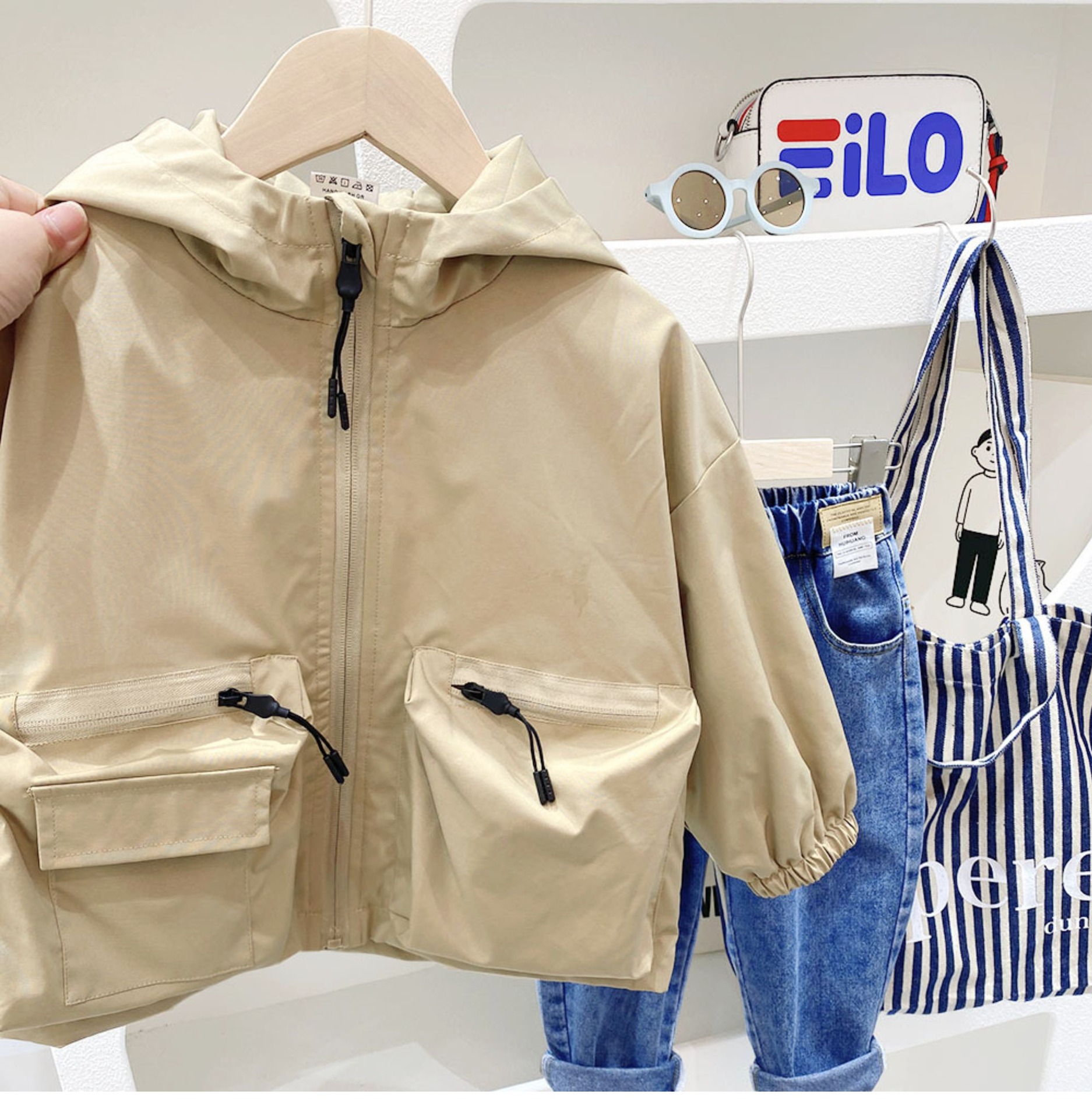 소년 코트 2023 봄과 가을 소년을위한 새로운 아동복 중간 및 큰 어린이 작업 후드 코트 어린이 러쉬 의류스토어 가기