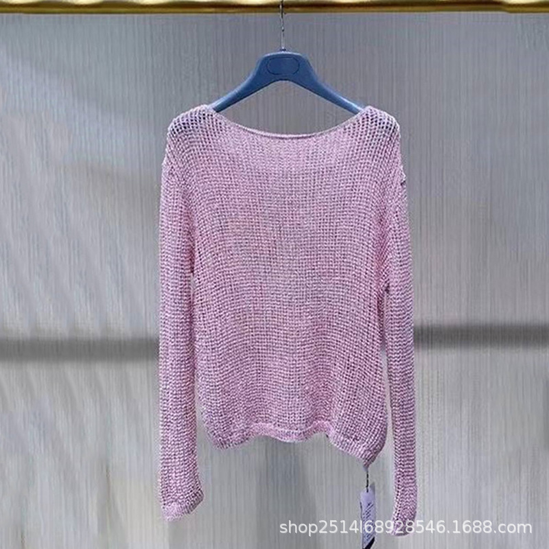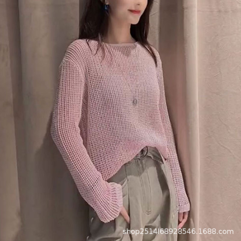 Ge의 쇼핑몰 새로운 2024 봄, 가을 라운드 넥 밝은 실크 느슨한 중공 얇은 긴팔 스웨터 여성상의
