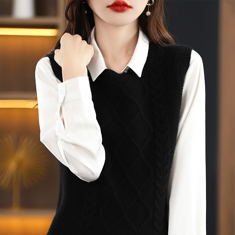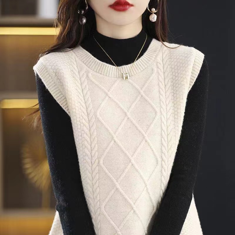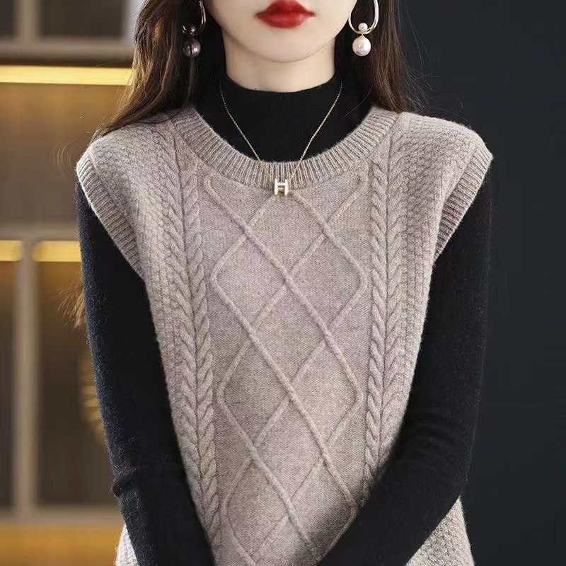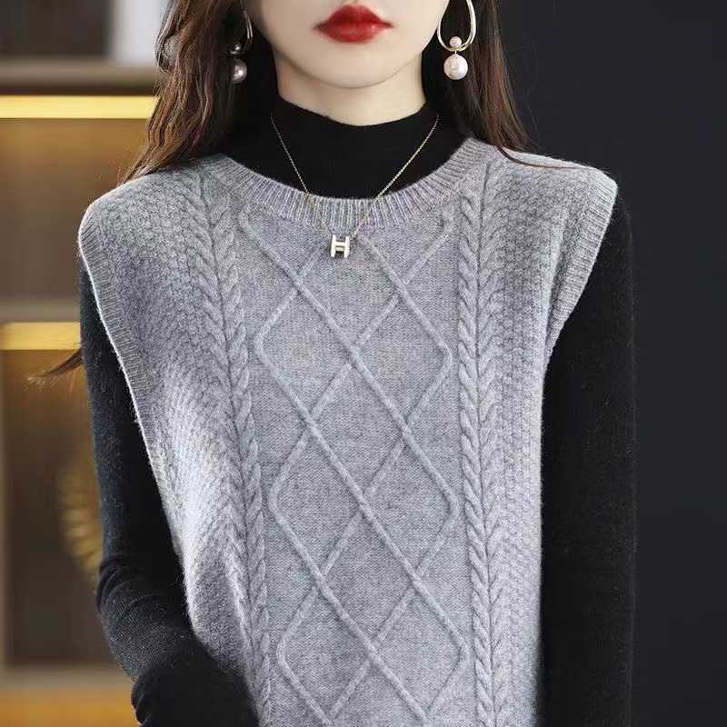 2023 가을과 겨울 새로운 느슨한 트위스트 자카드 조끼 크루넥 터틀넥 조끼 여성용 슬릿 스웨터스토어 가기